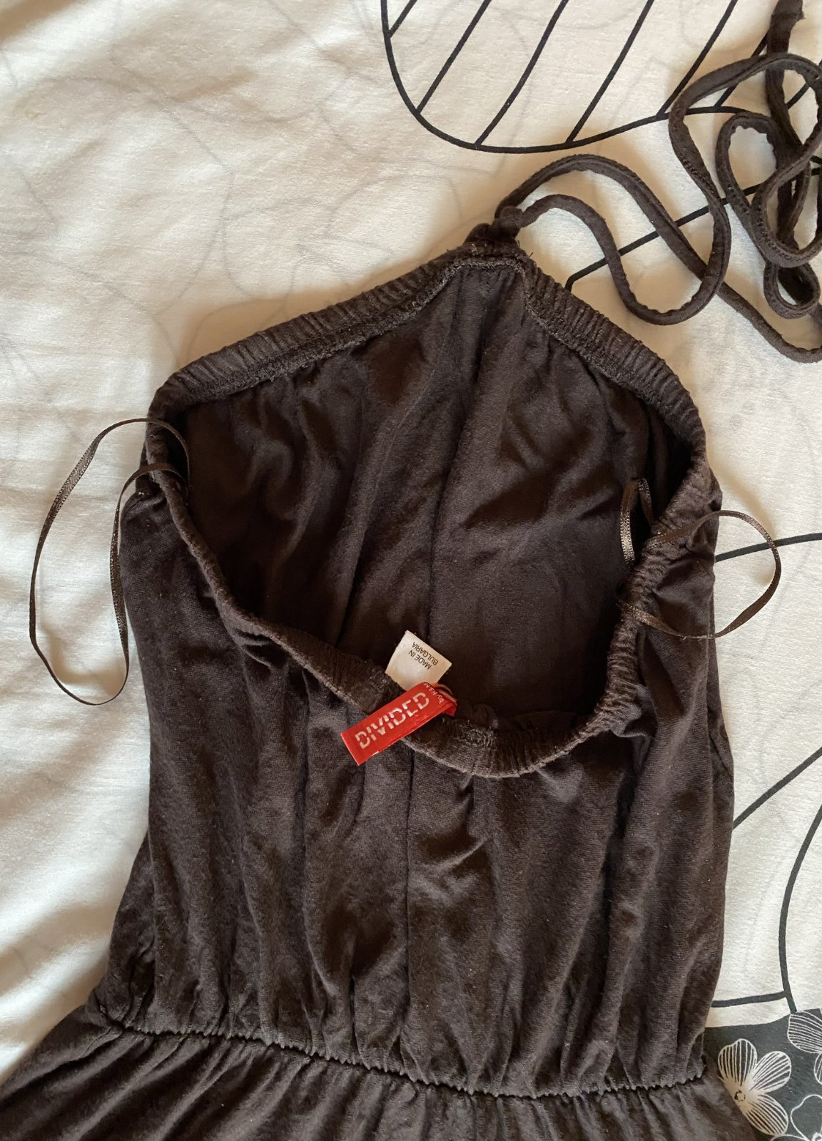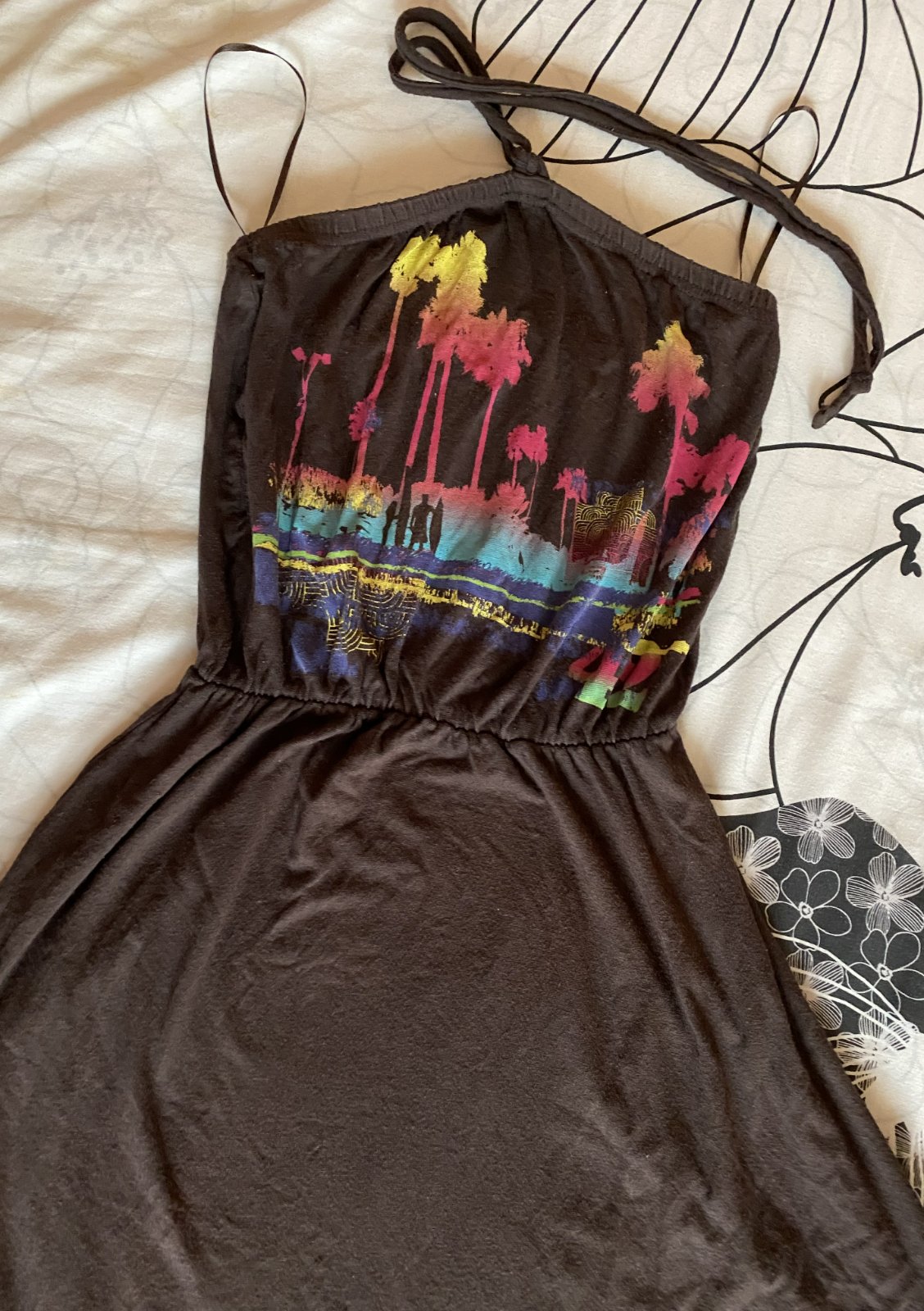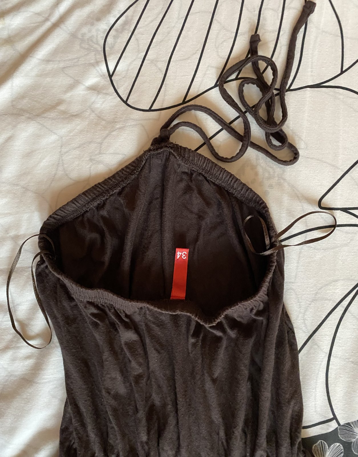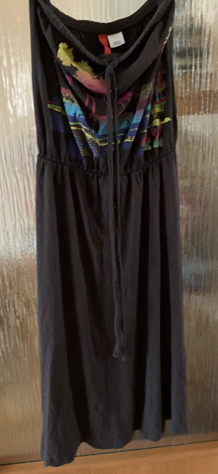 Letné šaty s aplikáciou zn. H&M v. 34, prispôsobivý materiál - 95% polyamid, 5% elastan pekná hnedá farba s aplikáciou, uväzovanie okolo krku, v dobrom nosenom stave. Miery: dĺžka vpredu cez stred: 85cm, bočná dĺžka: 80cm, v mieste strihu - gumička: 23-45cm.