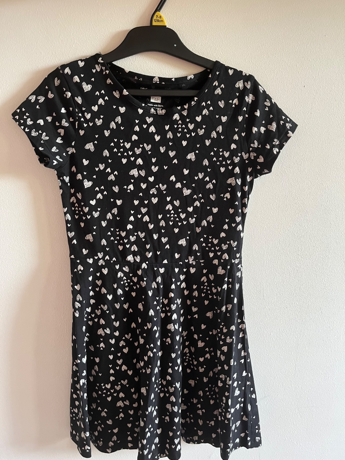 Krásne jednoduché bavlnené čierne šaty s bielymi srdiečkami s krátkym rukávom. Prestrihnuté v páse. Šírka cez prsia 2 x 40 cm, celková dĺžka 77 cm. TOP stav bez poškodení. Poštovné 1,50 € alebo pod...