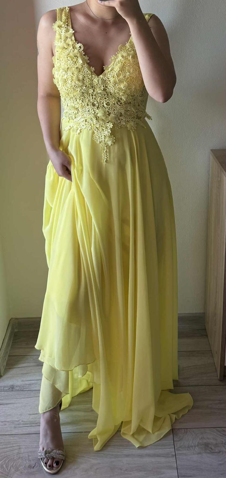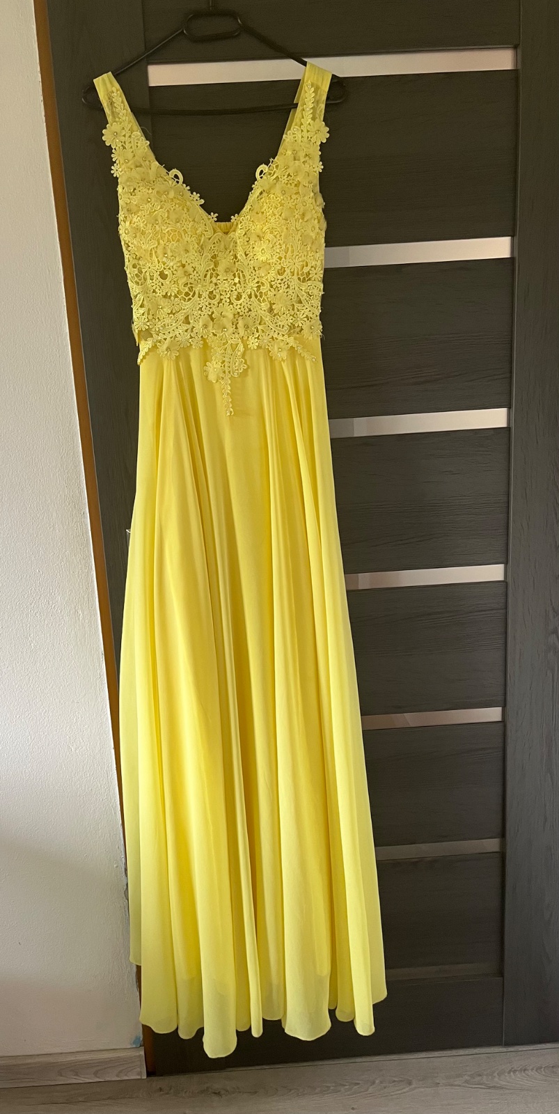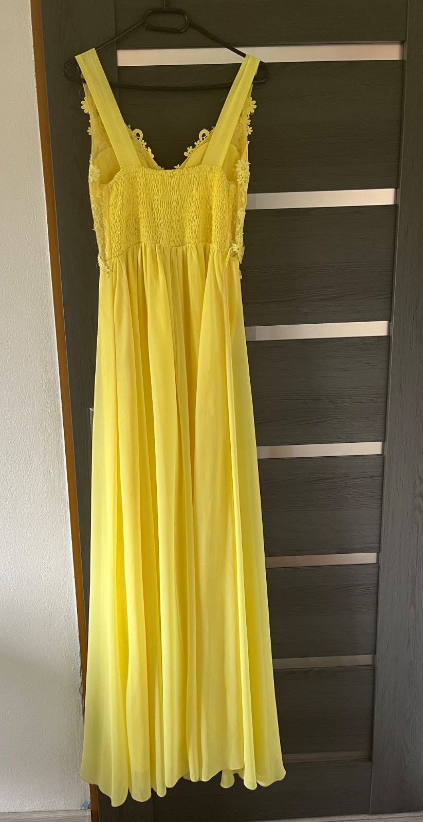 Ponúkam na predaj žlté šaty. Raz oblečené, vyčistené, bez chýb. Sú podšité, nepresvitajú. V prsiach sú vypchávky. Vzadu majú gumičku, čiže sa prispôsobia, povolia.