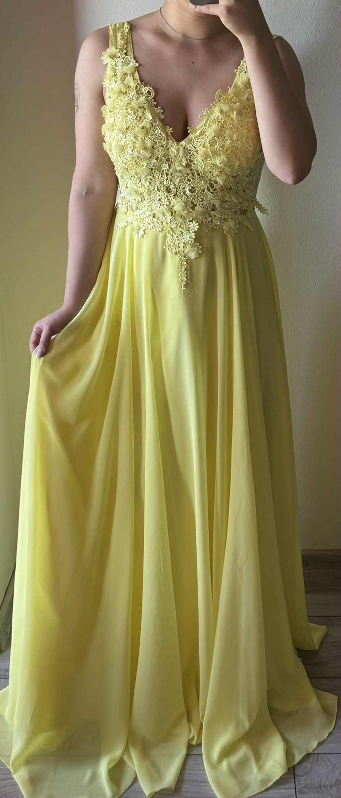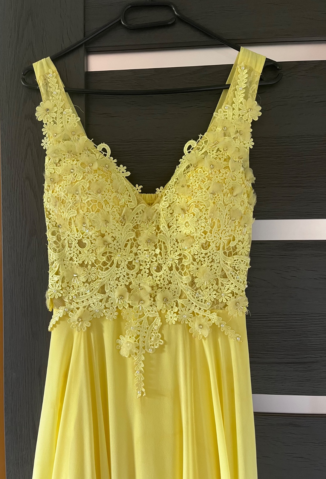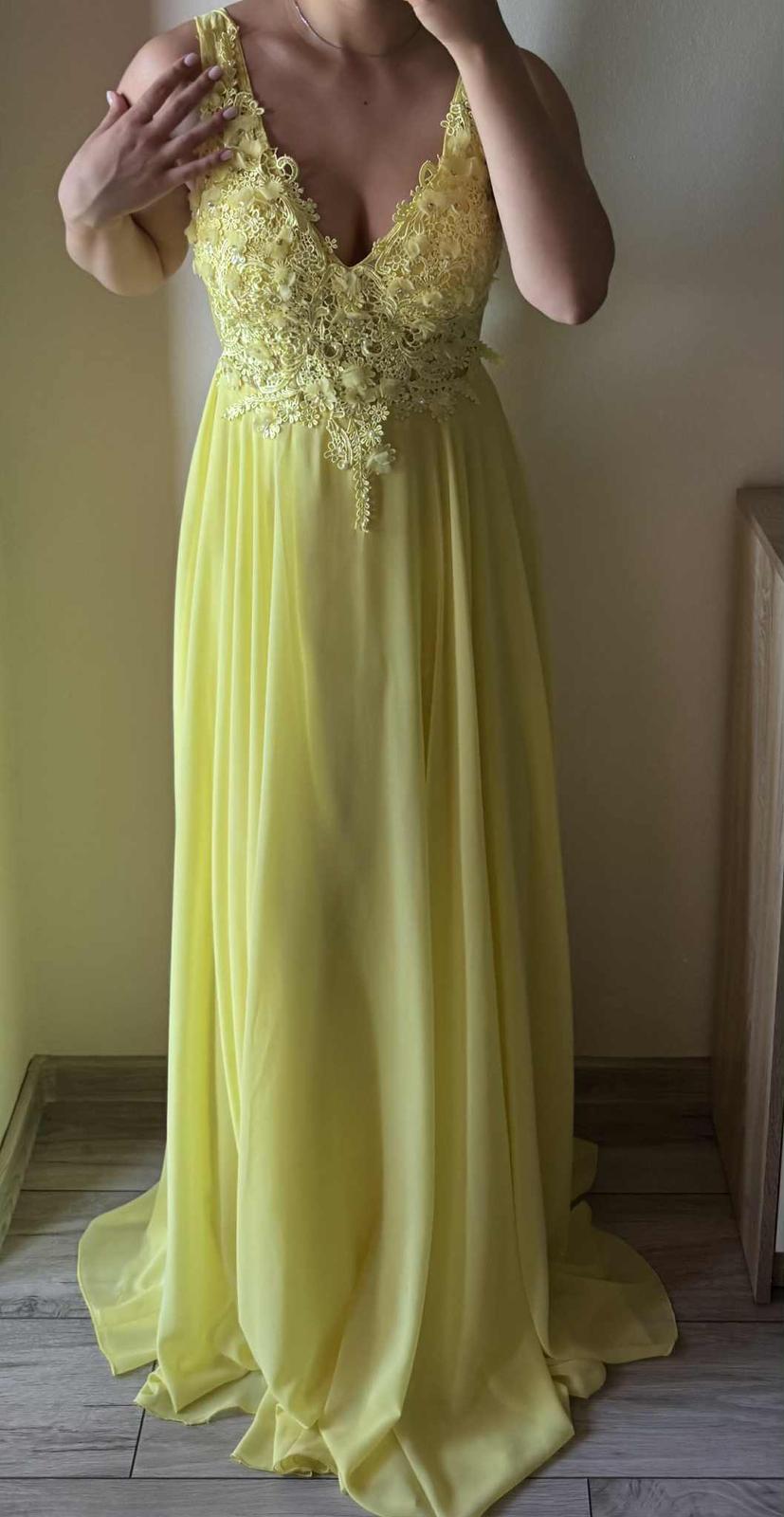 Ponúkam na predaj žlté šaty. Raz oblečené, vyčistené, bez chýb. Sú podšité, nepresvitajú. V prsiach sú vypchávky. Vzadu majú gumičku, čiže sa prispôsobia, povolia.
