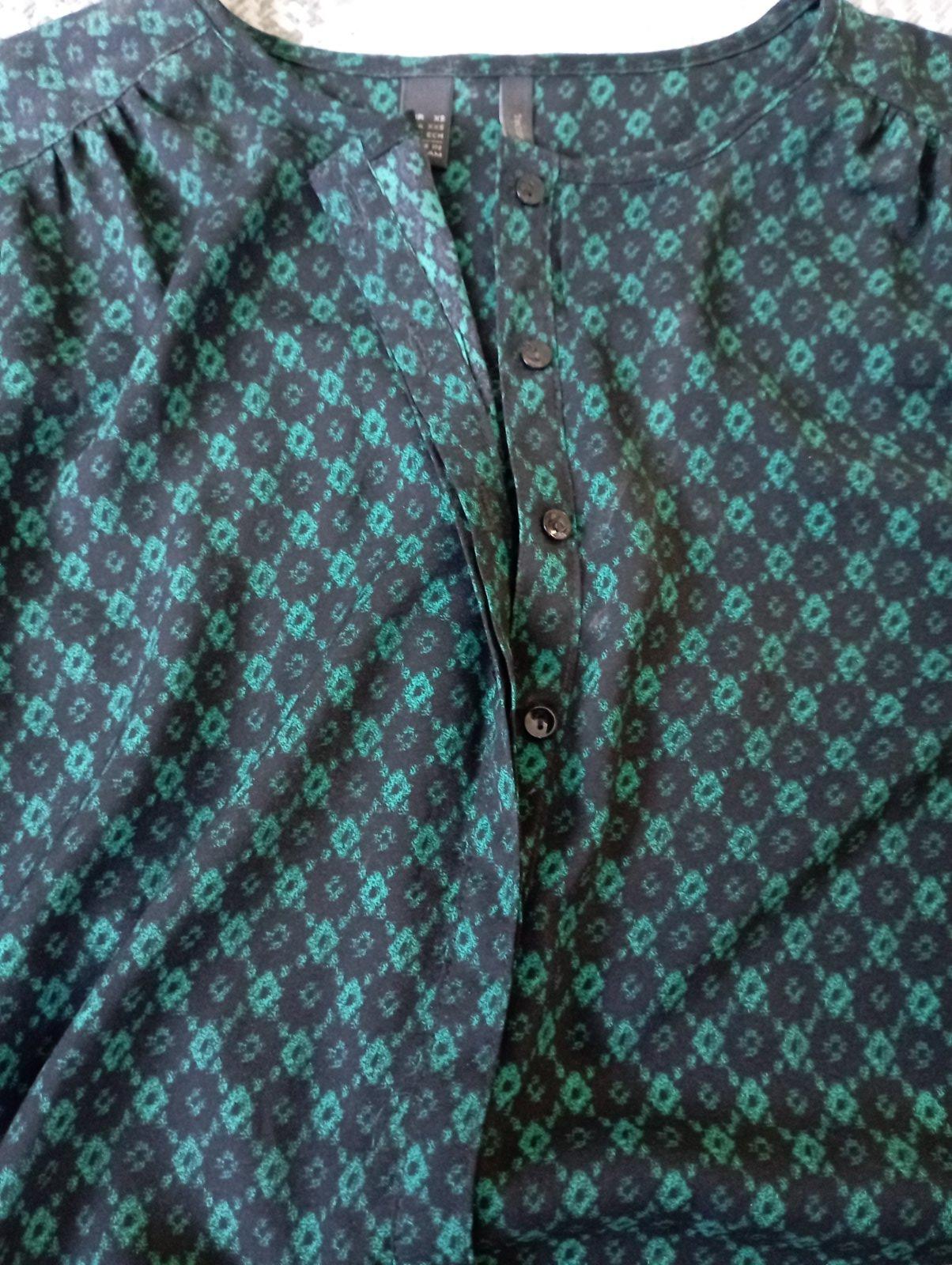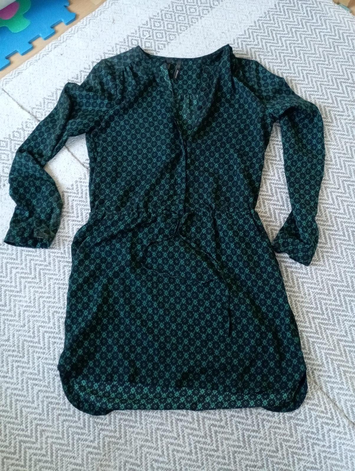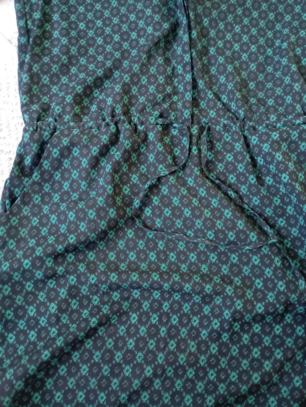 Dámske šaty s vreckami, v páse šnúrka, zapínanie ku krku na gombíky, málo nosené, aktuálne sa do nich už nezmestim. Materiál 97 % polyester, 3 % elastan, Dĺžka vpredu 77 cm, dĺžka vzadu 85 cm, šírka pod pazuchami 42 cm, šírka v páse 36 cm