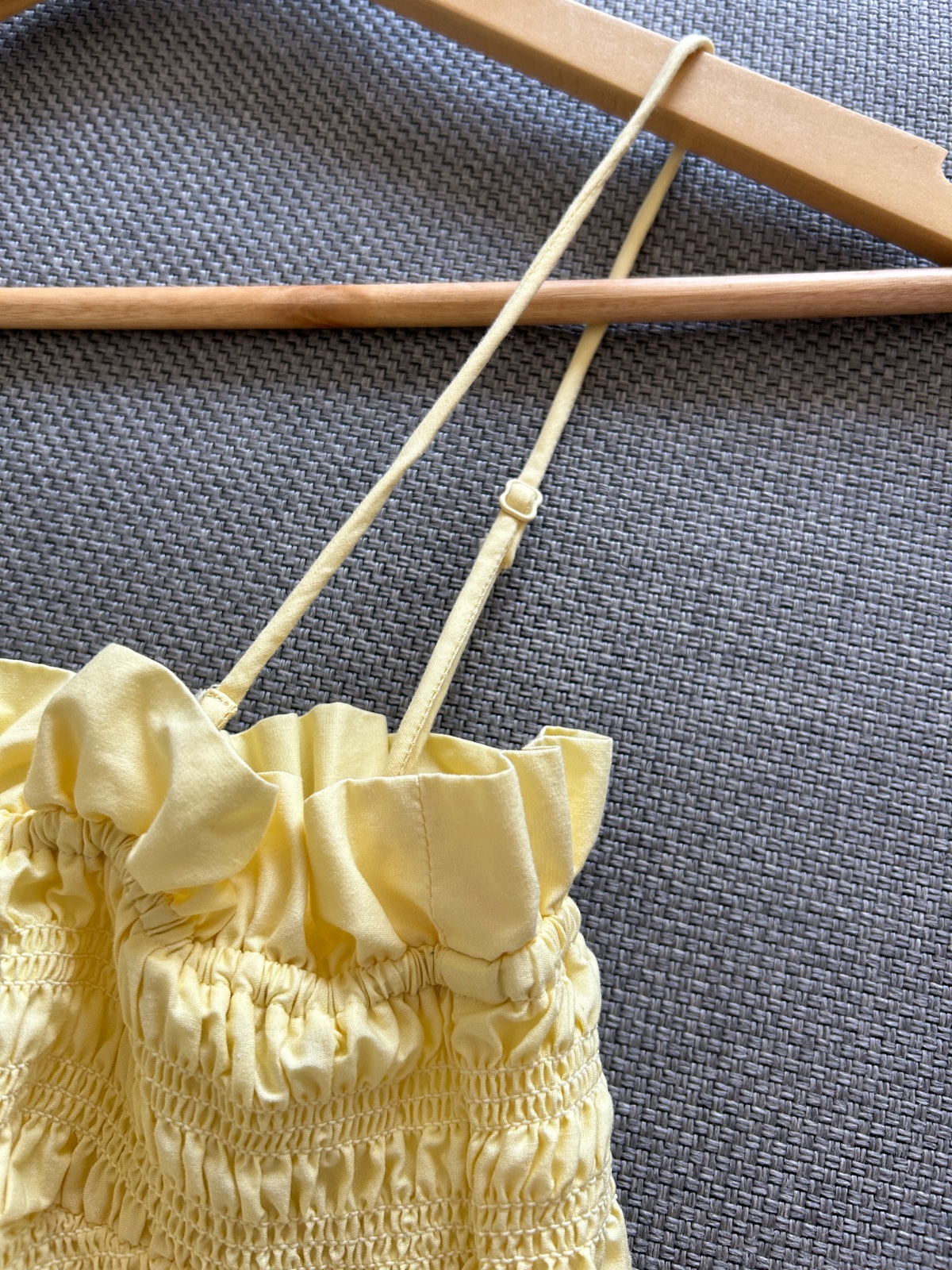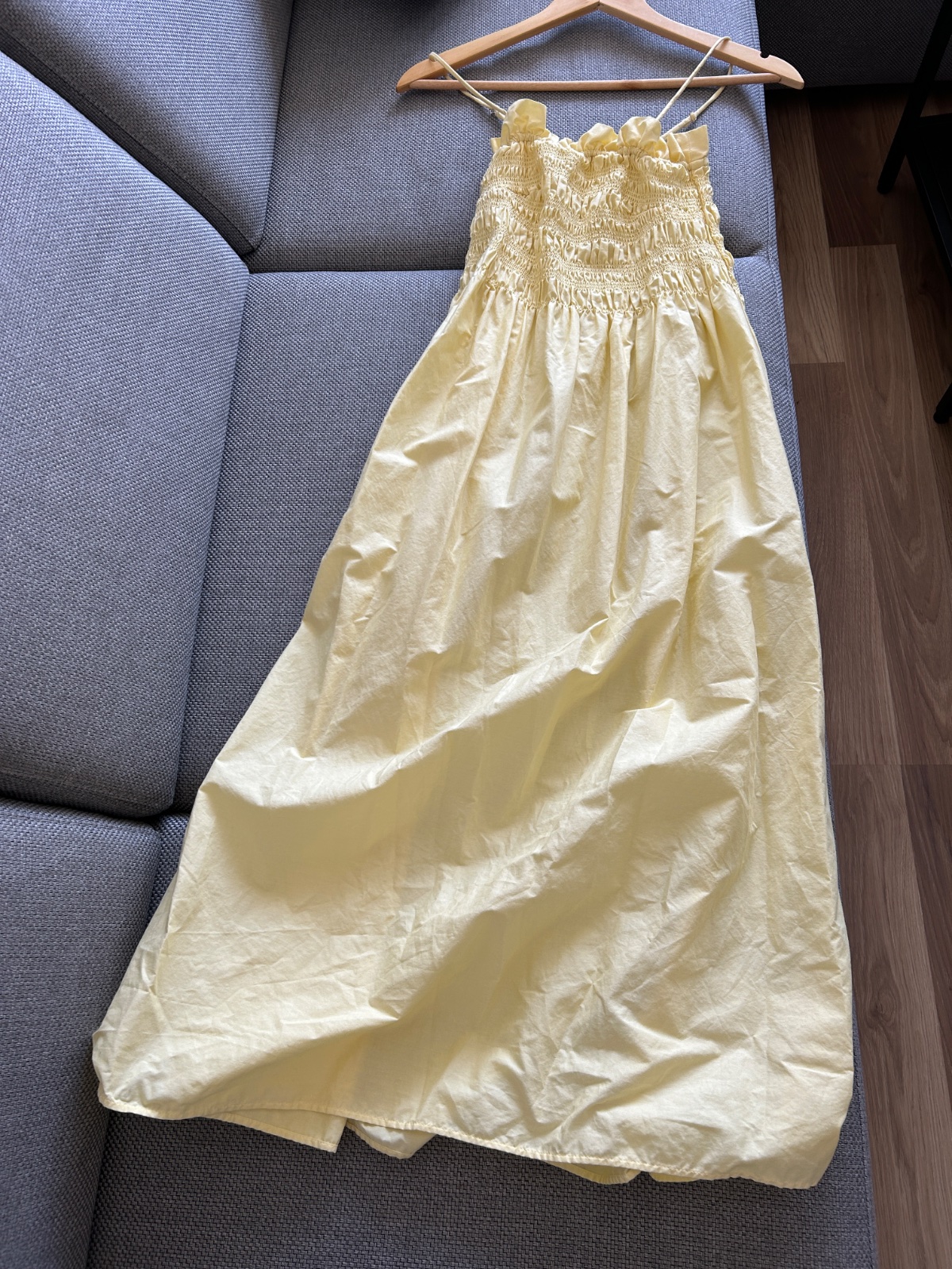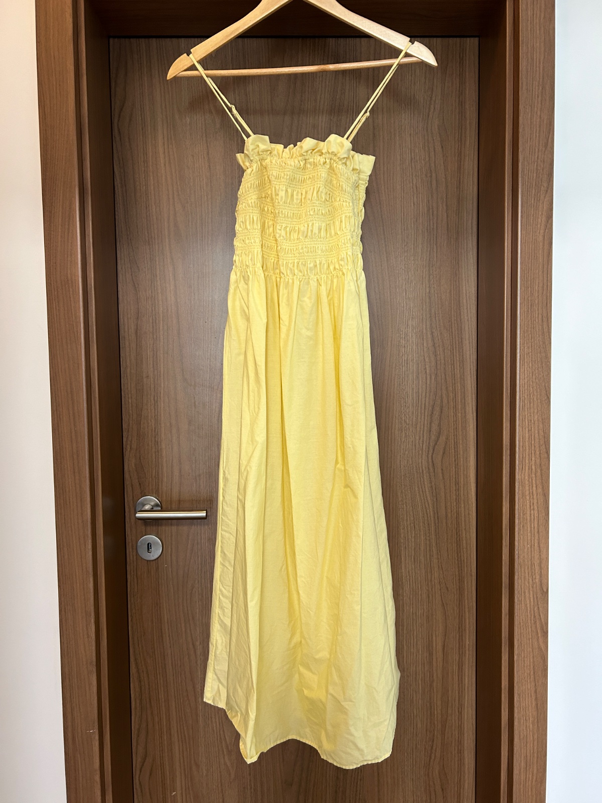 Predam 1x oblecene krasne svetlozlte saty znacky H&M s ozdobnym riasenim. Velkost XS. Dlzka siat bez ramienok je 100 cm. Dlzka ramienok sa da prisposobit (vid foto). Kvalitny material: 100% bavlna.