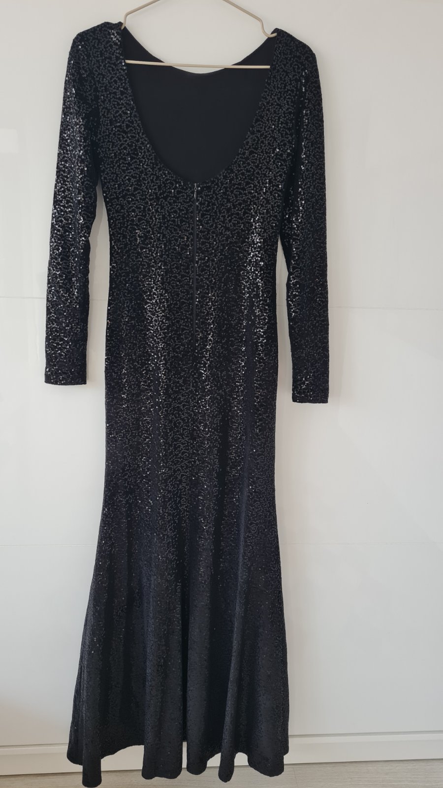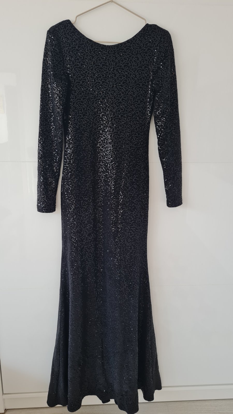 Krásne spoločenské šaty, na štíhlu ženu, sú elastické, základná čierna sa jemne ligoce, ja mám výšku 173cm, oblečené 2x, TOP stav.