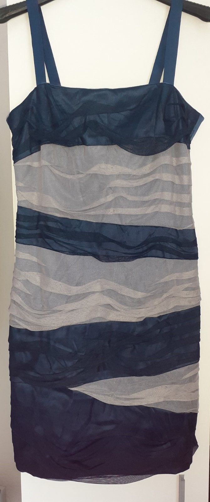 Predám modré koktejlové šaty v tmavomodrej farbe značky BellaMode. Predná časť je sieťovaná - tmavomodrá a sivá farba. Zadná strana je tmavomodrý satén. Boli nosené jeden krát. Sú bezchybné.