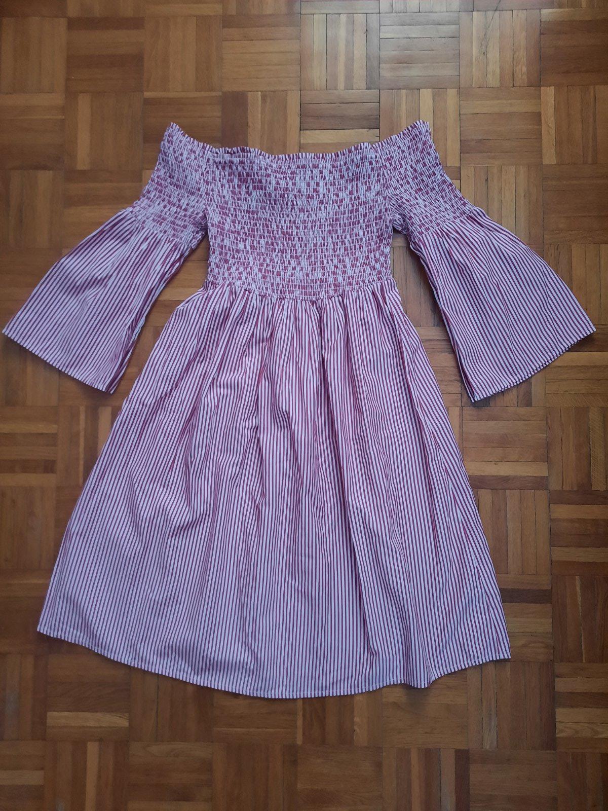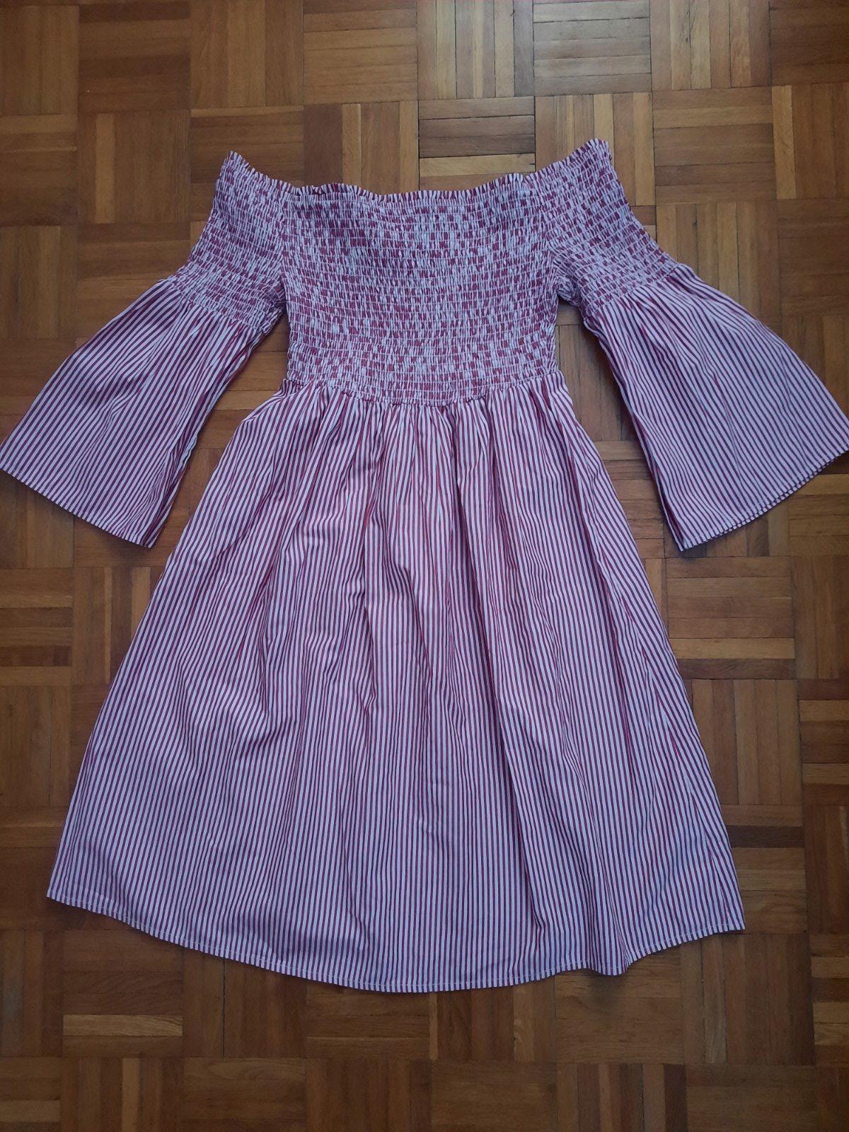 Krásne vzdušné šaty. Dajú sa nosiť na 2 spôsoby-na ramenách alebo spustené z ramien. Okolo poprsia je nariasené gumou-žabkovanie. Rukávy sú zvonové. Šaty sa postupne rozširujú. Vhodné aj pre staršie dievčatá.