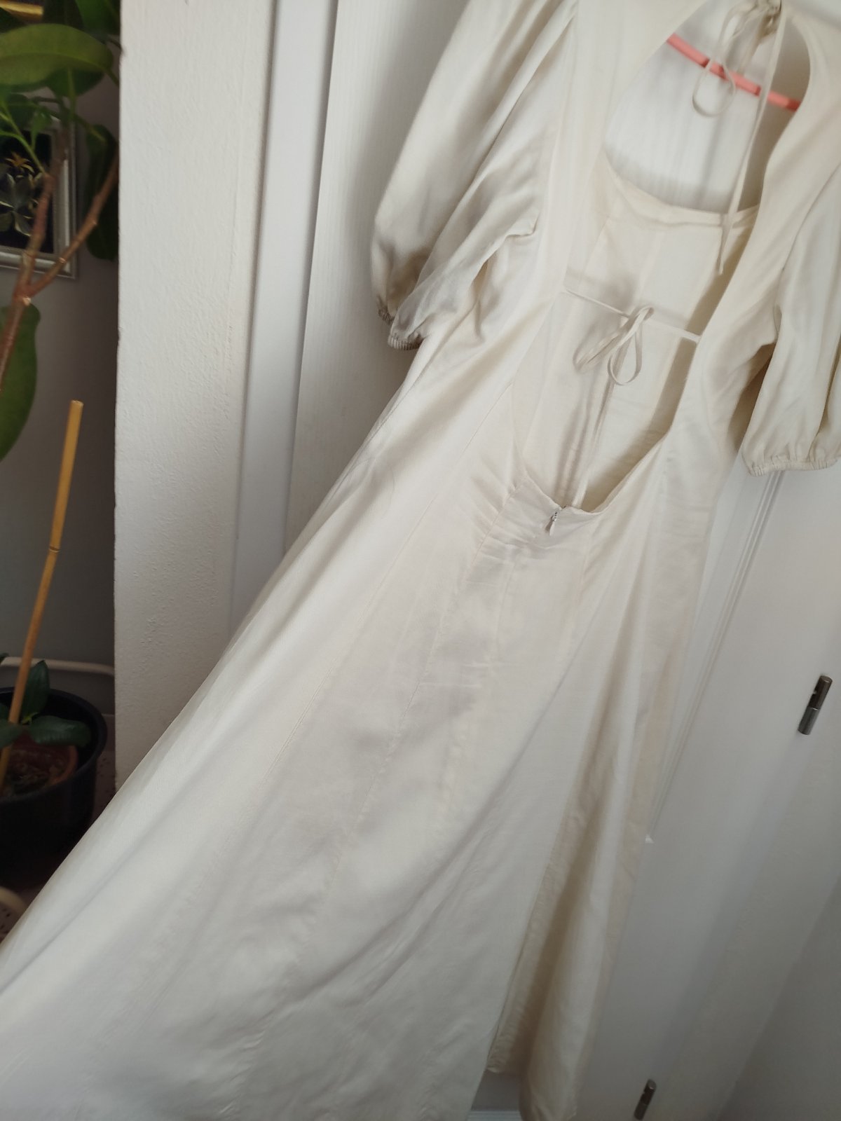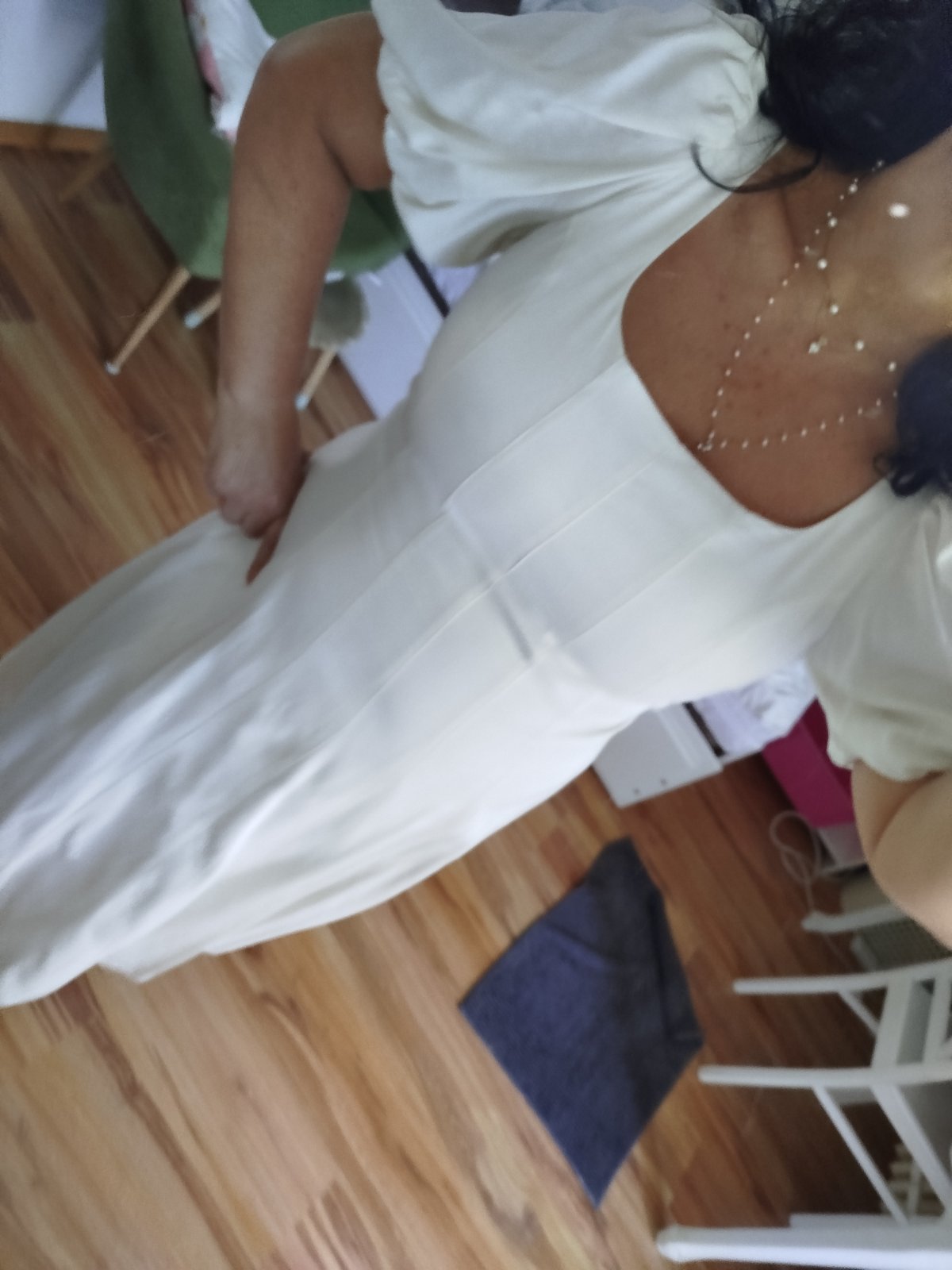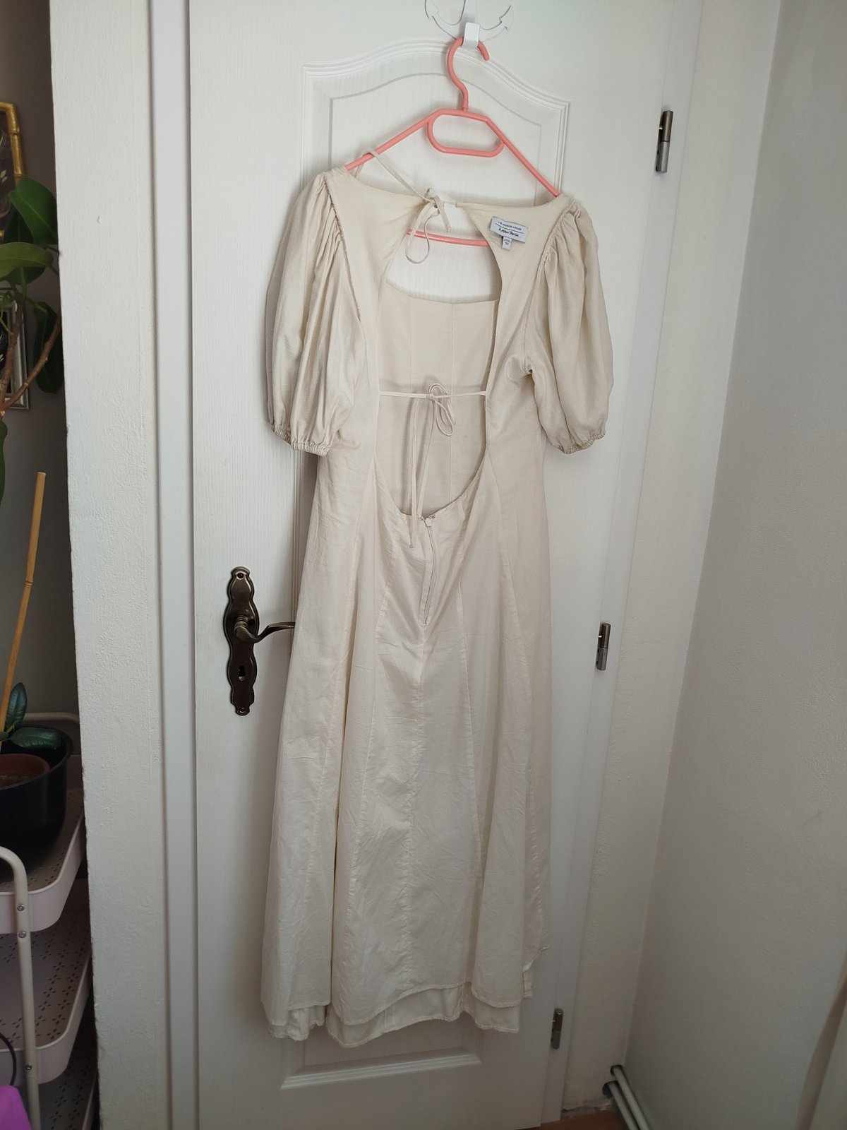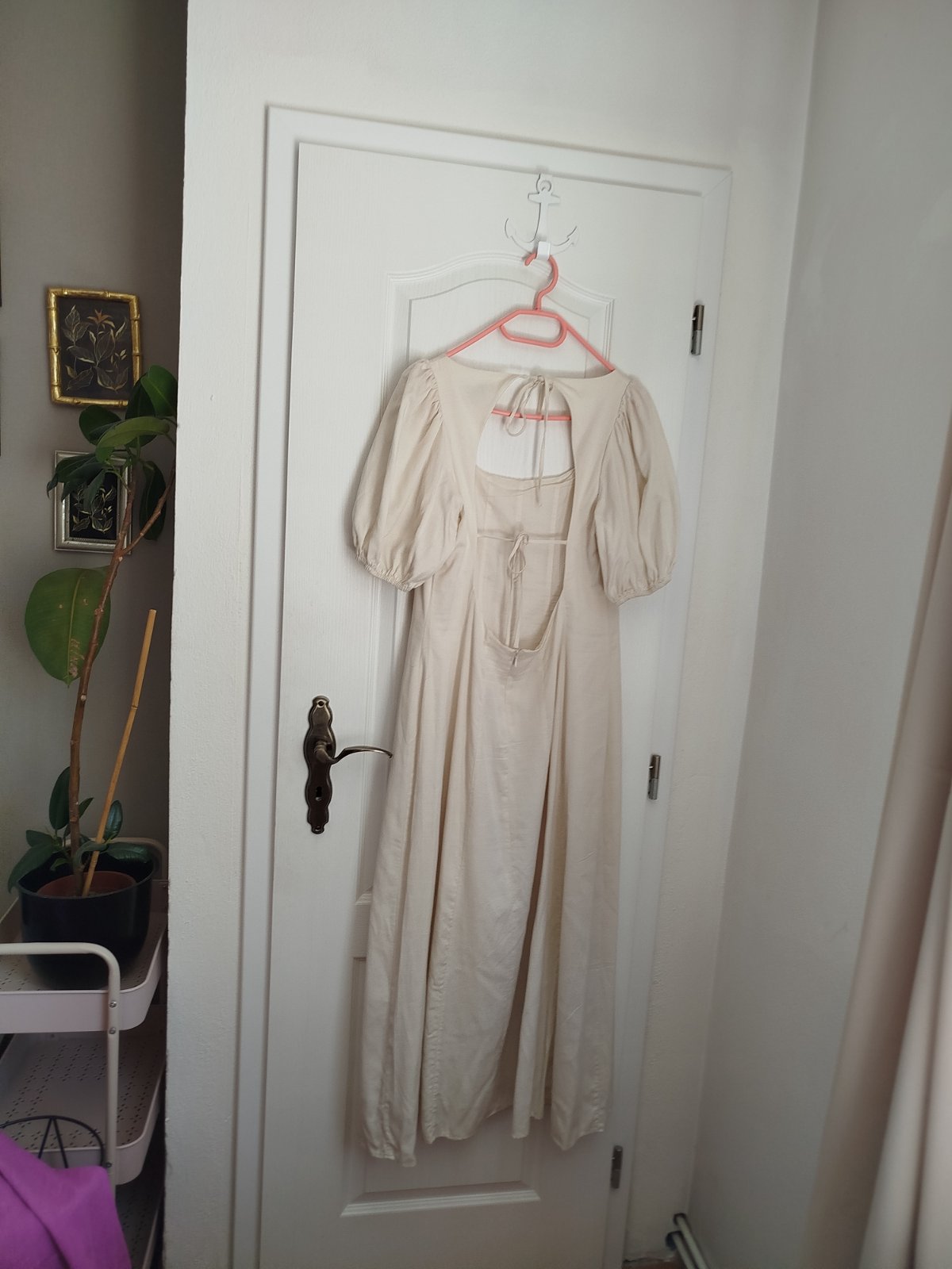 Nádherné romantické šaty ženský strih krásny chrbát na viazanie viete si ho tam regulovať jemná farba bavlnené podsite dĺžka 131cm šírka pod pazuchami v kľude cca 50/56x2cm povolia vďaka viazanie alebo si ich viete stiahnuť pás 44/45x2cm boky voľné cena bola vyššia