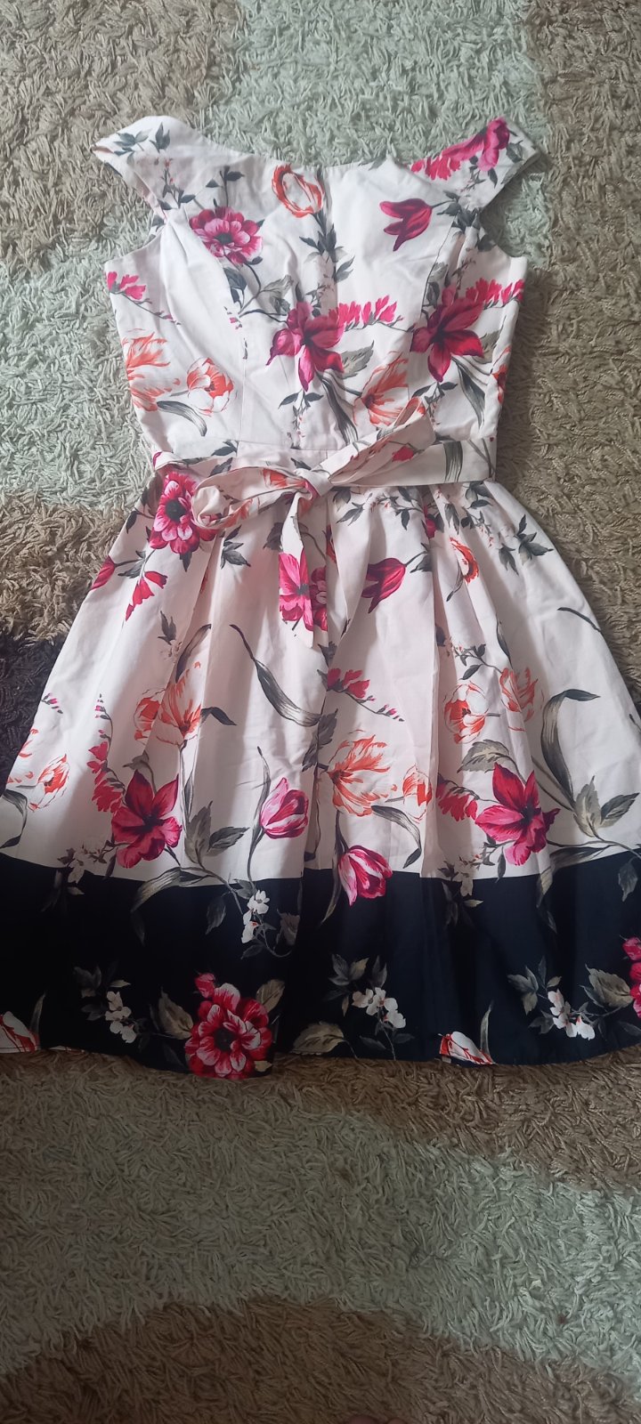 Prekrasne bavlnené saty v top stave! Bohata sukňová casť, prestrihnuté v pase, vzadu na zips až po pas( skrytý), krasna aplikacia kvetín po celom povrchu. Masla v pase sa da odobrať alebo vymeniť z...