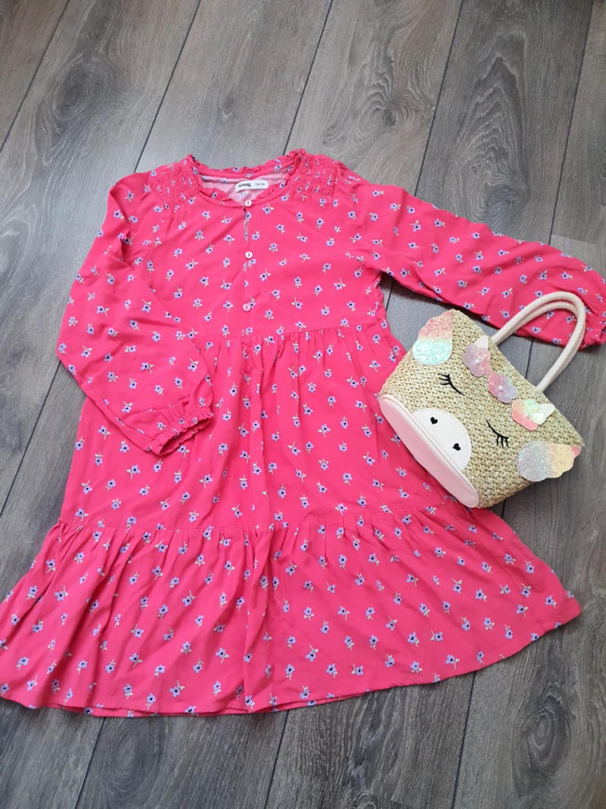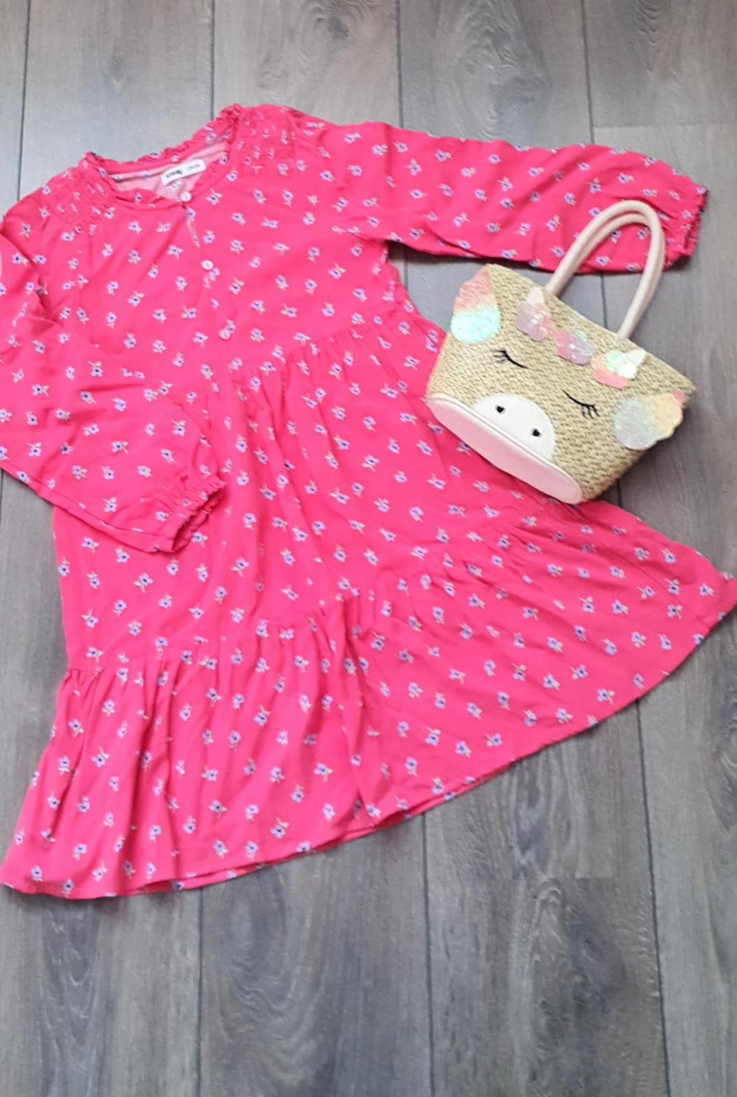 Šaty veľ. 134. Dĺžka od ramena 65 cm. Šírka medzi rukávmi 33 cm. Cena je s poštovným. Ak si vyberiete 3 ks šiat z mojej ponuky, máte 3 ks za 12 eur.