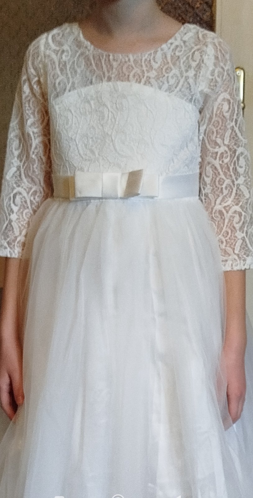 Predám šaty na prijimanie spolu s bolerkom, kruhom a taštičkou. Vrch a rukavy su cipkovane, len bola zima a mala pod satami aj tricko. Na druhej fotke ma zase pod satami sede tielko. Mozem poslat cisto foto siat, ak bude treba. Oblečené boli asi 3 hodiny. Predtým kupované nové. Veľkosť 134/140, 9-10 rokov. Pridám aj plastovú ochranu na sviečku. V ponuke mám aj krásne biele topanky.
