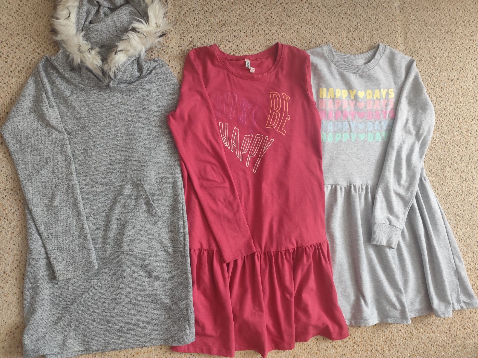 Šaty veľ. 146, sivé F&F zateplené, sivé s kapucou teplejšie a bordové Cocodrillo bavlnené. Bezchybný stav.