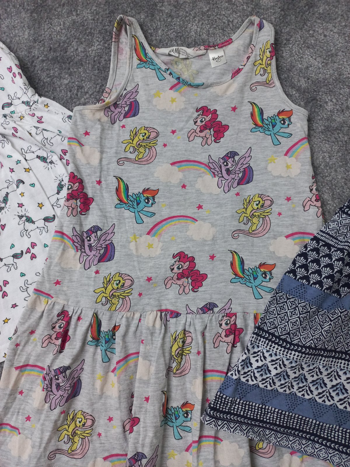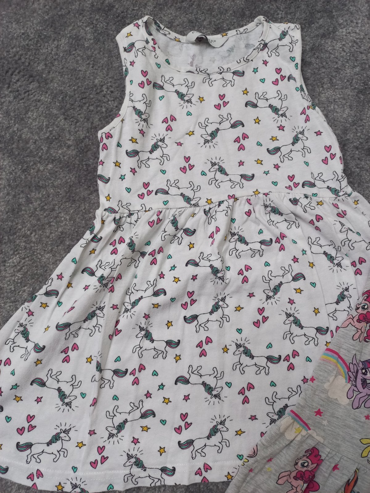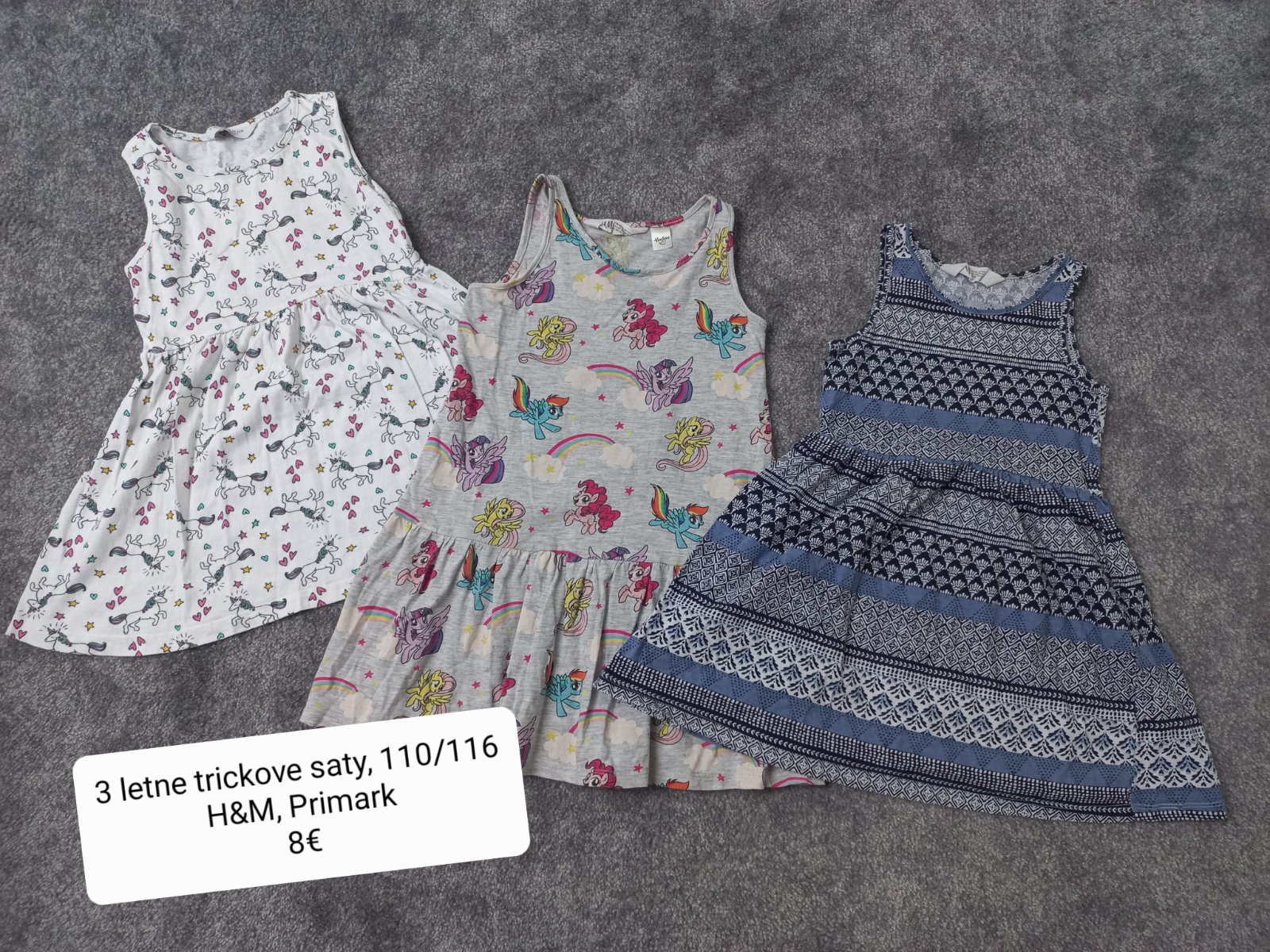 3 letne tielkove saty v peknom nosenom stave, bez poskodenia. Vlavo biele Primark 110, ostatne H&M, 110/116. Spolu 8€.