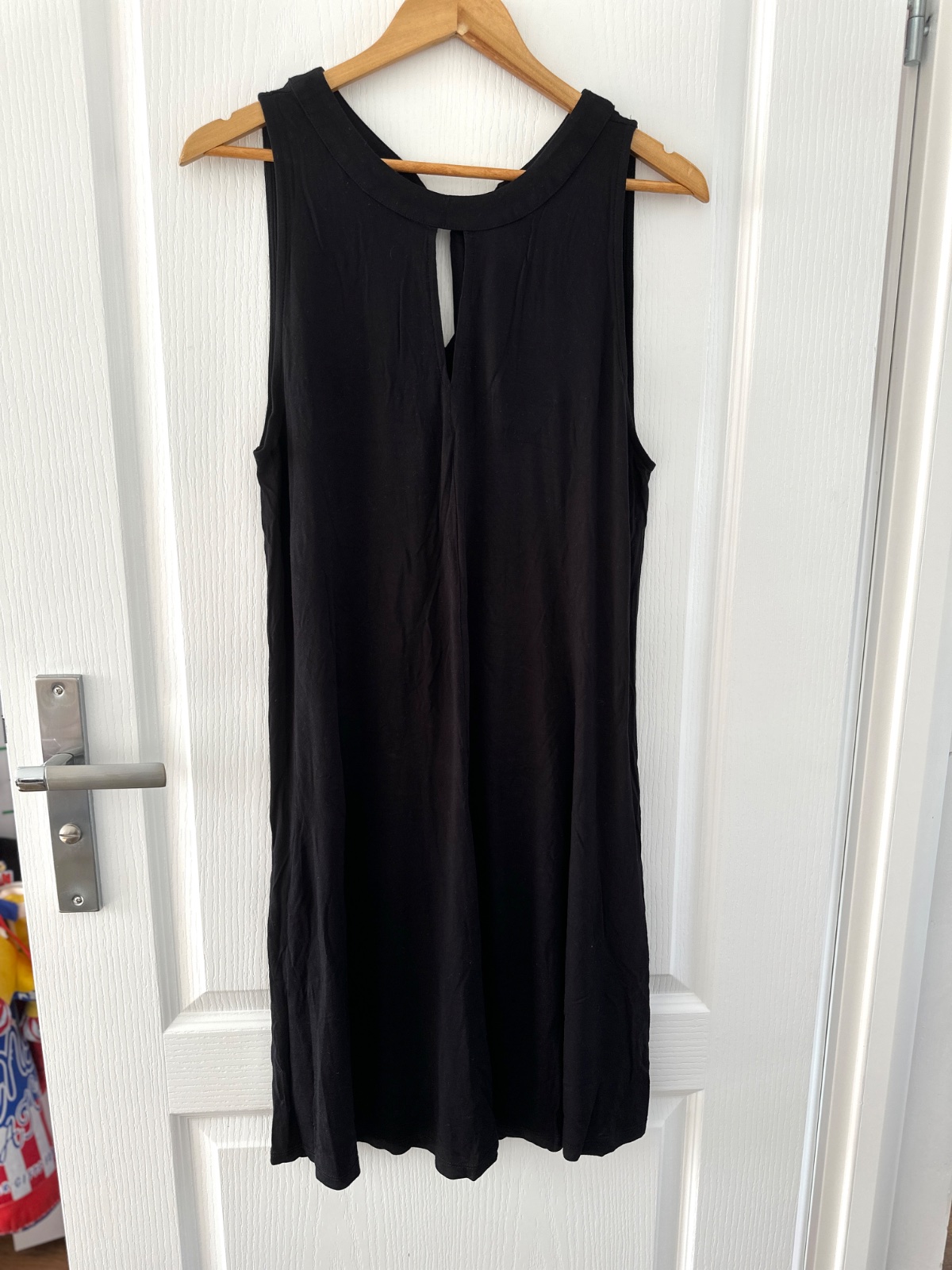 Čierne viskózové šaty s vreckami do tvaru A. Šaty siahajú pod kolená a majú okrúhly výstrih, ktorý sa dá nastaviť opaskom so zaväzovaním vzadu. Ozdobný otvor na chrbte a výstrihu krásne zvýrazňuje dekolt. Šaty majú voľný strih a materiál je veľmi pohodlný (100 % viskóza). Vyzerajú skvele s podpätkami a teniskami. Na štítku je uvedená veľkosť 44.