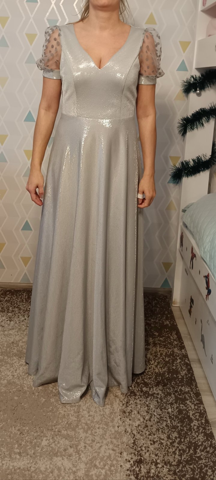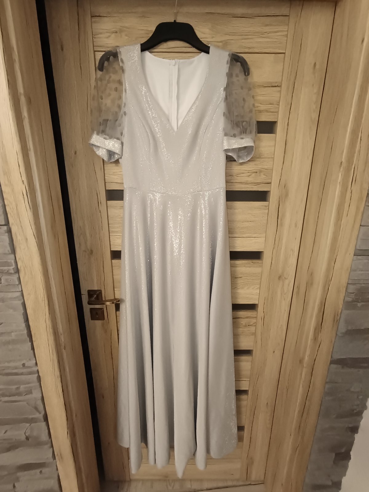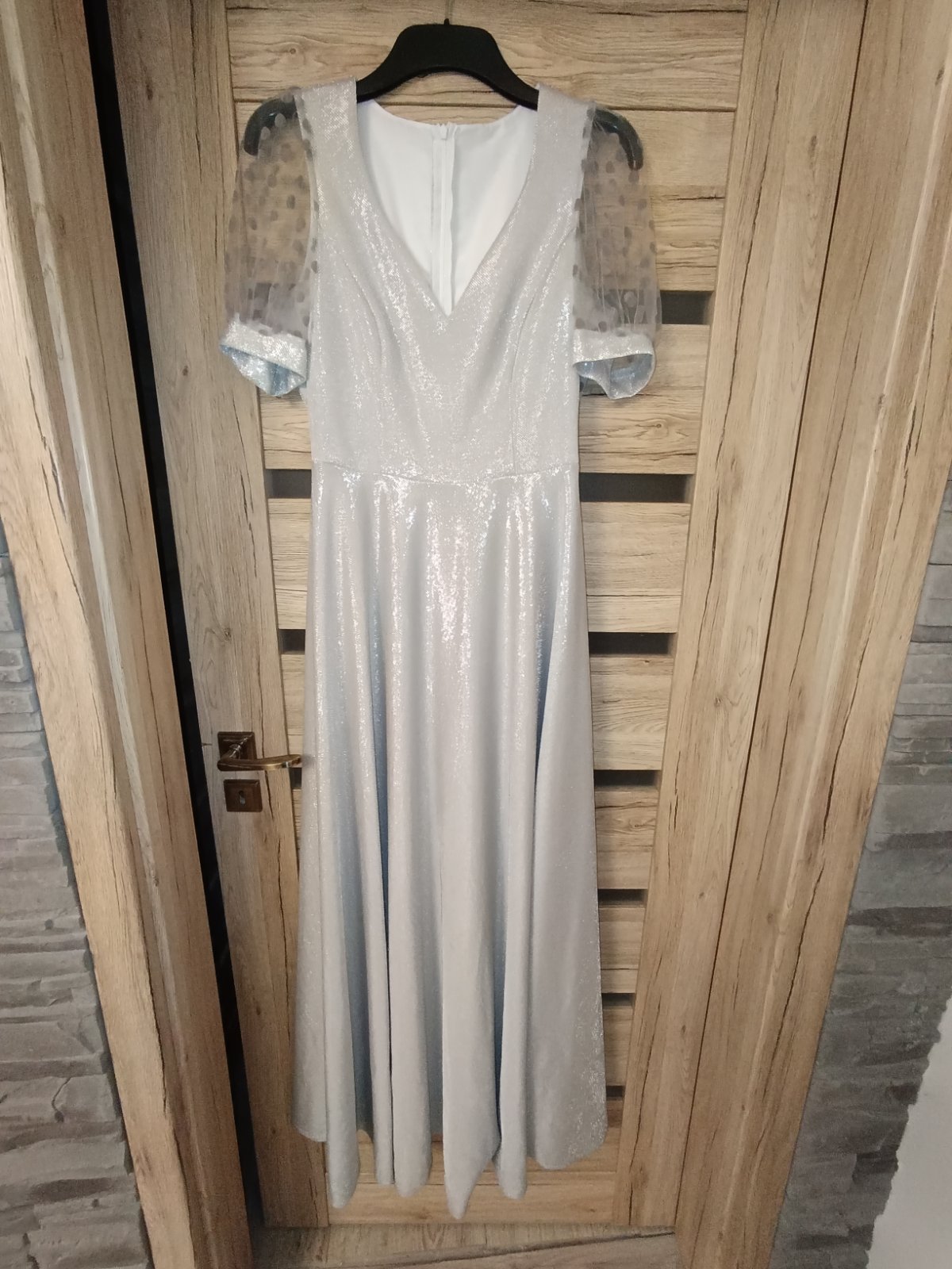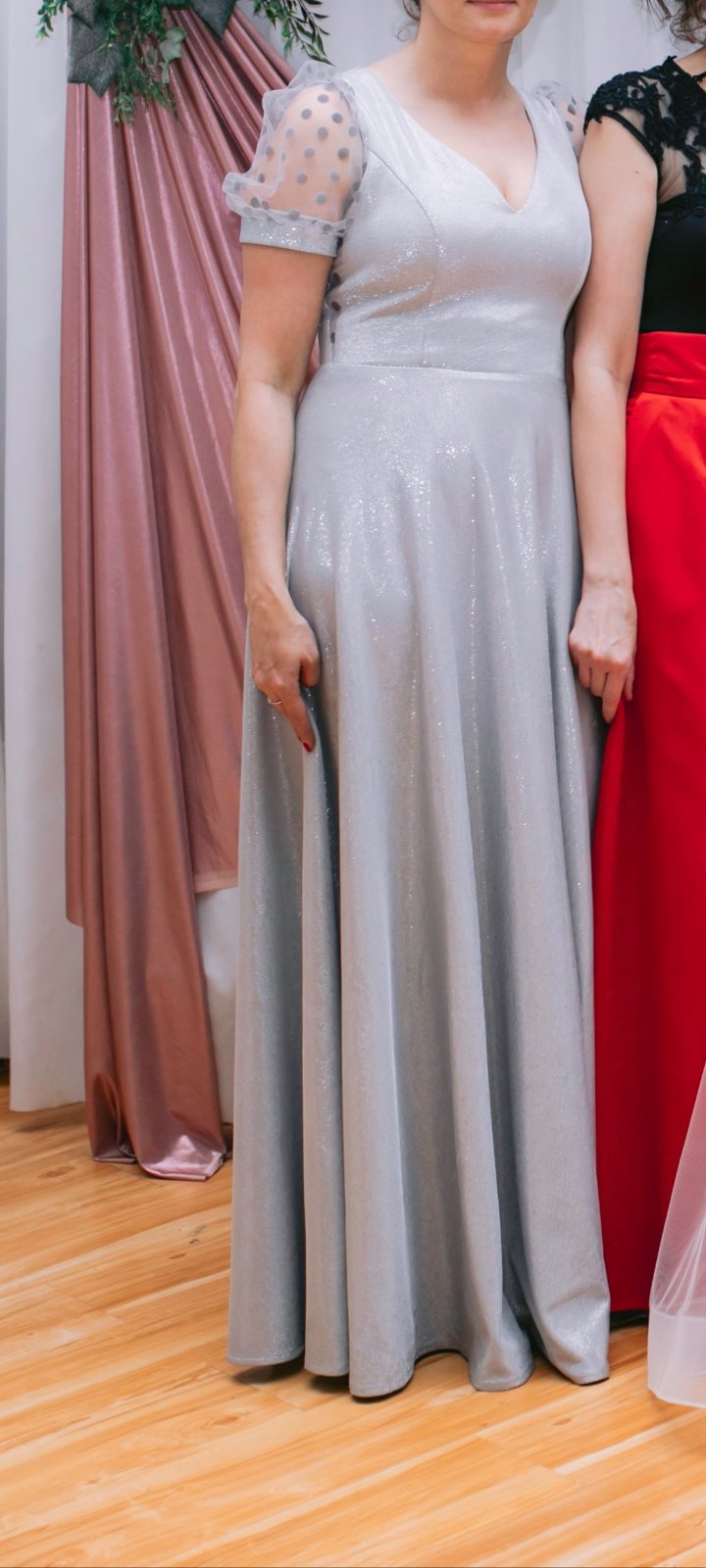 Veľkosť S. Šité v krajčírskom salóne. Top stav, oblečené 1x na svadbe. Žiadne poškodenia ani zatrhnutia. Krásna strieborná látka, ktorá sa v žiari svetiel nádherné ligoce.