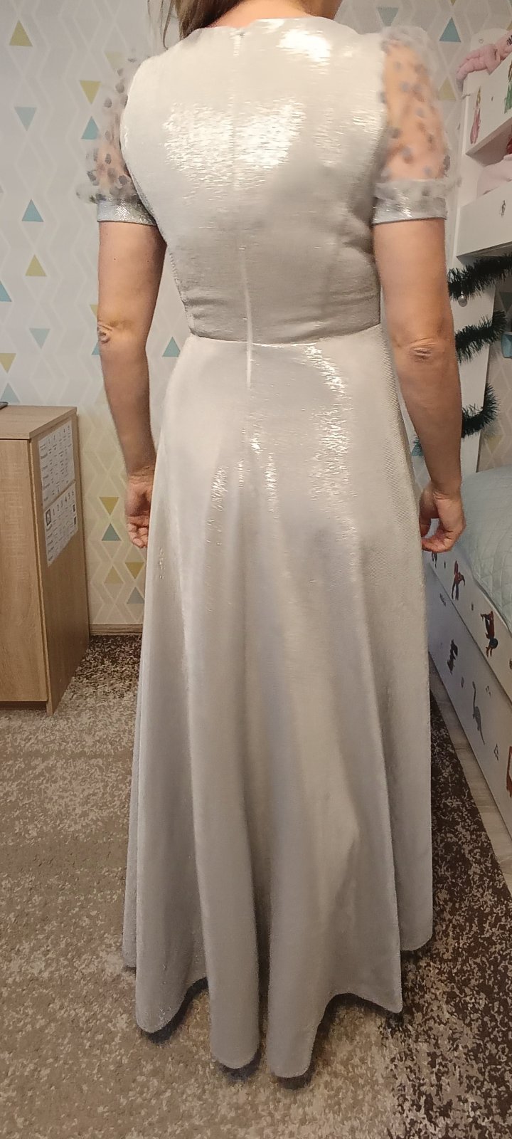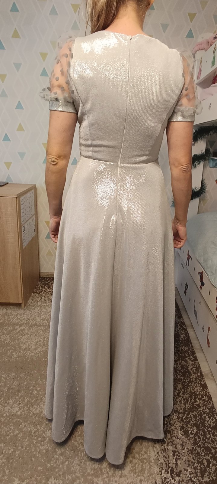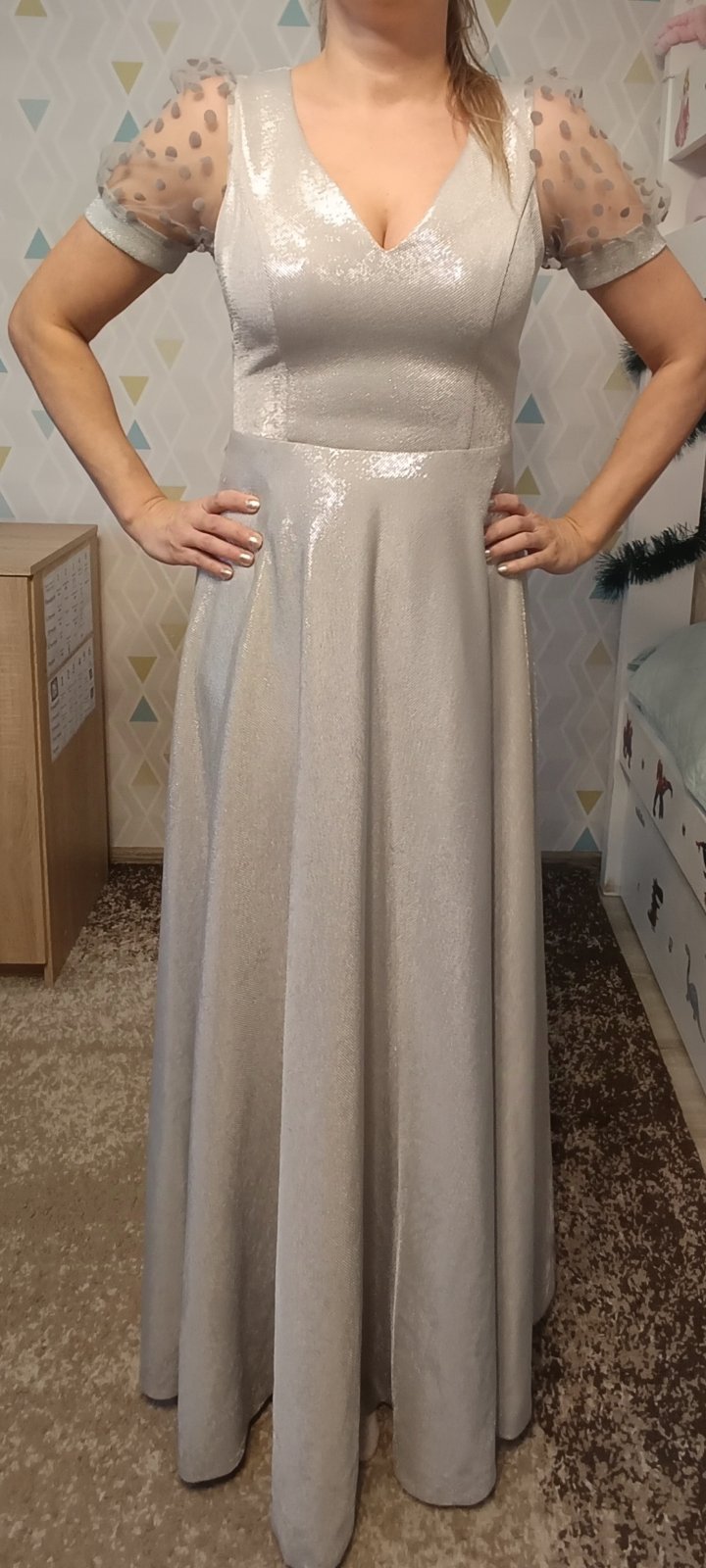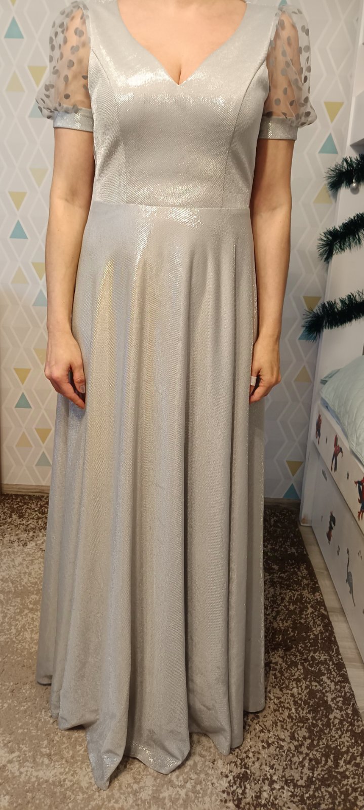 Veľkosť S. Šité v krajčírskom salóne. Top stav, oblečené 1x na svadbe. Žiadne poškodenia ani zatrhnutia. Krásna strieborná látka, ktorá sa v žiari svetiel nádherné ligoce.