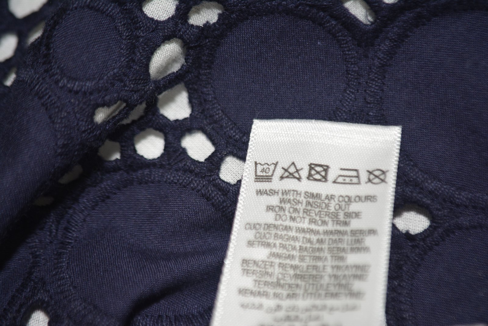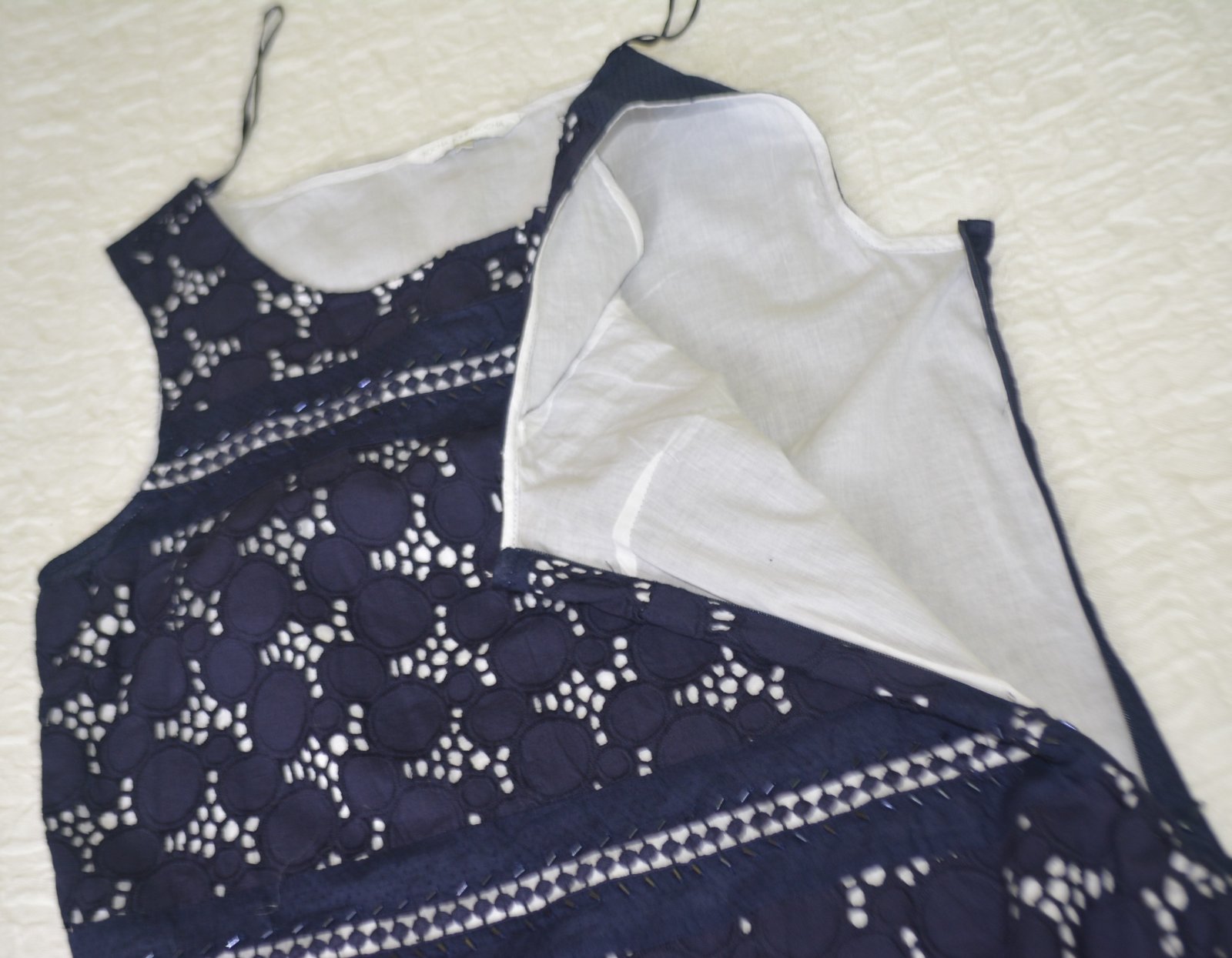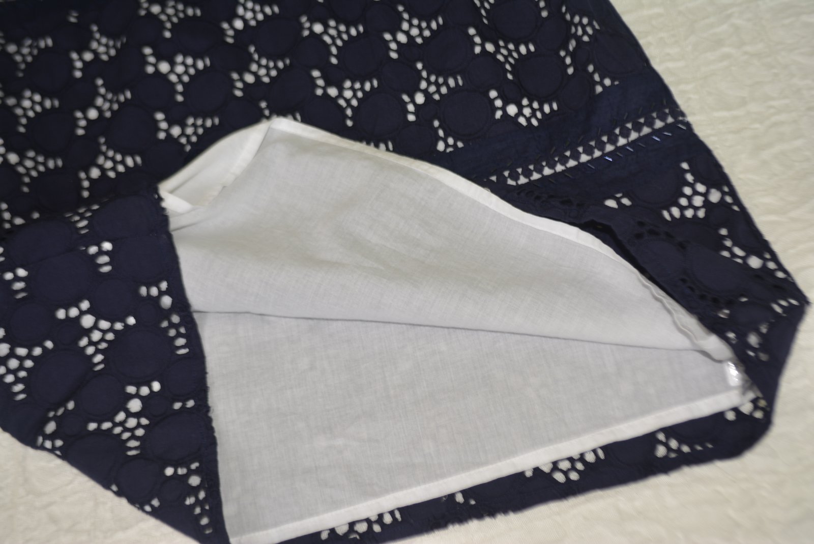 Vrchná látka je bavlnená, akoby madeira, podšité tenšou batistovou bielou podšívkou.