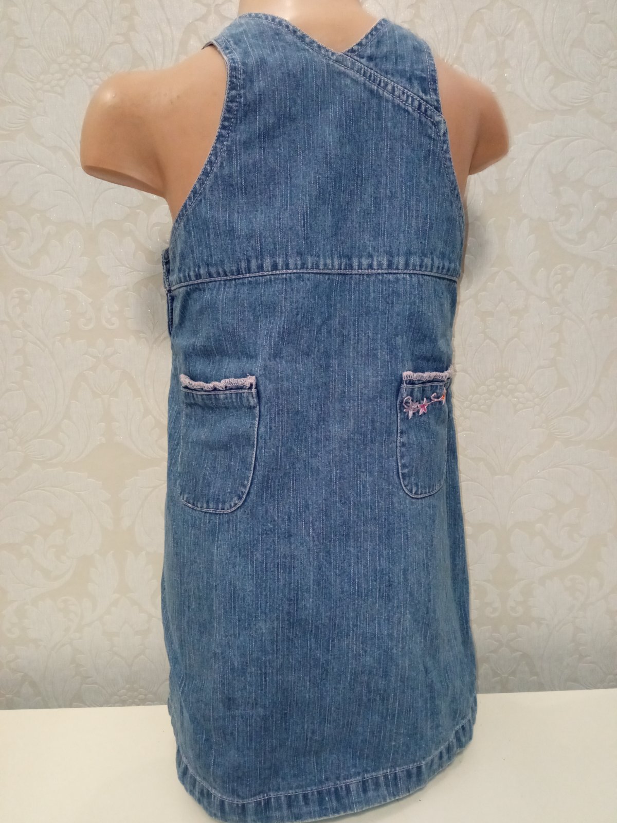 Dievčenské rifľové šaty, jedno vrecko na hrudi, dve bočné a dve zadné vrecká, zapínanie na bokoch na gombíky, nie je elastická, materiál 100%bavlna.