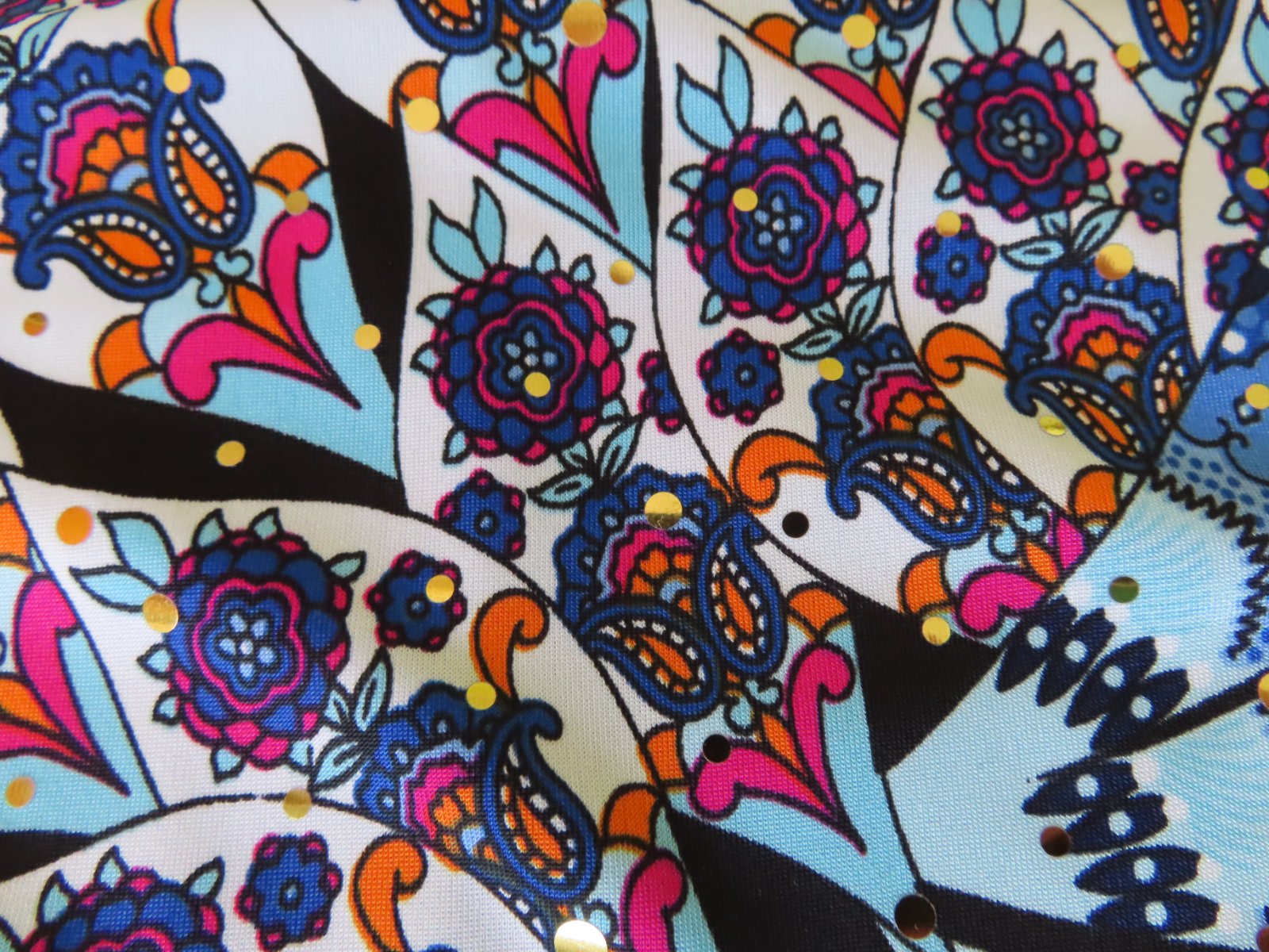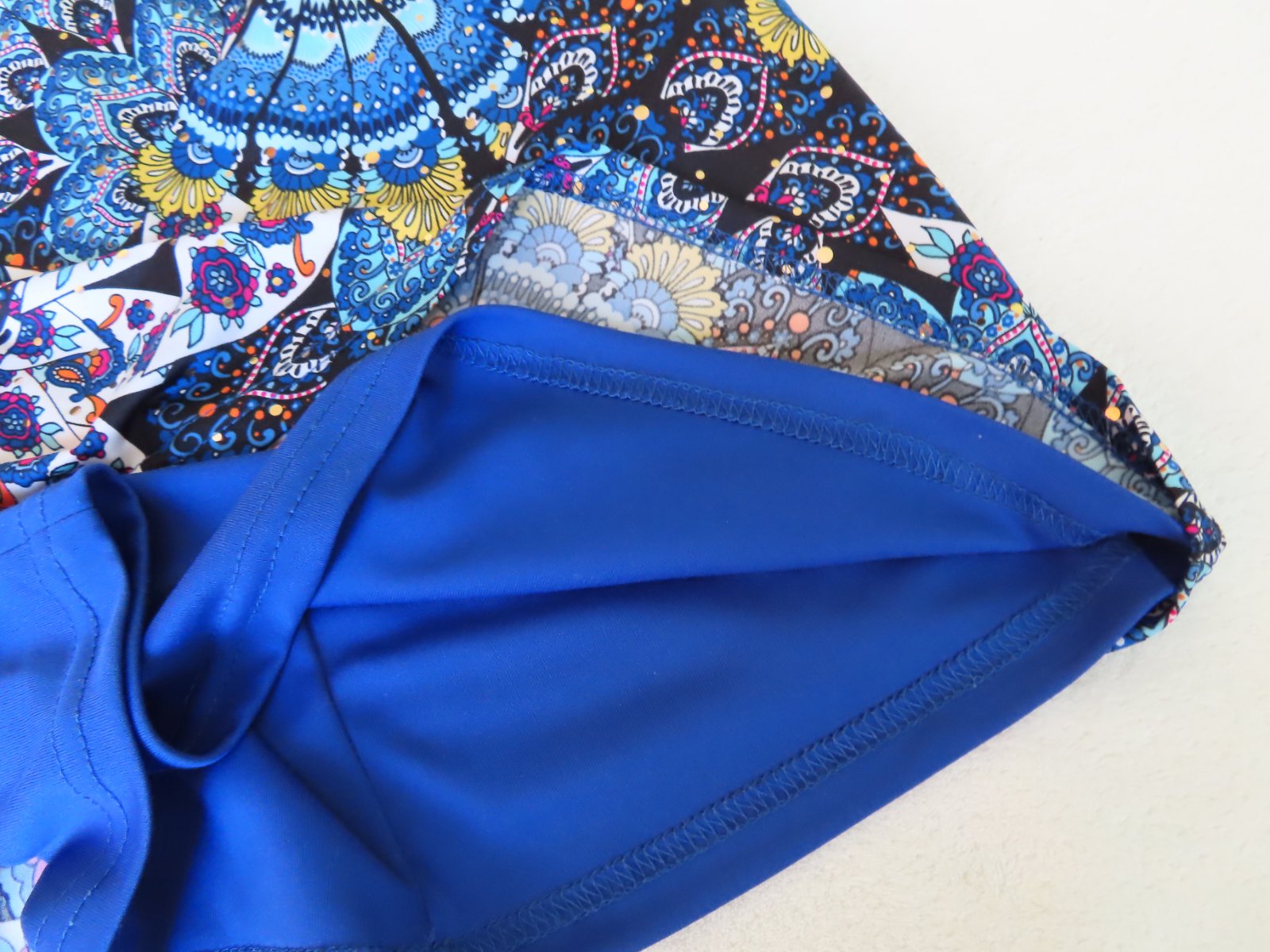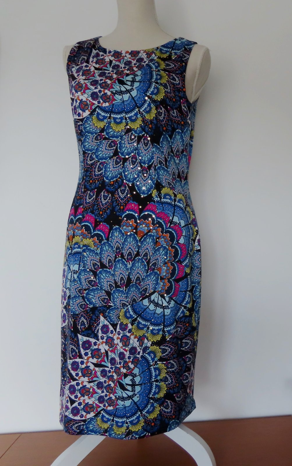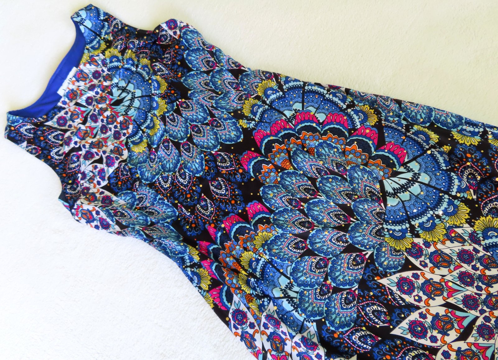 Šaty majú krásny paví modrý vzor s malými trblietkami, sú podšité, elastické, obliekanie bez zapínania cez hlavu .