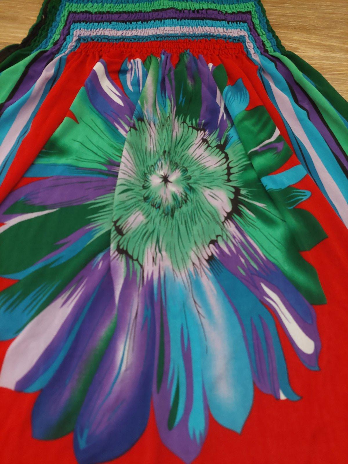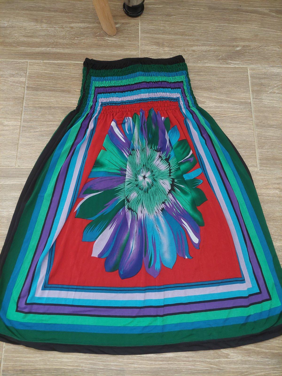 Bez poškodení, dĺžka 89cm, šírka cez prsia 42 cm, v páse gumička, elastický materiál, sedia na v. 36-38.