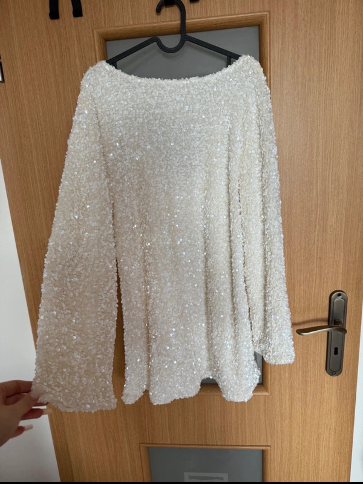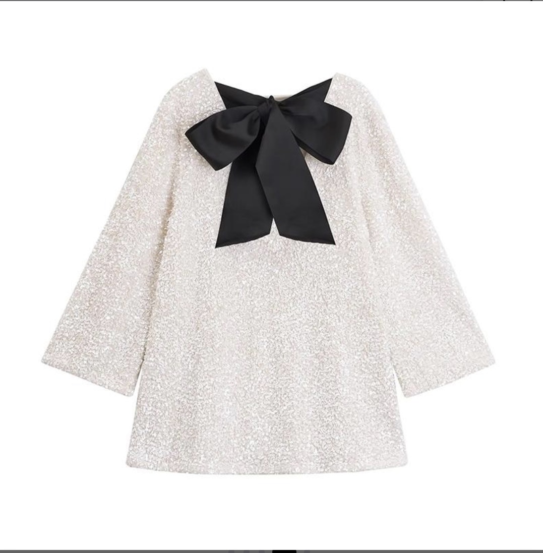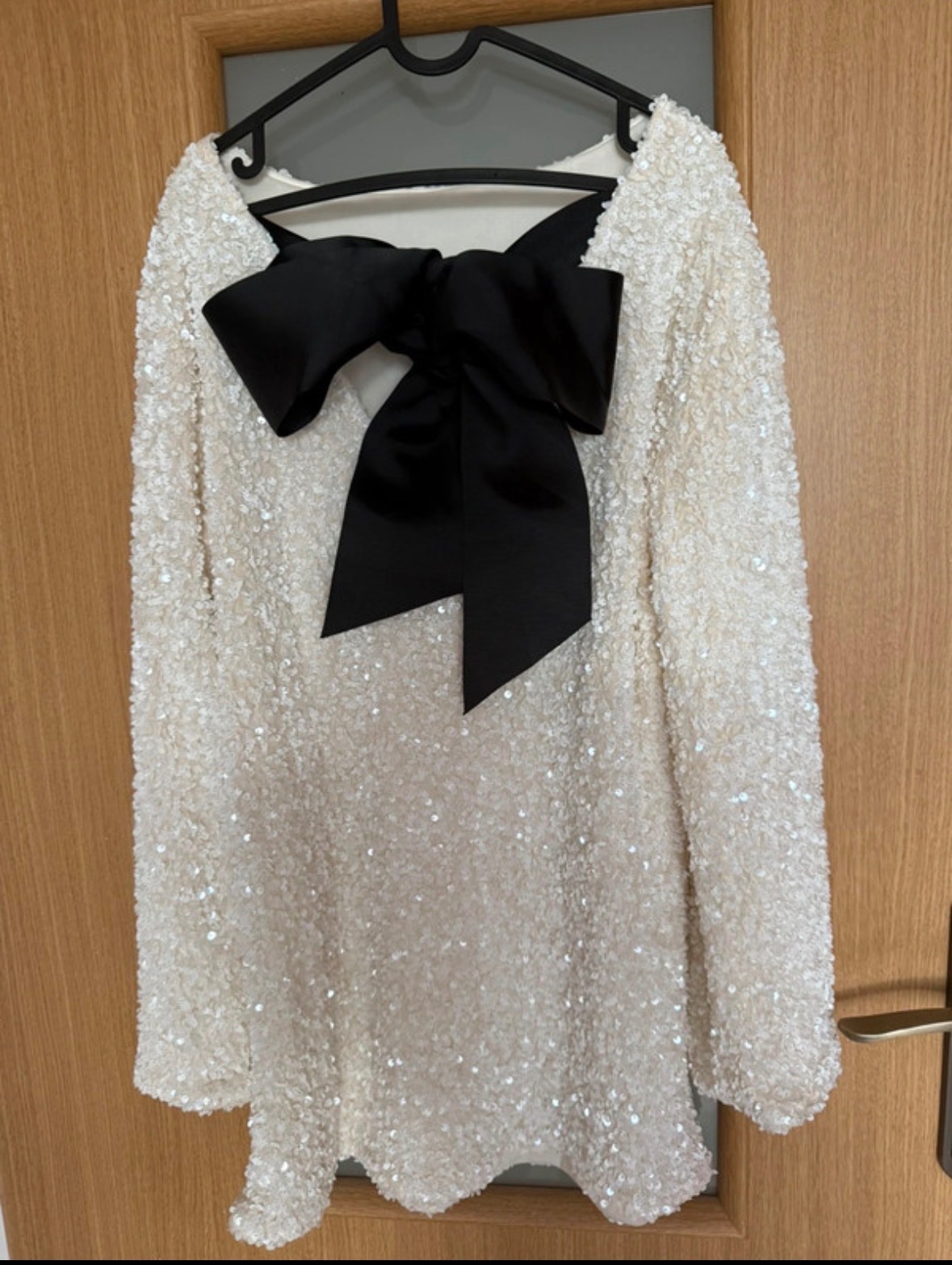 Flitrované biele mini šaty , so zvonovými rukávmi a velkou čiernou mašľou na chrbte