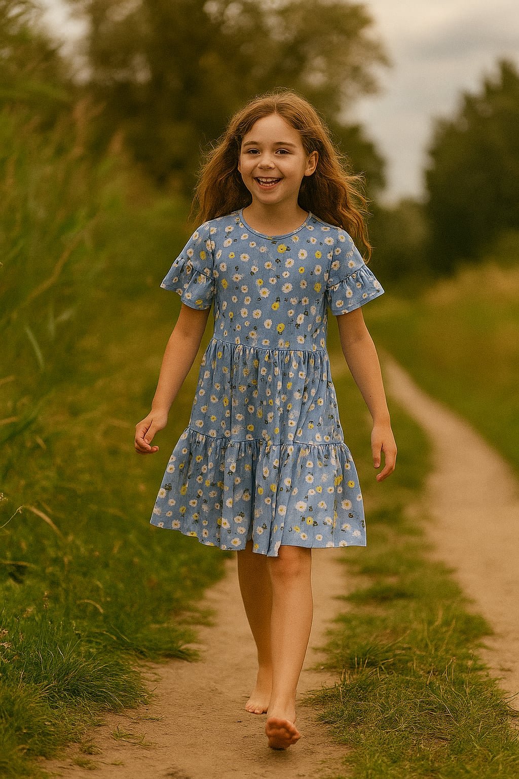Tieto dievčenské šaty v krásnom modrom odtieni s potlačou margarétiek sú stelesnením leta 🌼. Mäkký a vzdušný materiál, pohodlný voľný strih s volánmi a krátke rukávy s jemným riasením robia z tohto kúsku ideálnu voľbu na každý teplý deň.