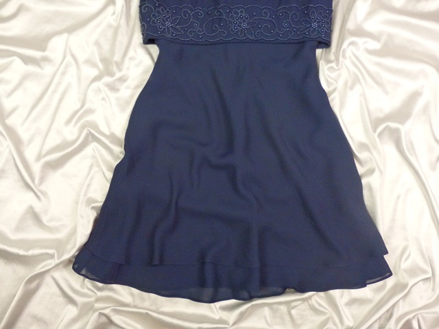 Kvalitné vintage spoločenské šaty tmavomodrej farby, zdobené našitými korálkami v páse, sukňová časť je transparentná zvrchu, podšitá, materiál 100% polyester, super stav.