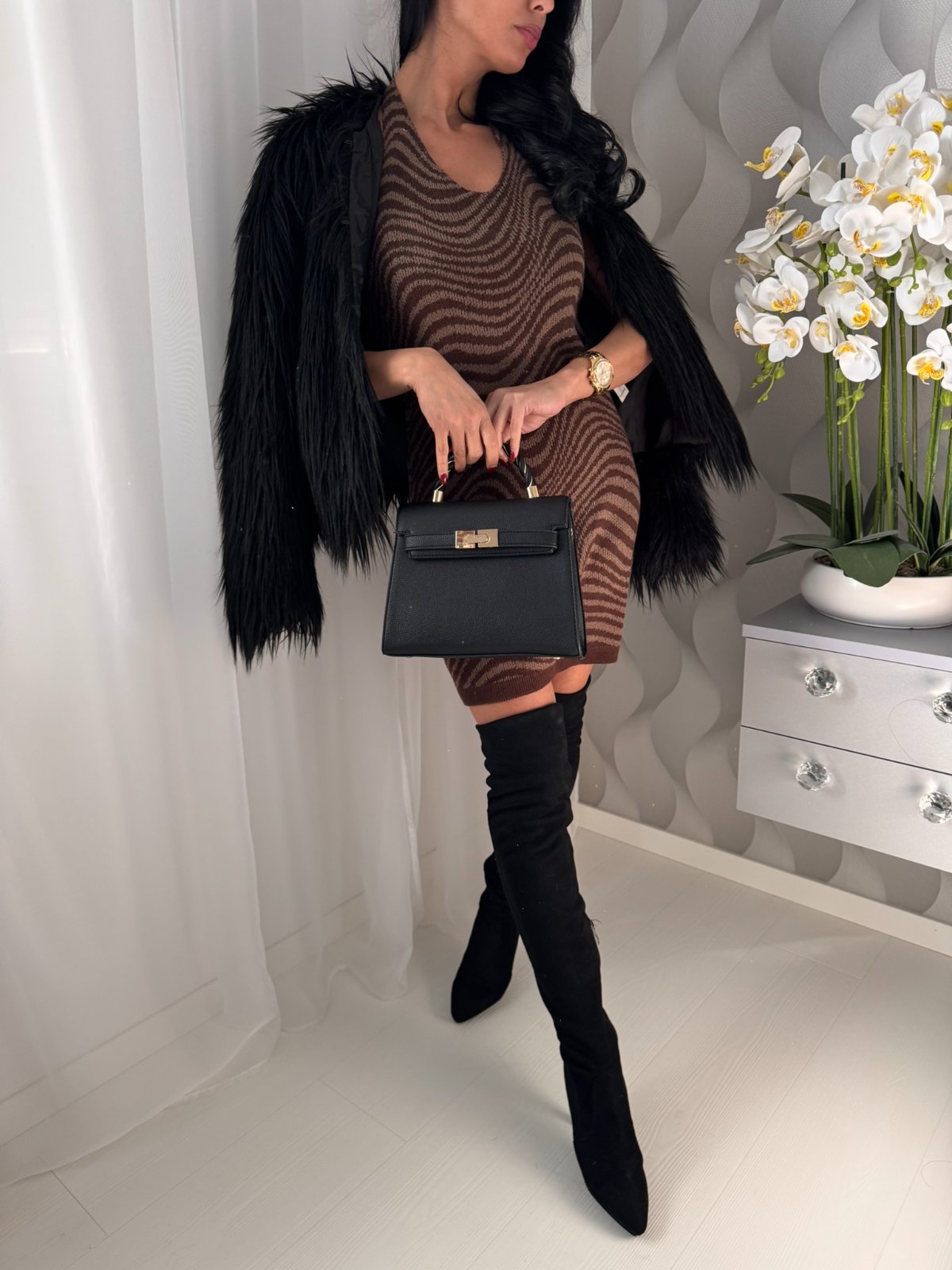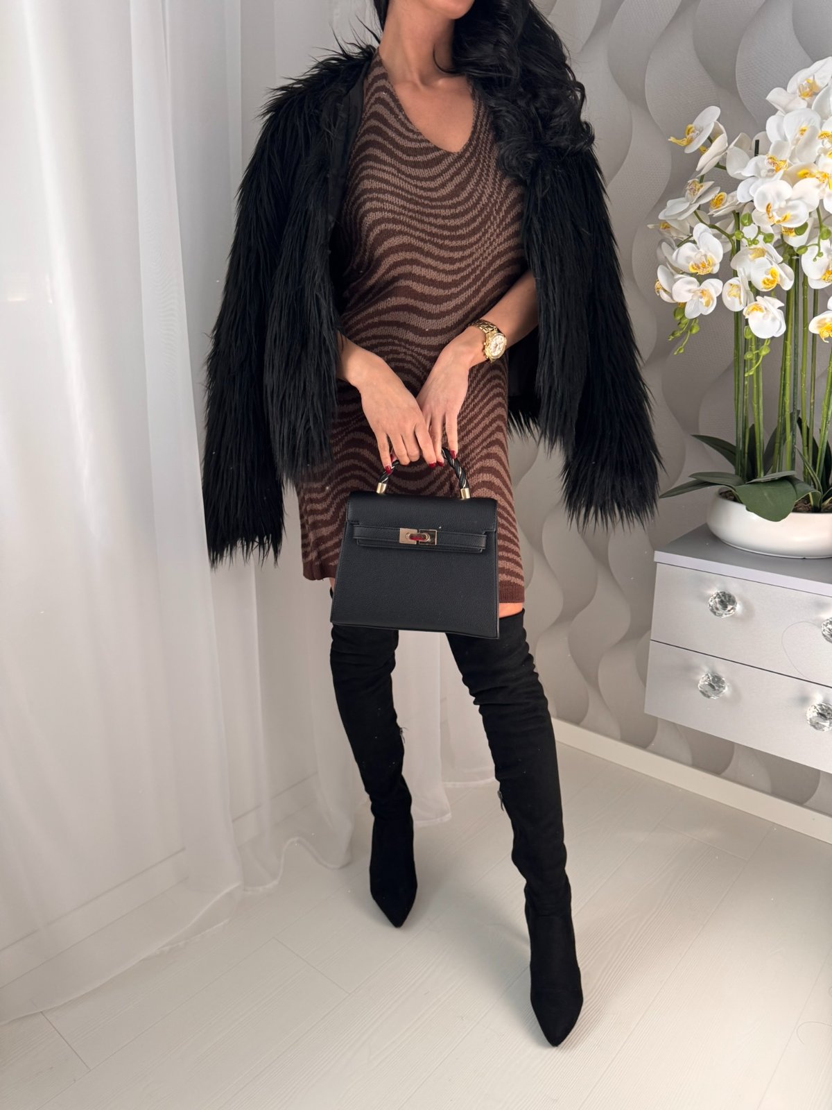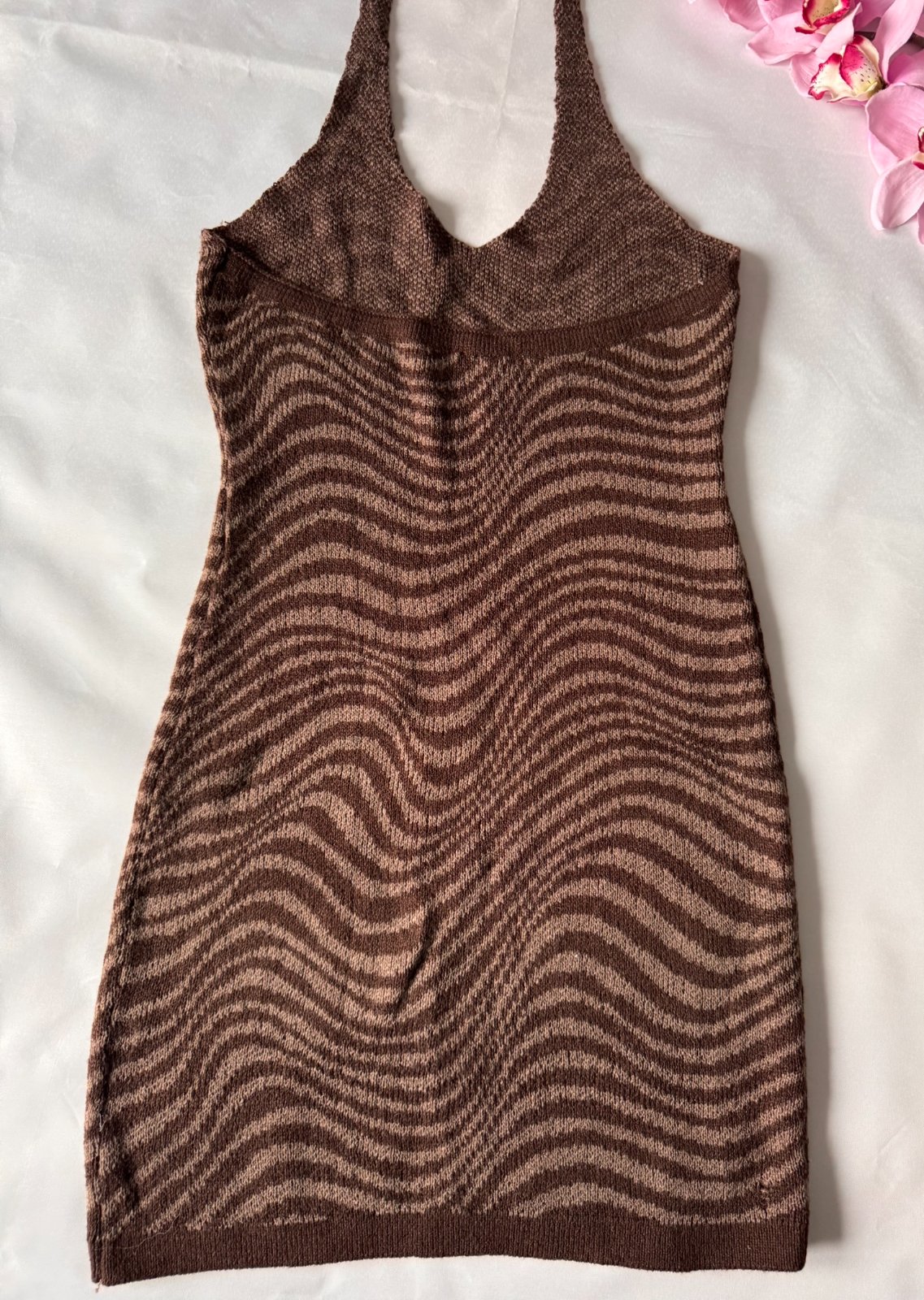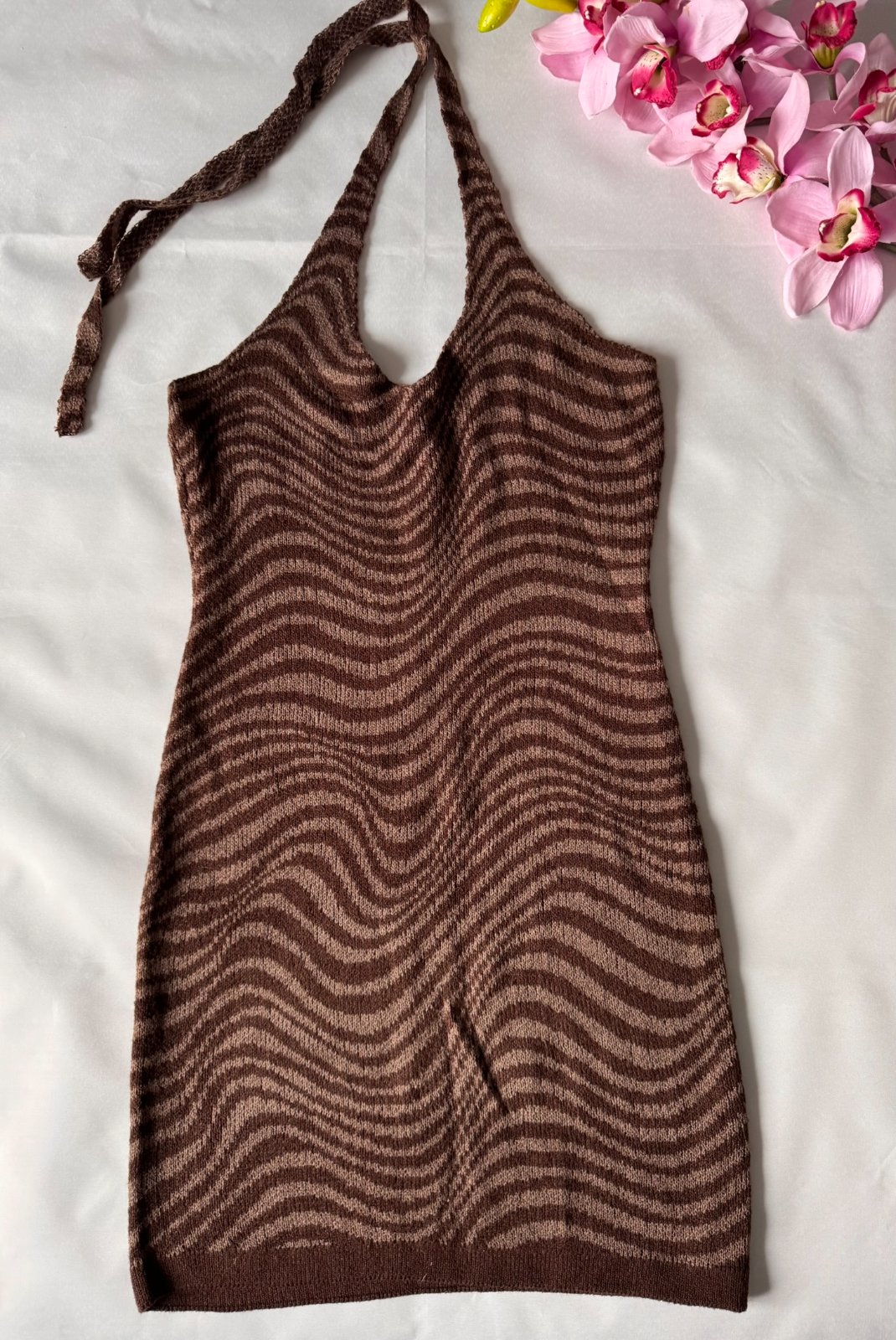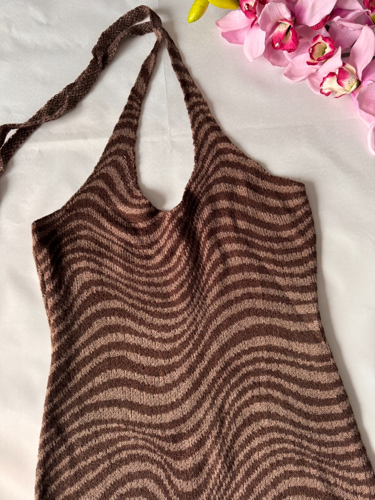 Pletené šaty na viazanie okolo krku.