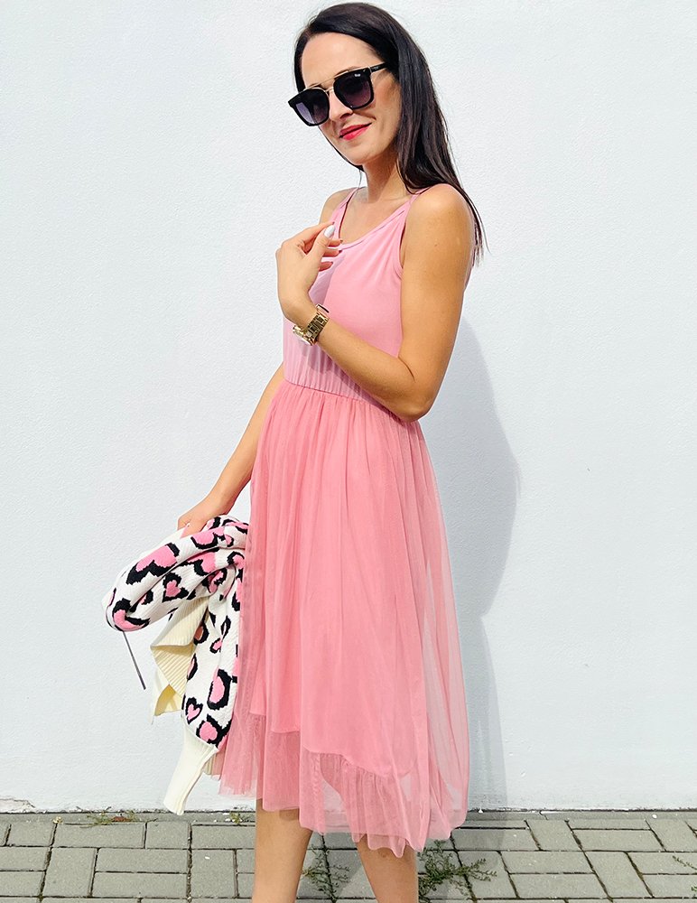 Svetloružové šaty Rosana sú krásne šaty na ramienka s tylovou vrchnou sukňou, s ktorými vytvoríte užasne outfity.