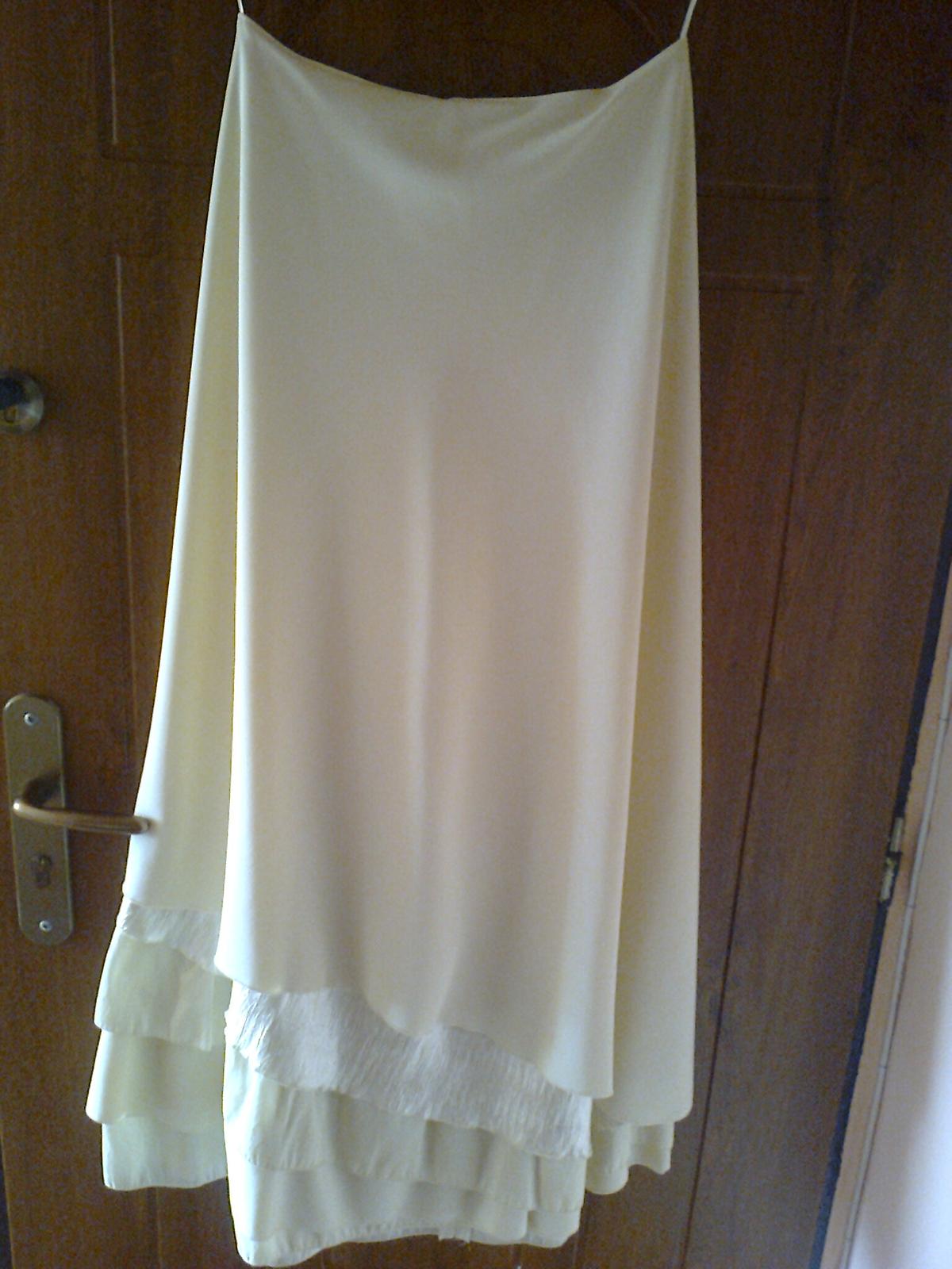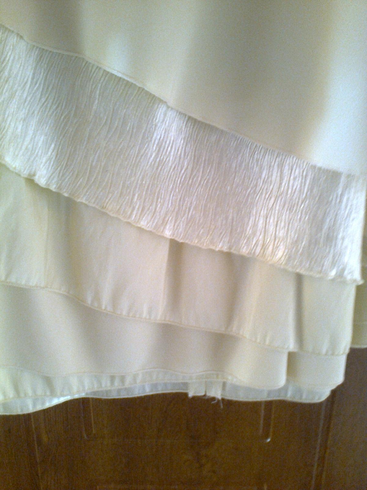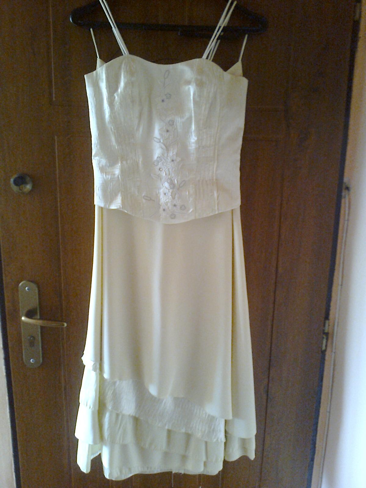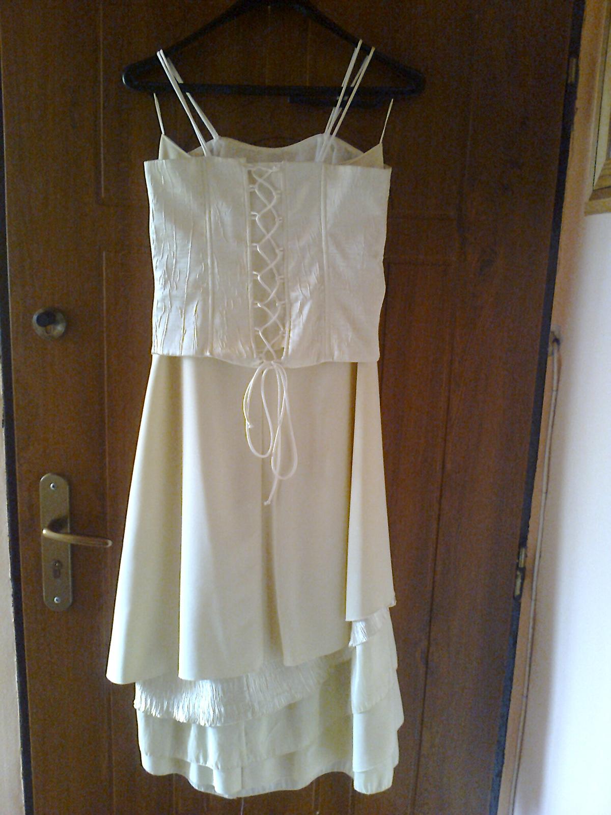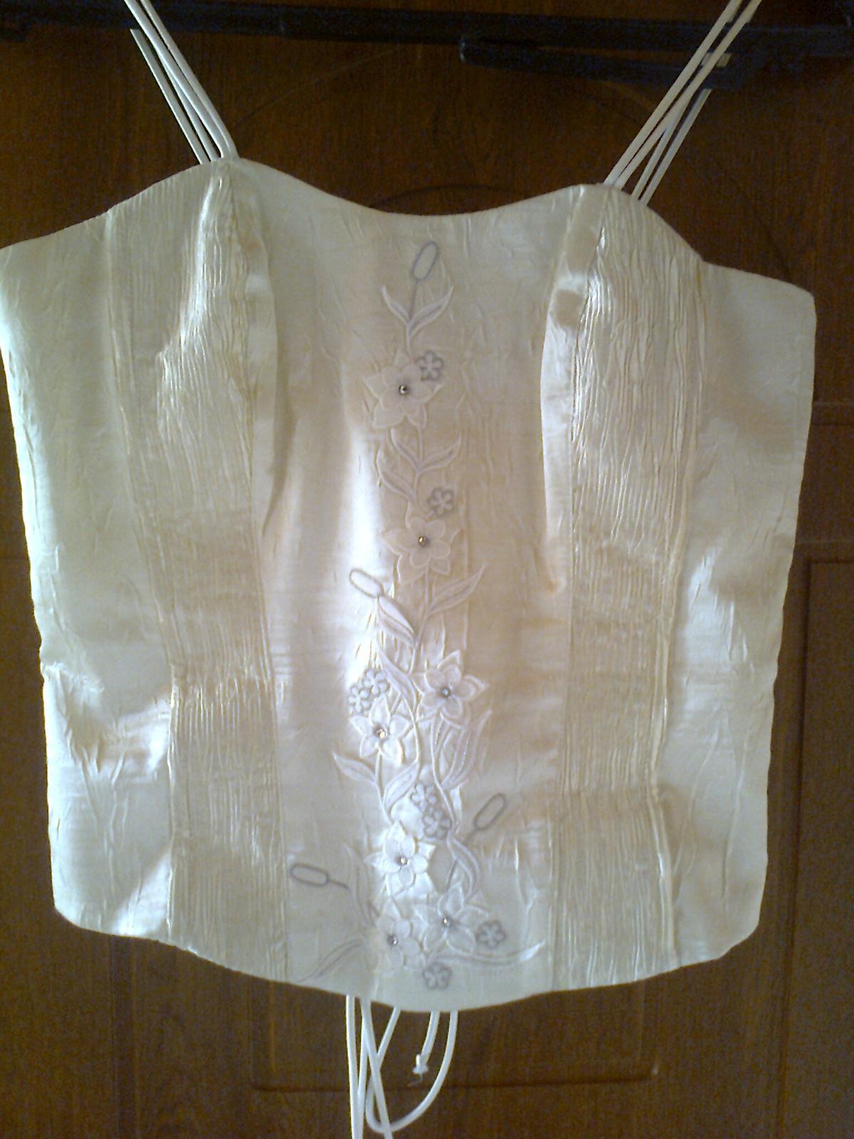 spoločenské korzetové šaty veľkosť m,značky jnter sty,farba krémová béžová korzet:predná strana výšivka plus korálky,zadná strana na šnurovačku,sukňa:v páse na zadnej strane krytý zips,spodná strana sukne s 5.fodier strihaných šikmo,dĺžka korzetu na bočnej strane 28cm,predná strana dĺžka 35cm,dĺžka sukne:103cm,dĺžka štóly:198cm,šírka štóly:35cm,k šatám je kabelka+kozmetická taštička ako darček