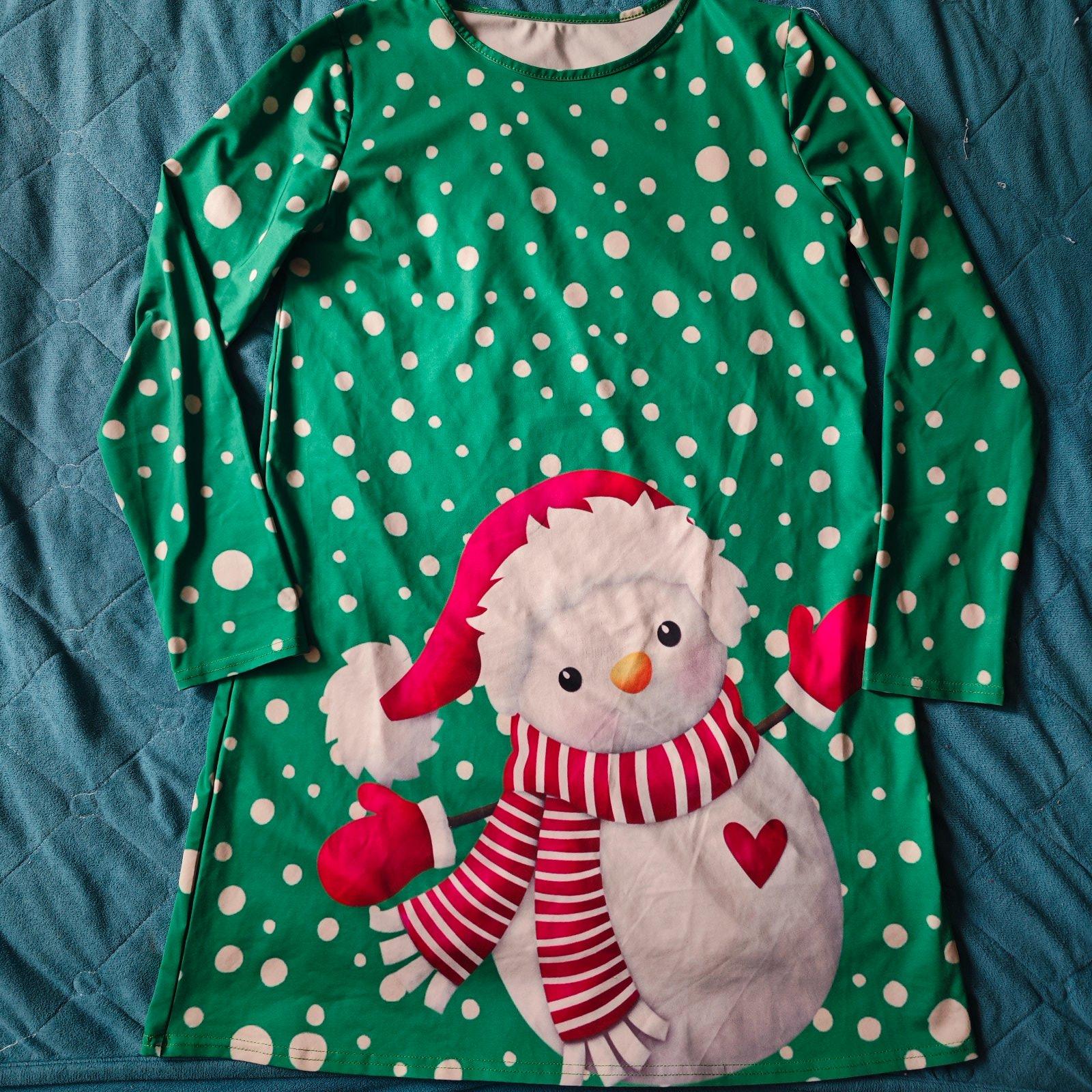 Krásne vianočné šaty s vločkami a snehuliakom, bez poškodenia, oblečené príležitostne.