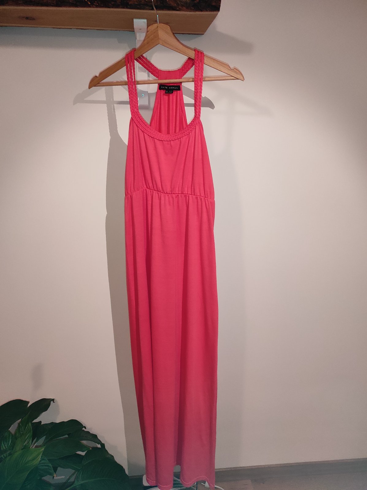 Nádherné dlhé ľahké šaty, veľmi príjemné na nosenie. Ľahká tričkovina s prímesou elastanu, takže nehrozí žiadne naťahovanie a pod. V páse na gumičku.