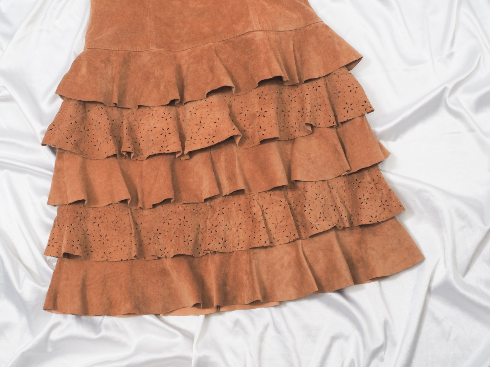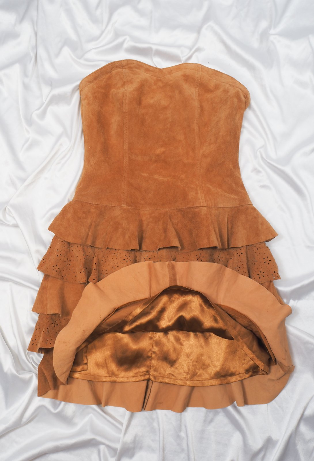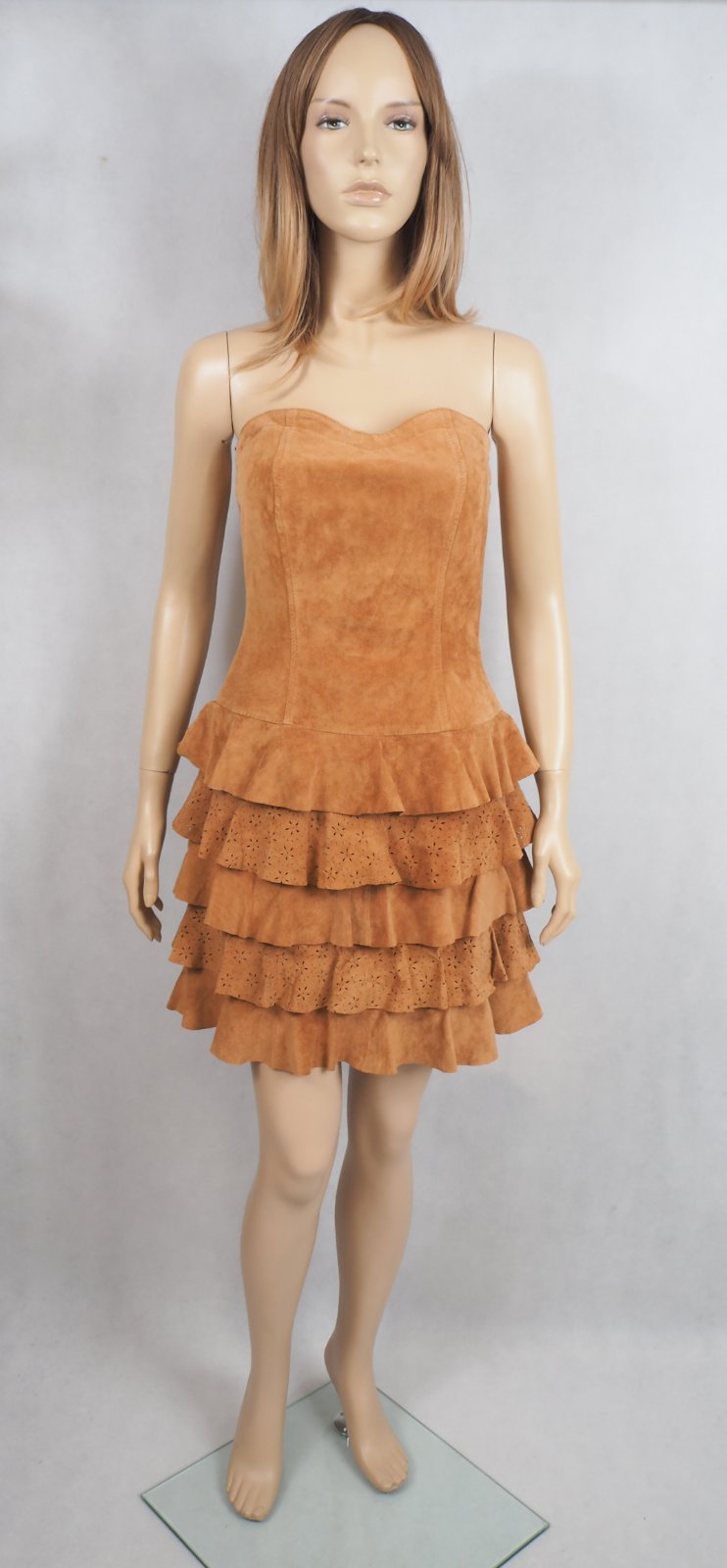 Luxusné kožené šaty ťaviej farby, tvarované na postavu, volánové, podšité saténonom, vzadu zips, pravá koža, super stav.