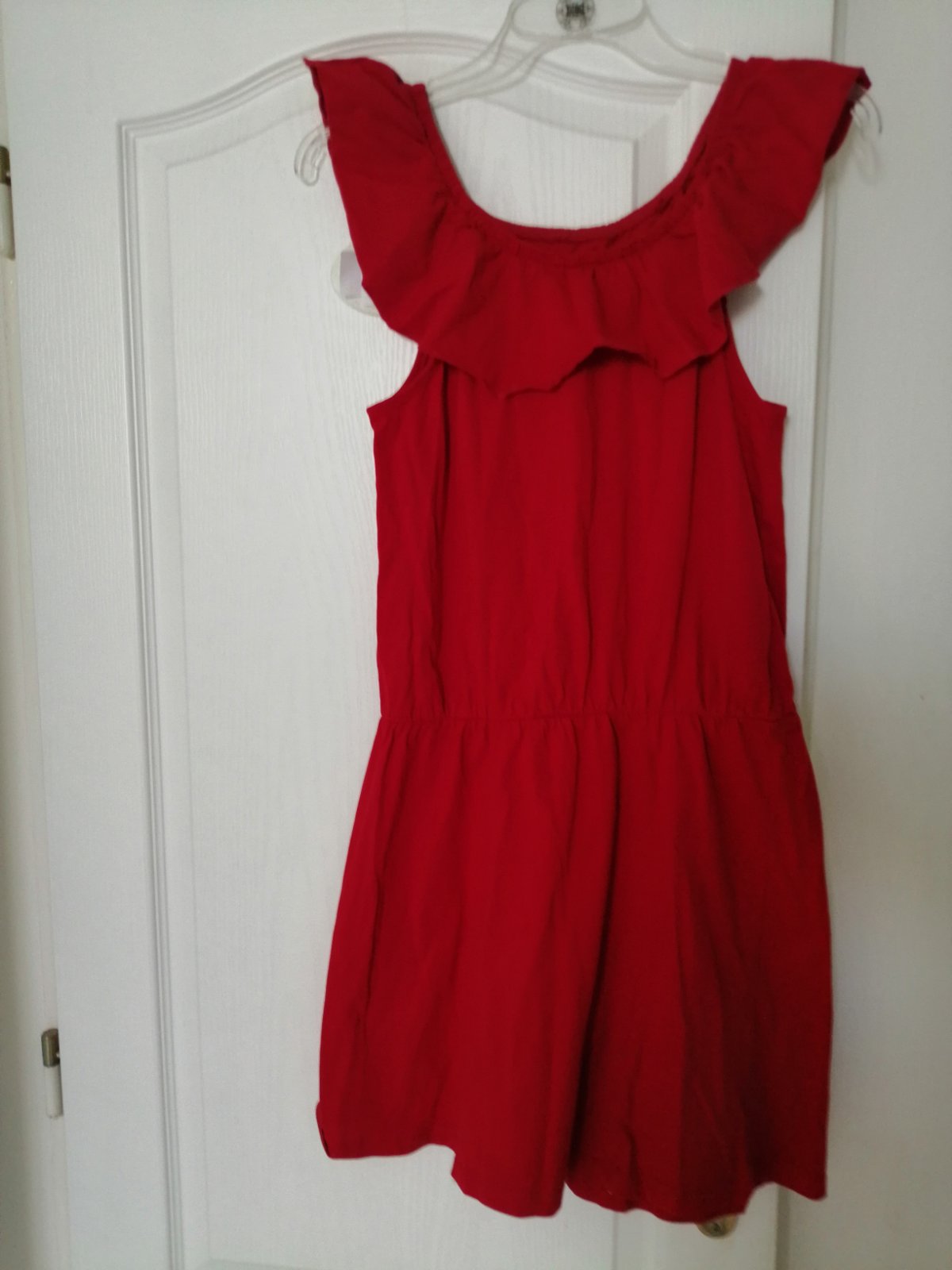 Minimálne nosene červené satecky pre dievčatka, obvod hrudnika je 86 cm a dĺžka je 87 cm, dĺžka od pazuchy po pás je 25 cm a dĺžka od pasa dolu je 39 cm