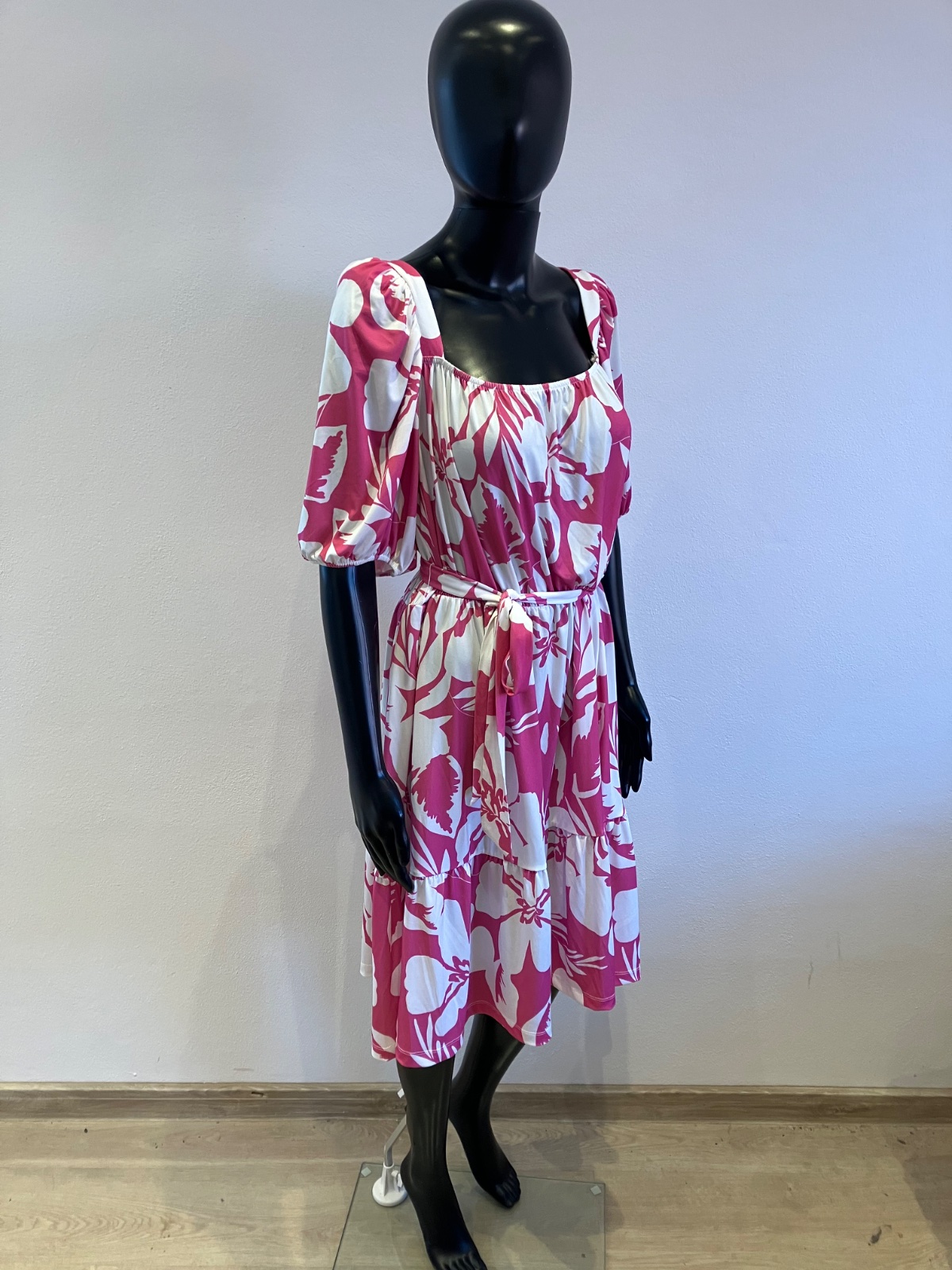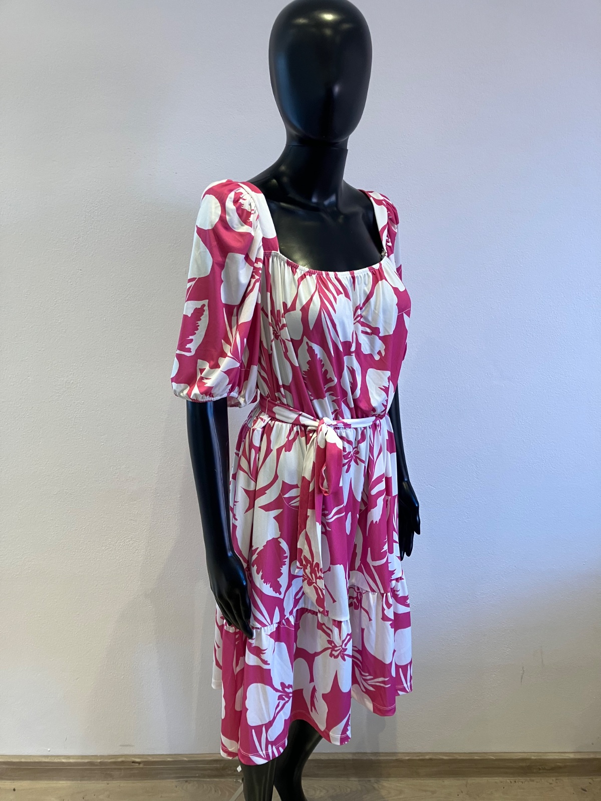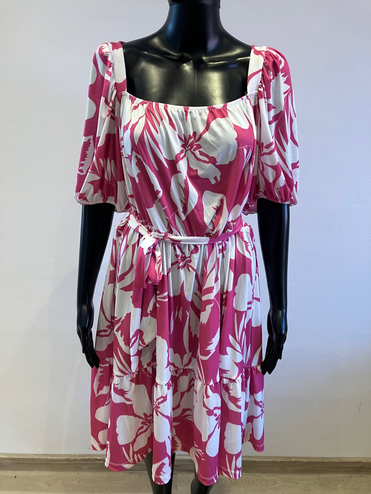 Dámske šaty s krátkym rukávom a opaskom, tenké, elastické, pás na gumu, farba bielo ružová, materiál 95%polyester 5%elastan.