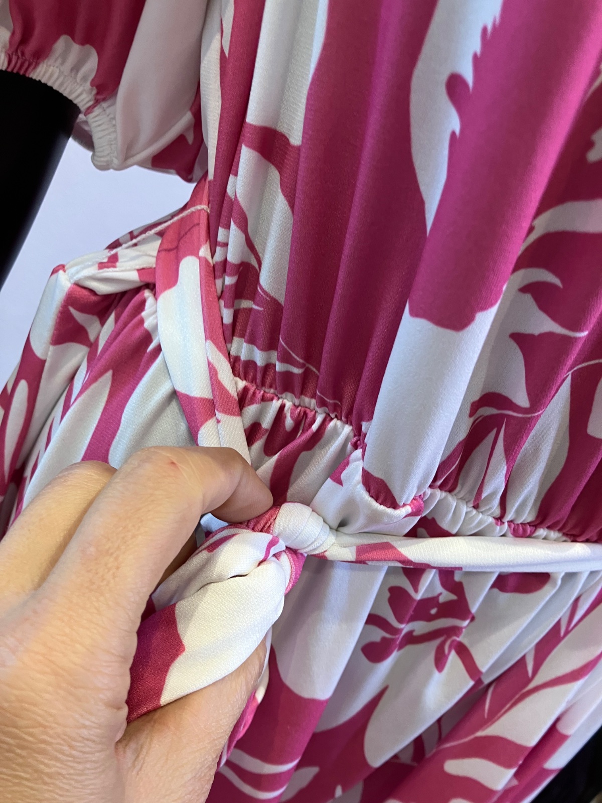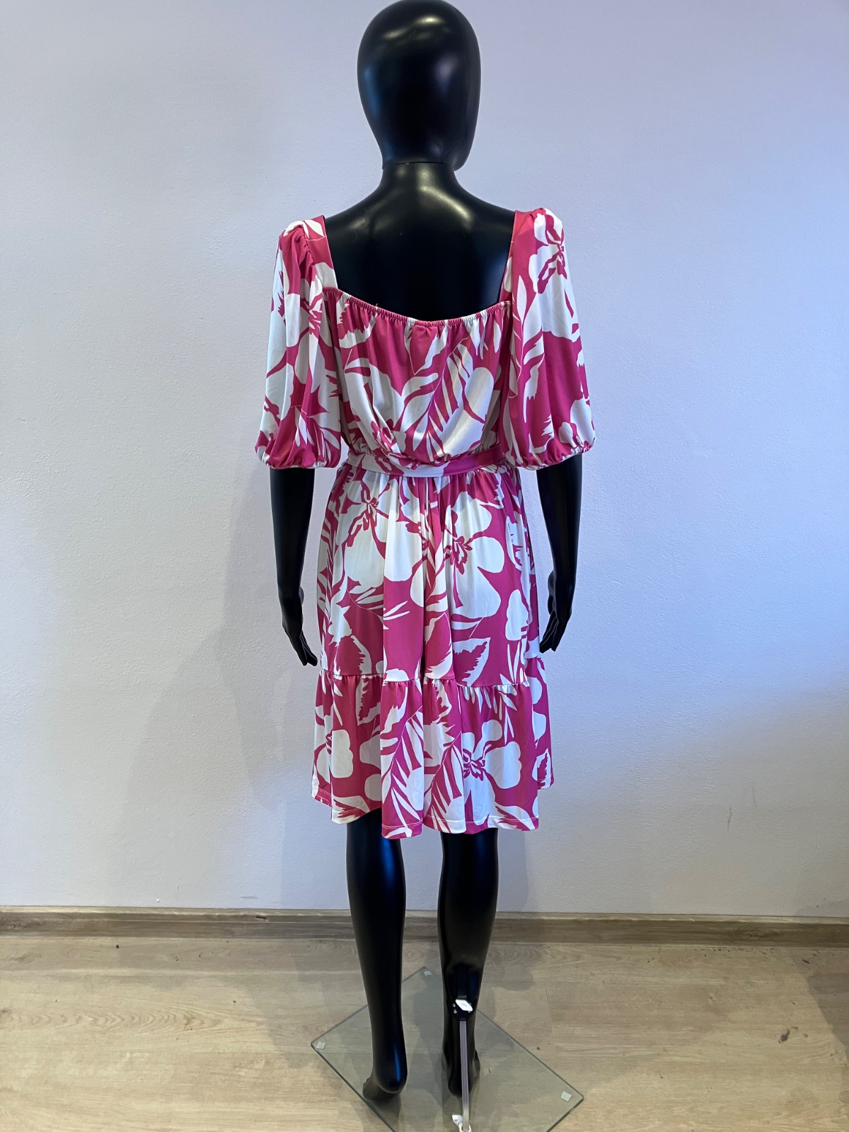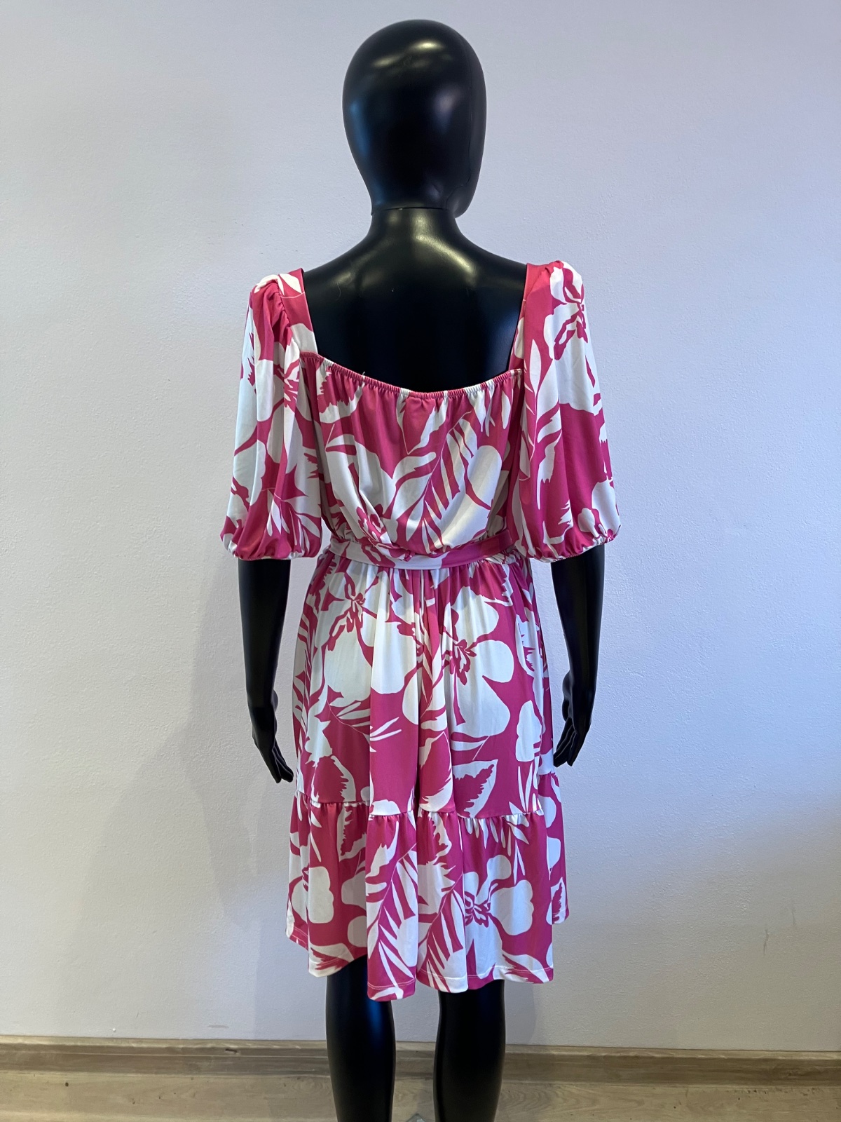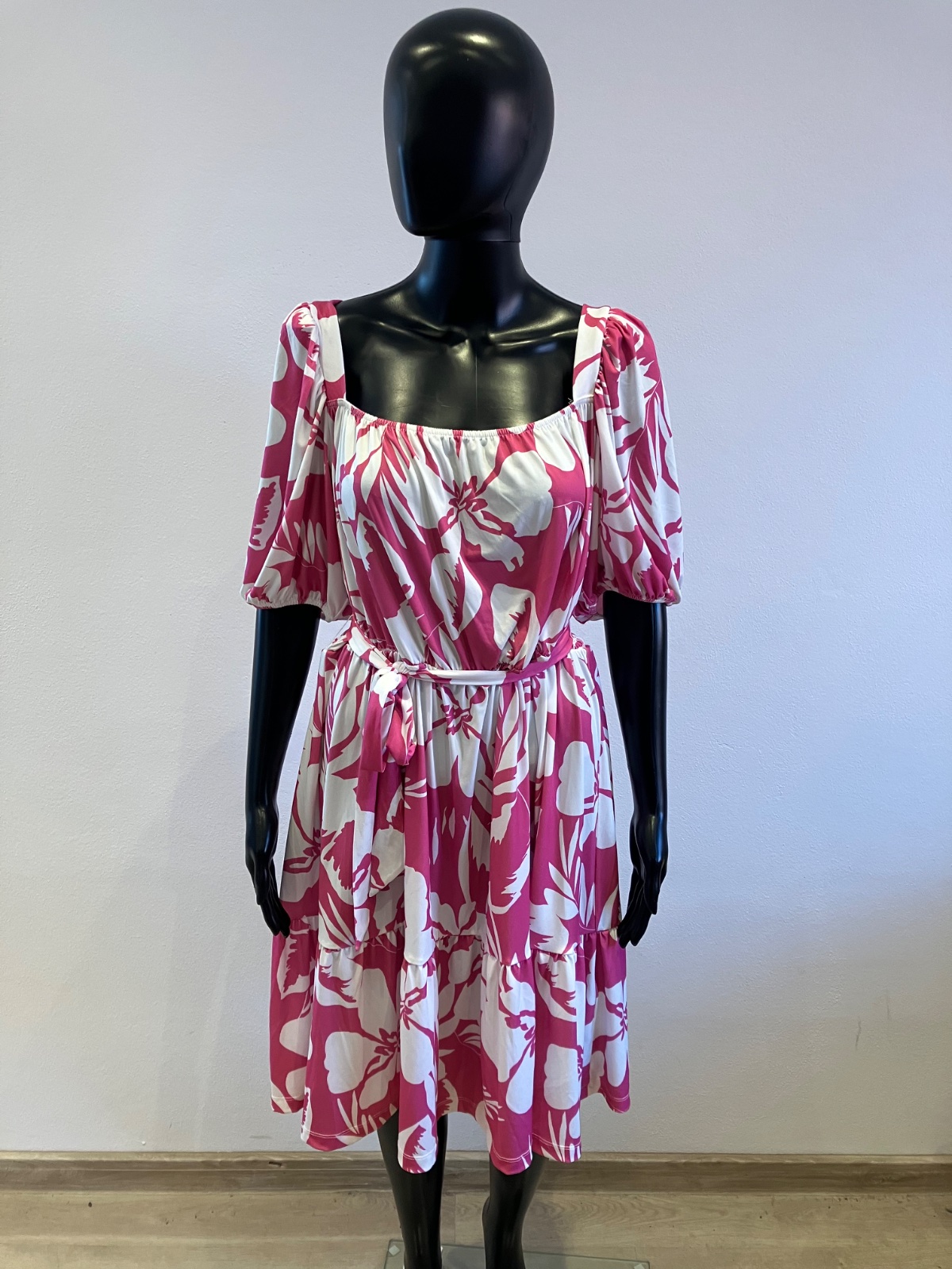 Dámske šaty s krátkym rukávom a opaskom, tenké, elastické, pás na gumu, farba bielo ružová, materiál 95%polyester 5%elastan.