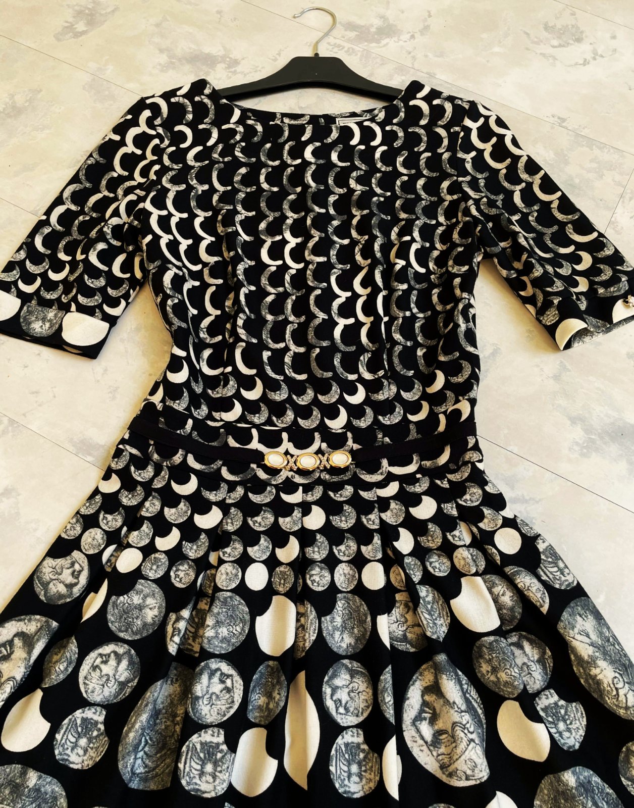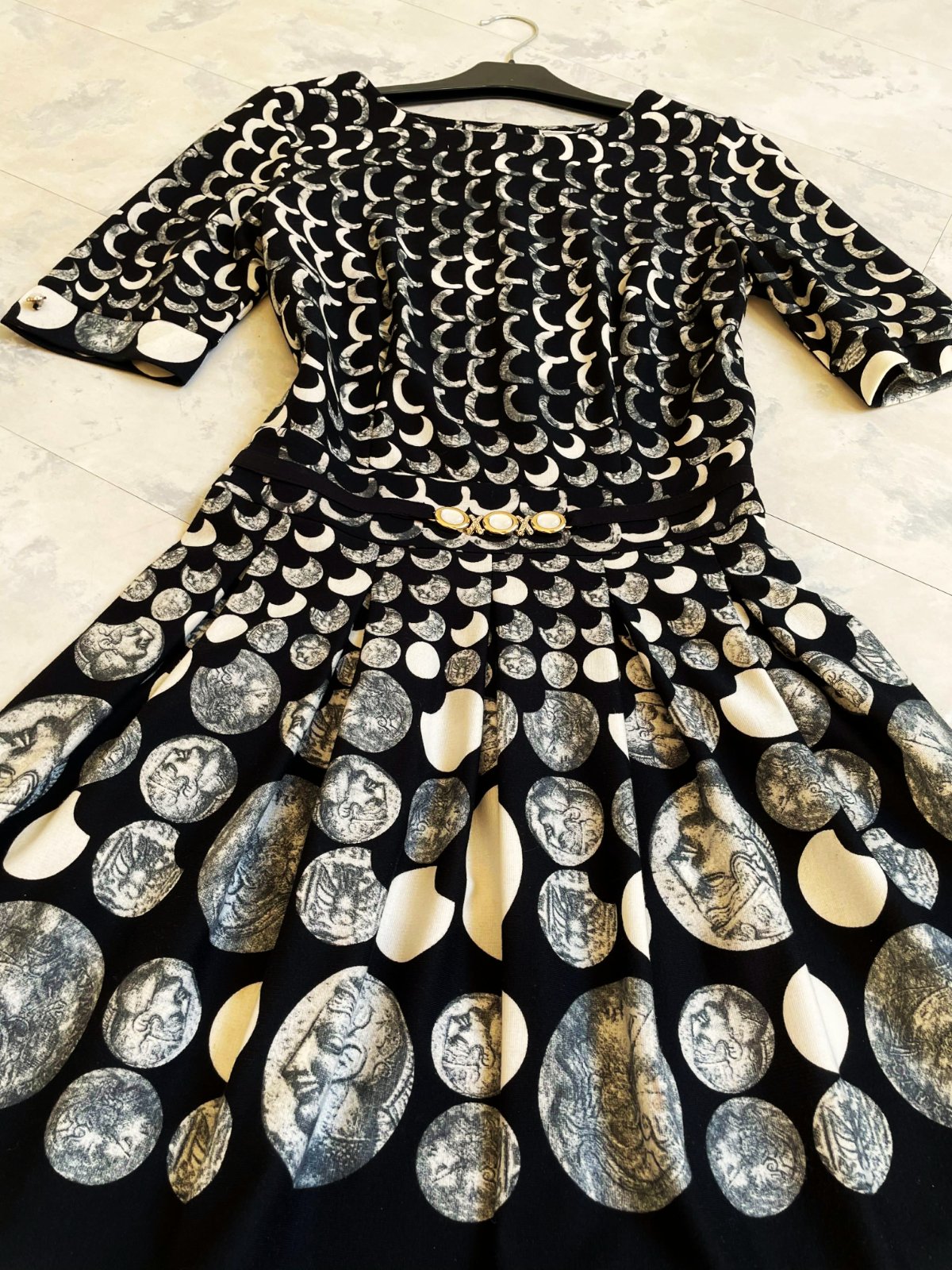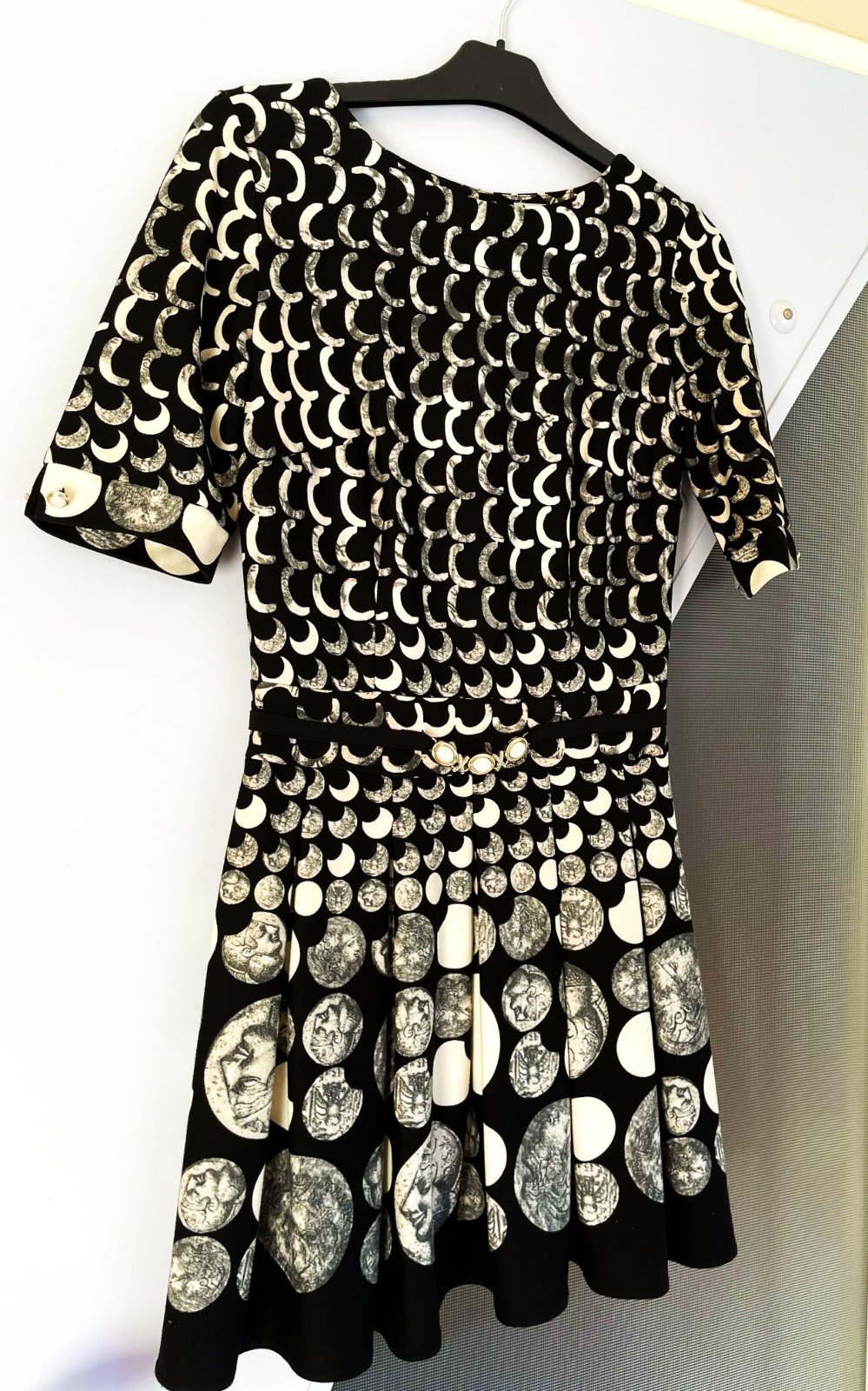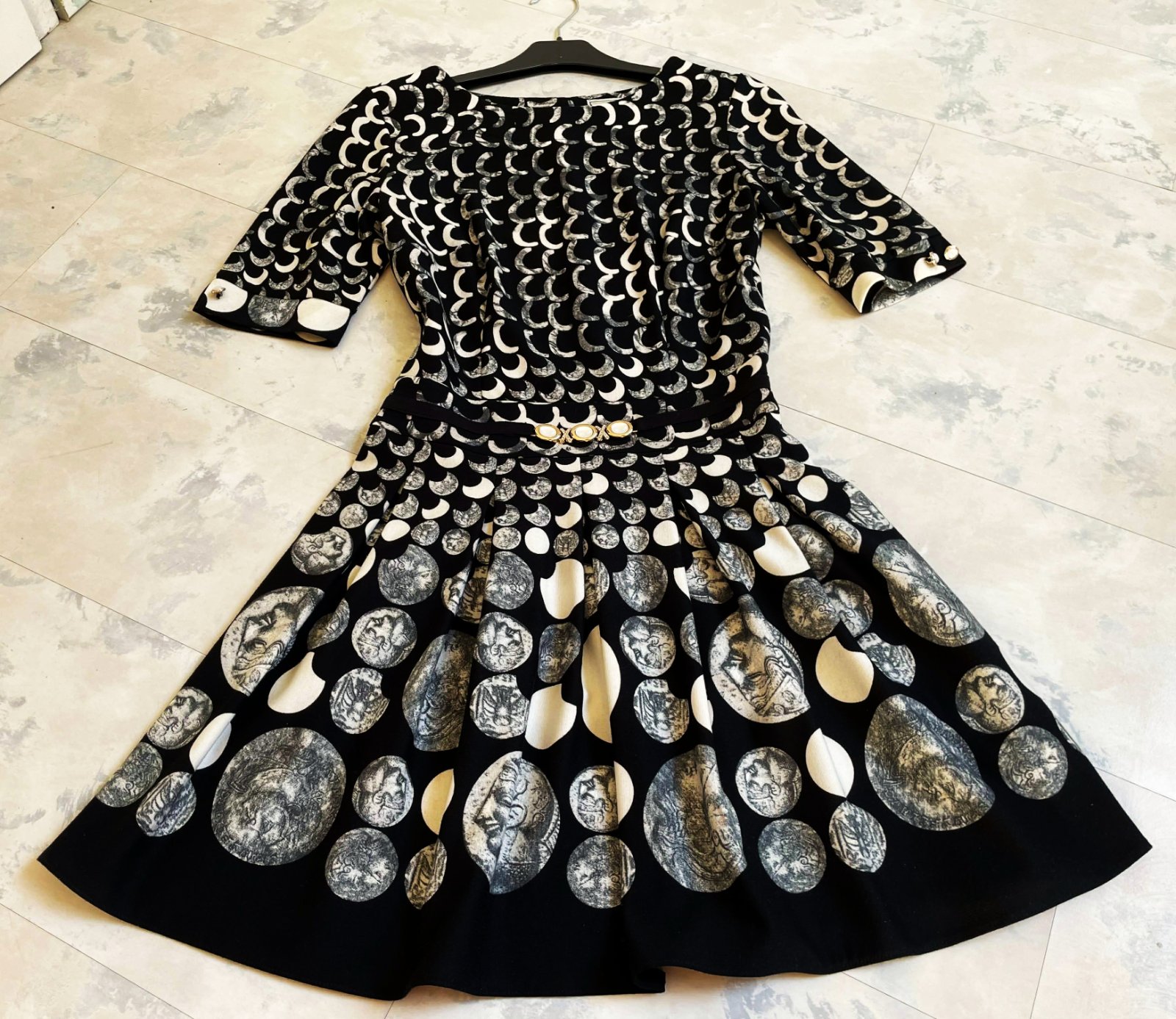 zaujímavé netuctové a nevšedné šaty s potlačou starožitných mincí, luxusného spoločenského štýlu, sukňa je zdobená motívmi mincí s profilmi historických postáv, horná časť má hustý vzor bielych polmesiacov alebo oblúkov na čiernom podklade, šaty majú vypasovaný živôtik oddelený od sukne opaskom, ktorý je zdobený tromi 3 gombíkmi, zapínanie na zips je na boku,špičková kvalita,krásny strih,pekne vytvarované, nekrčivé,veľmi zaujímavý vzor,raz oblečené