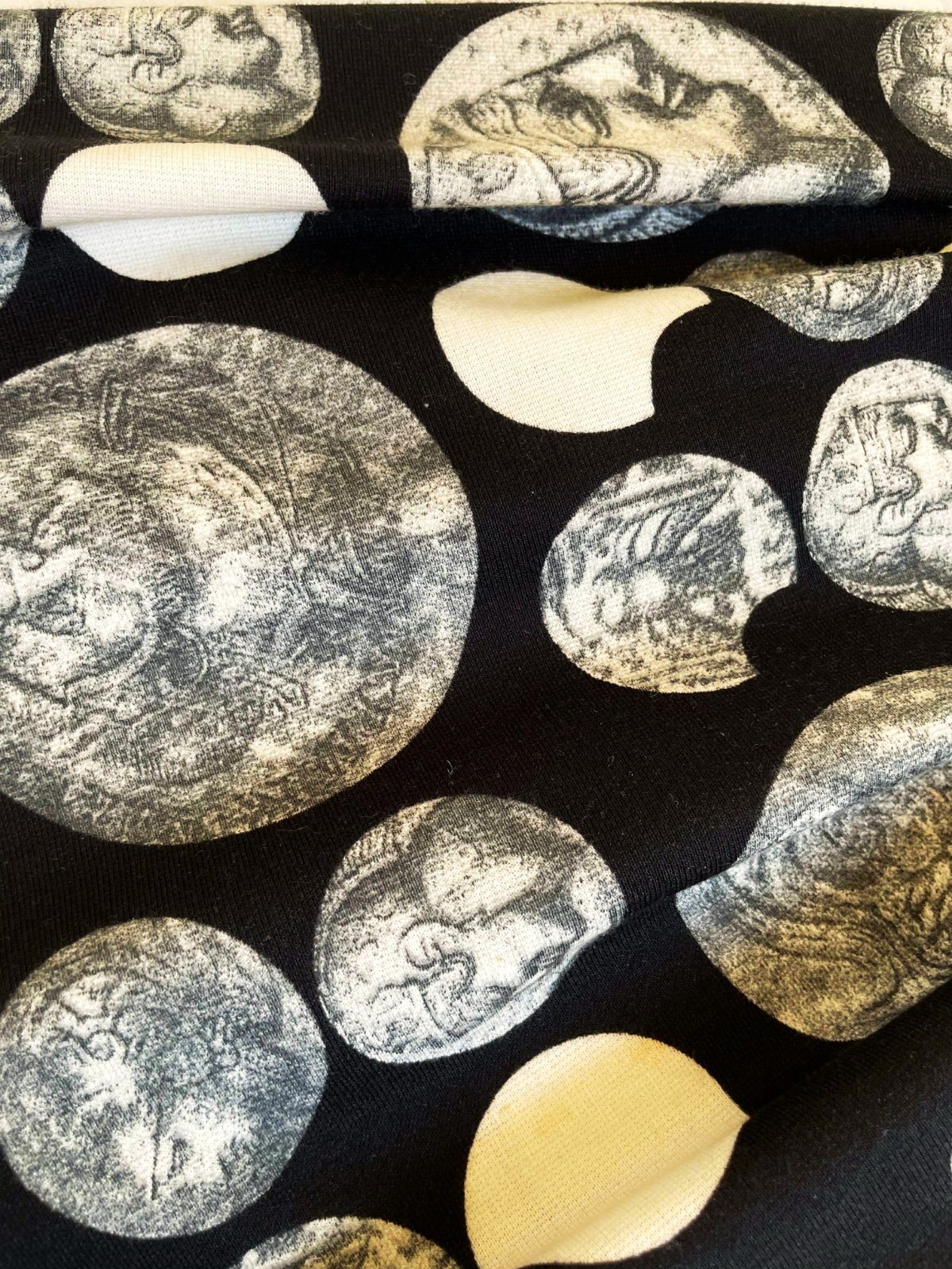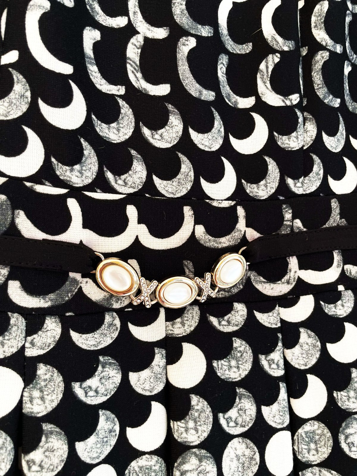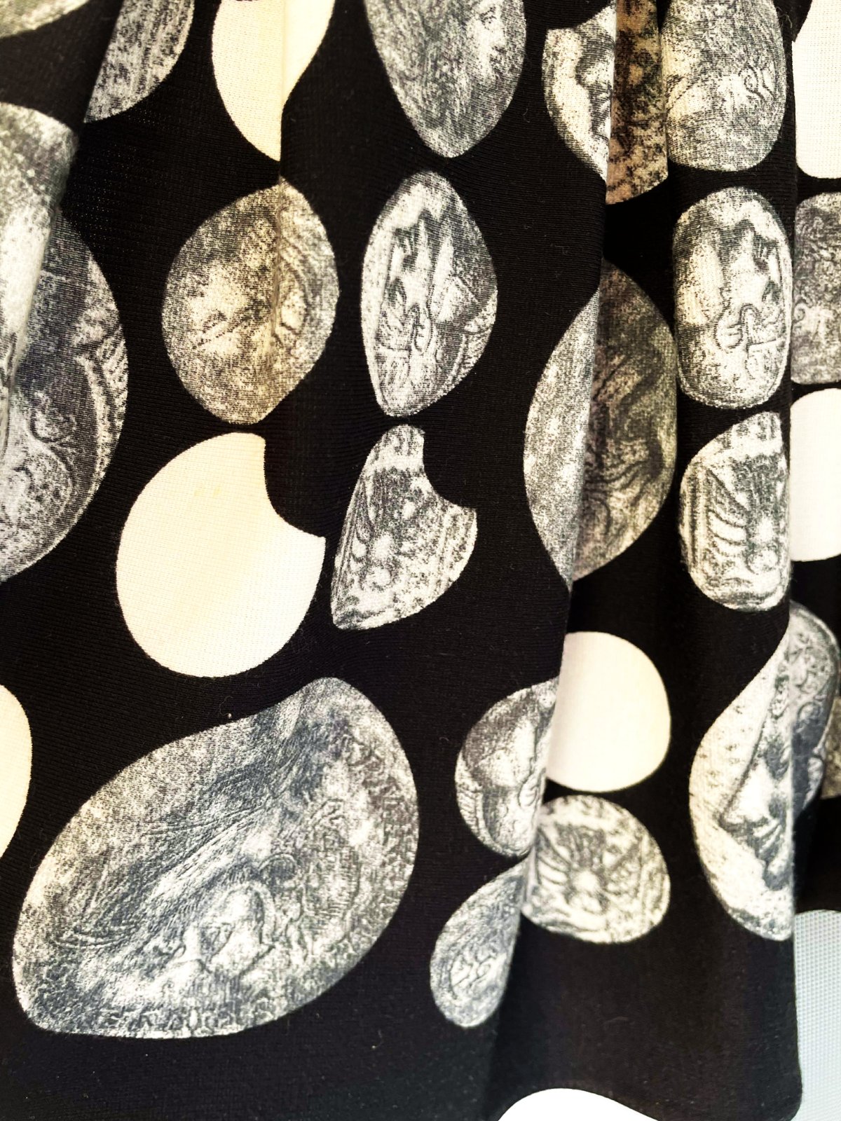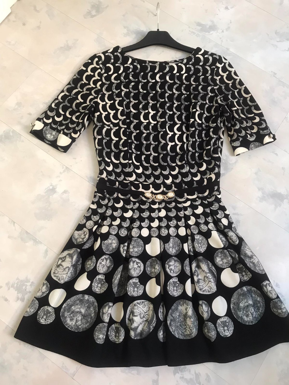 zaujímavé netuctové a nevšedné šaty s potlačou starožitných mincí, luxusného spoločenského štýlu, sukňa je zdobená motívmi mincí s profilmi historických postáv, horná časť má hustý vzor bielych polmesiacov alebo oblúkov na čiernom podklade, šaty majú vypasovaný živôtik oddelený od sukne opaskom, ktorý je zdobený tromi 3 gombíkmi, zapínanie na zips je na boku,špičková kvalita,krásny strih,pekne vytvarované, nekrčivé,veľmi zaujímavý vzor,raz oblečené