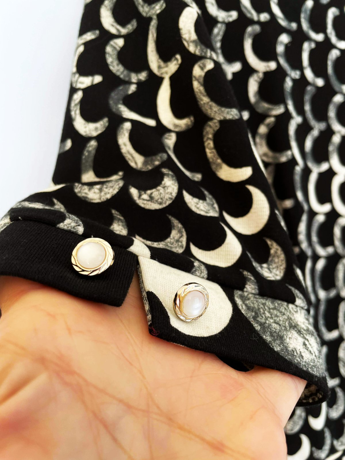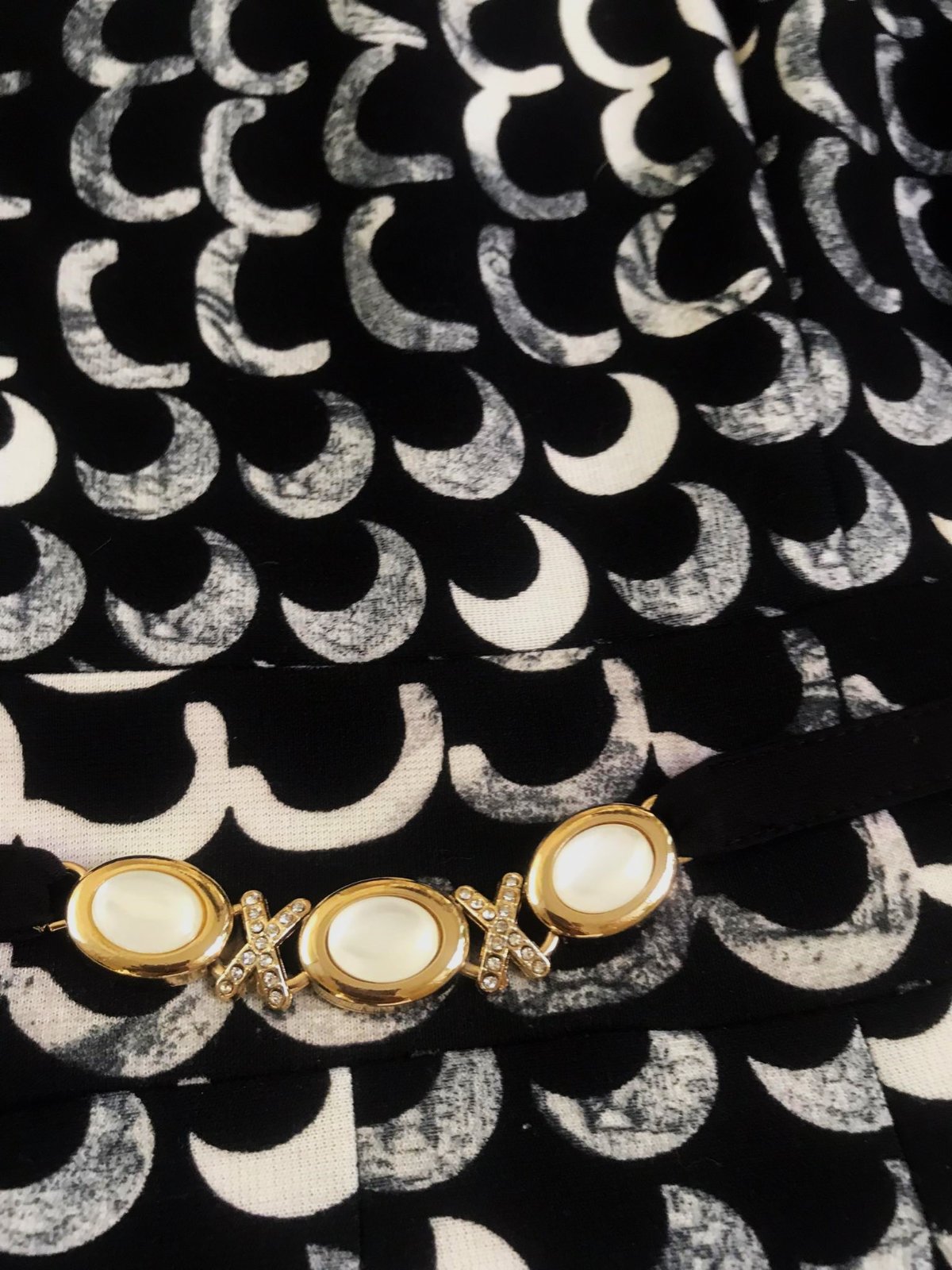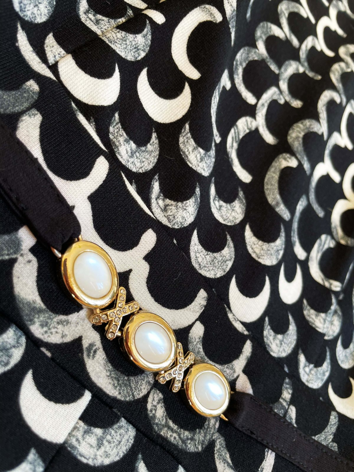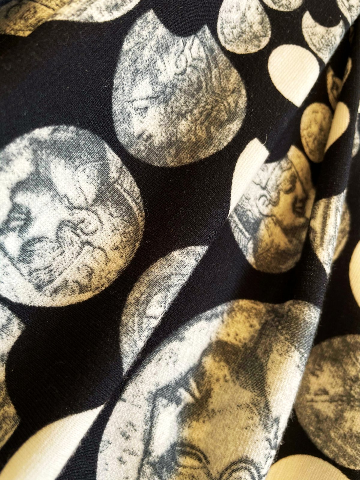 zaujímavé netuctové a nevšedné šaty s potlačou starožitných mincí, luxusného spoločenského štýlu, sukňa je zdobená motívmi mincí s profilmi historických postáv, horná časť má hustý vzor bielych polmesiacov alebo oblúkov na čiernom podklade, šaty majú vypasovaný živôtik oddelený od sukne opaskom, ktorý je zdobený tromi 3 gombíkmi, zapínanie na zips je na boku,špičková kvalita,krásny strih,pekne vytvarované, nekrčivé,veľmi zaujímavý vzor,raz oblečené