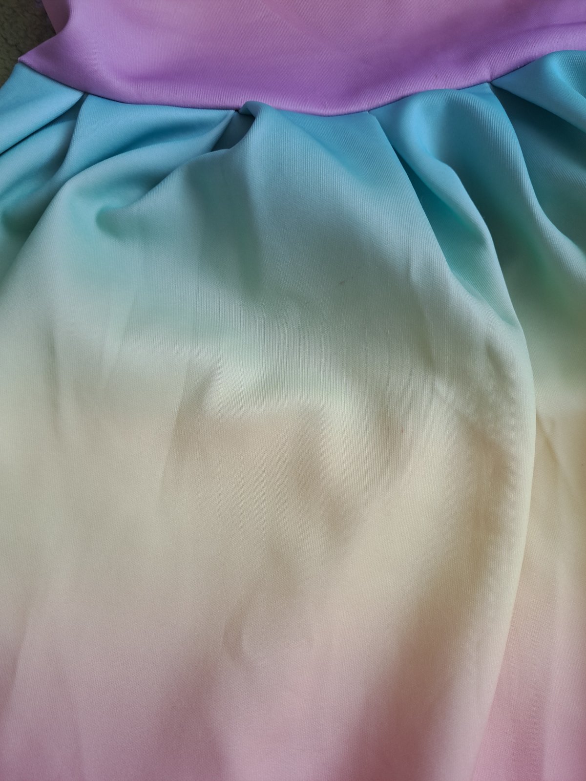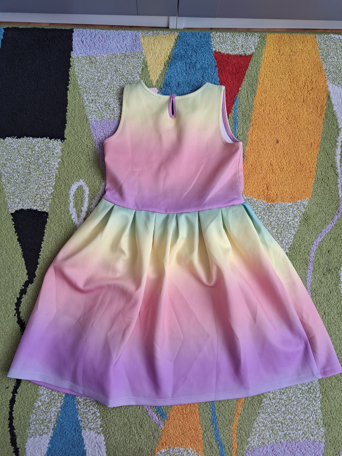 Dúhové šaty z pevnejšieho materiálu. Sú na nich malé bodky, ale fakt maličké, snažila som sa ich odfotiť, ale na fotkách ich ani nevidieť. Zapínanie vzadu na jeden gombík.