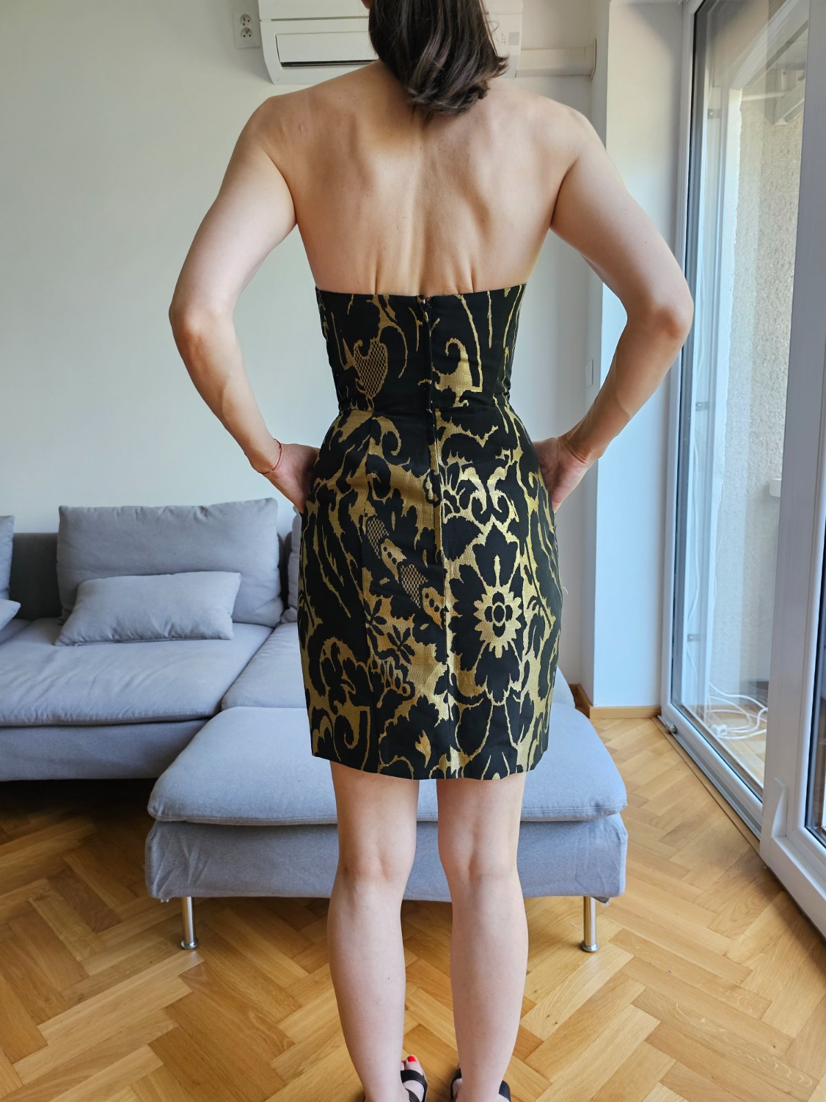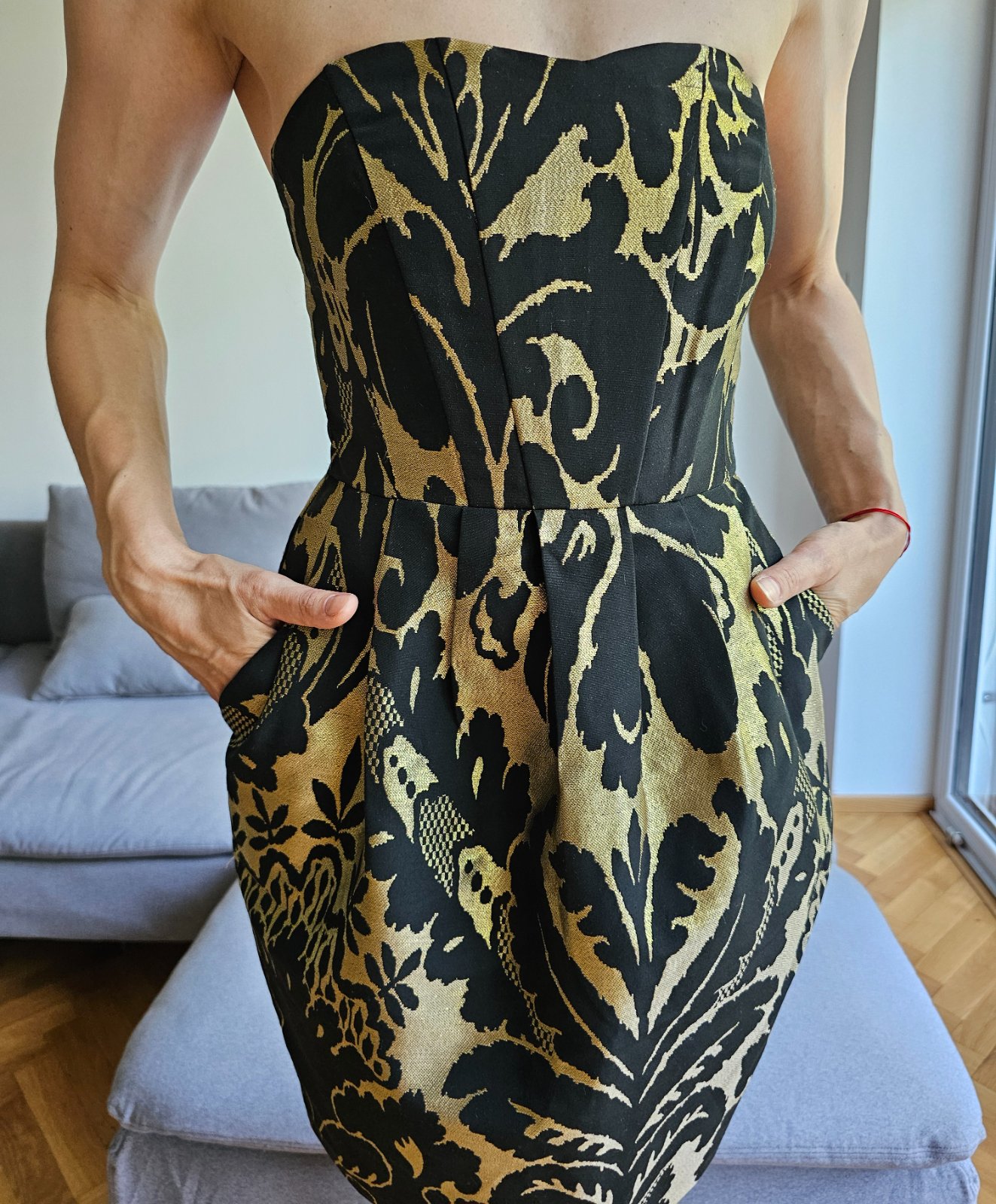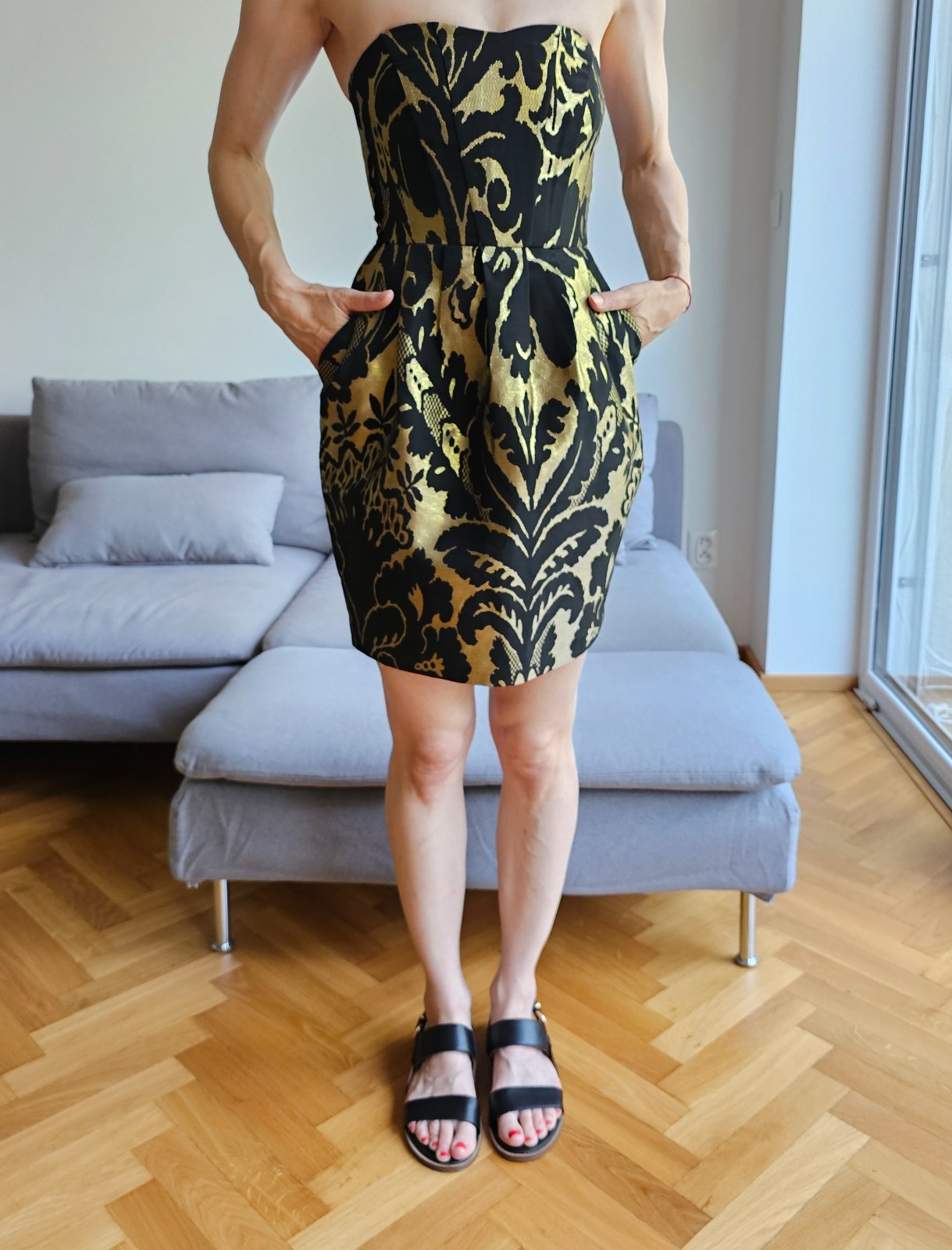 Reálne krásna zlatá farba, imitácia brokatu. Šaty vyzerajú draho, napriek tomu že je to značka H&M