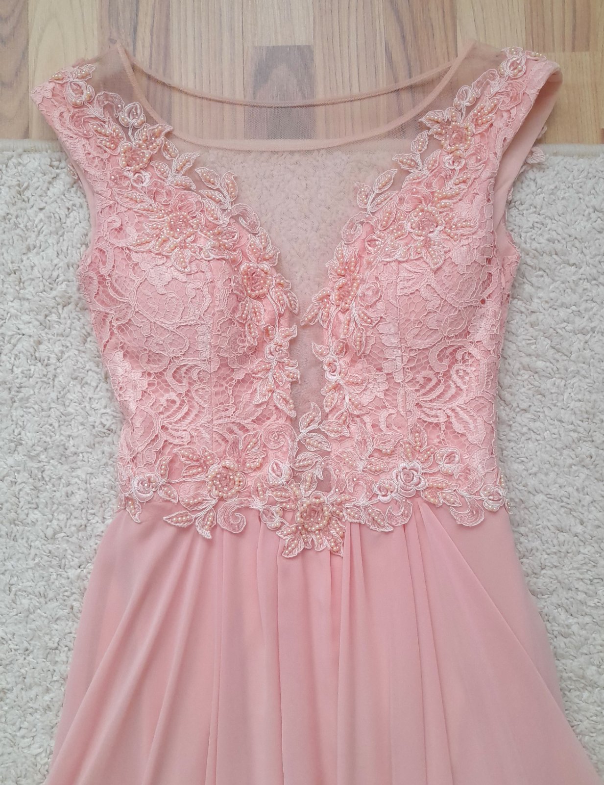top stav, meruňkové, raz oblečené, podšité, hrudník vystužený, spodná časť šifón, dĺžka 140cm, šírka v prestrihovanej časti 35x2cm, hrudník do 85cm, veľ.píše 38, skôr 36