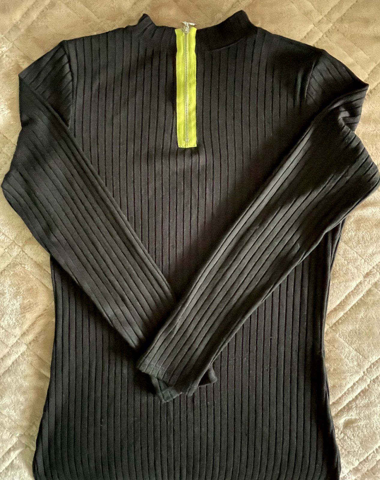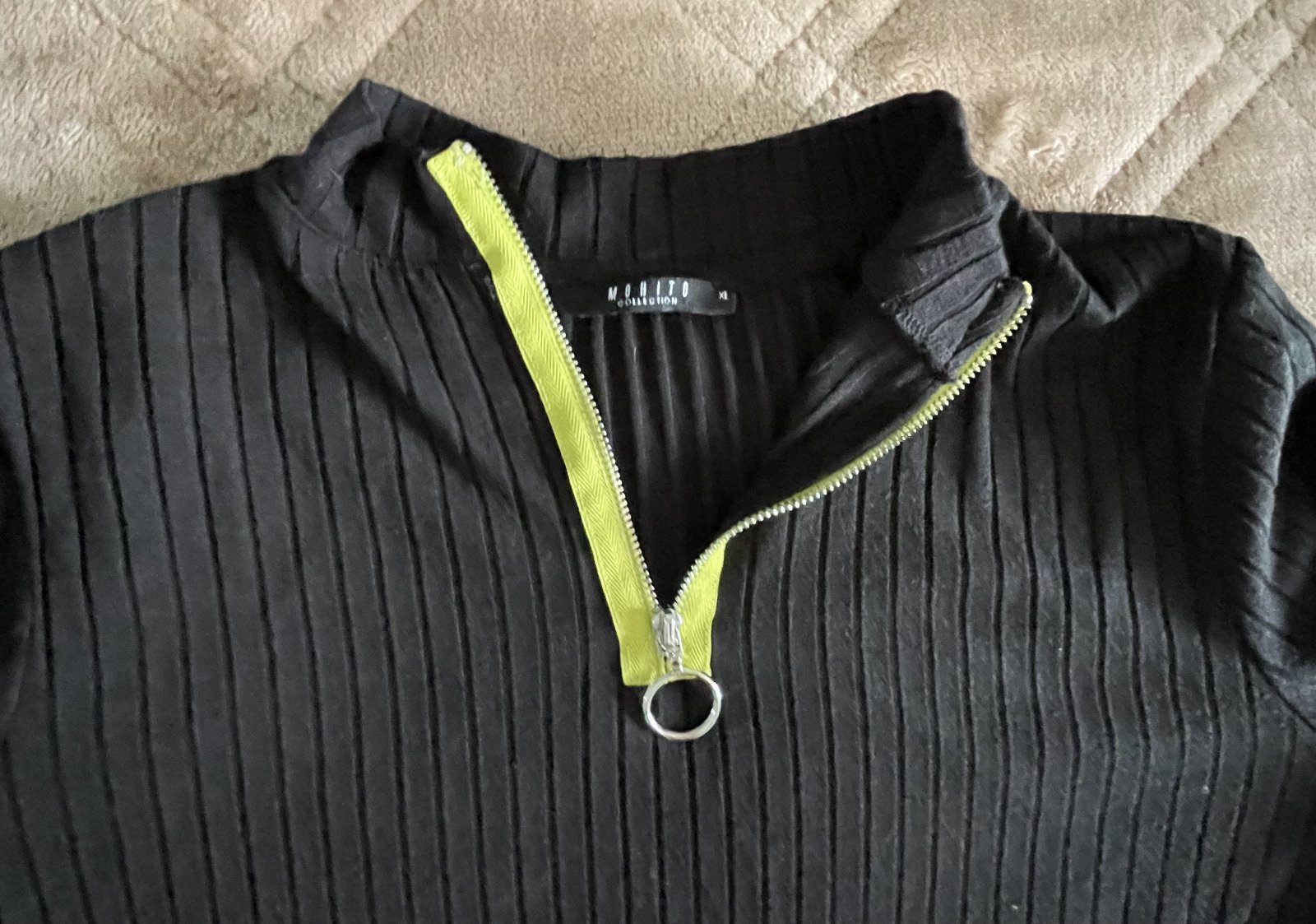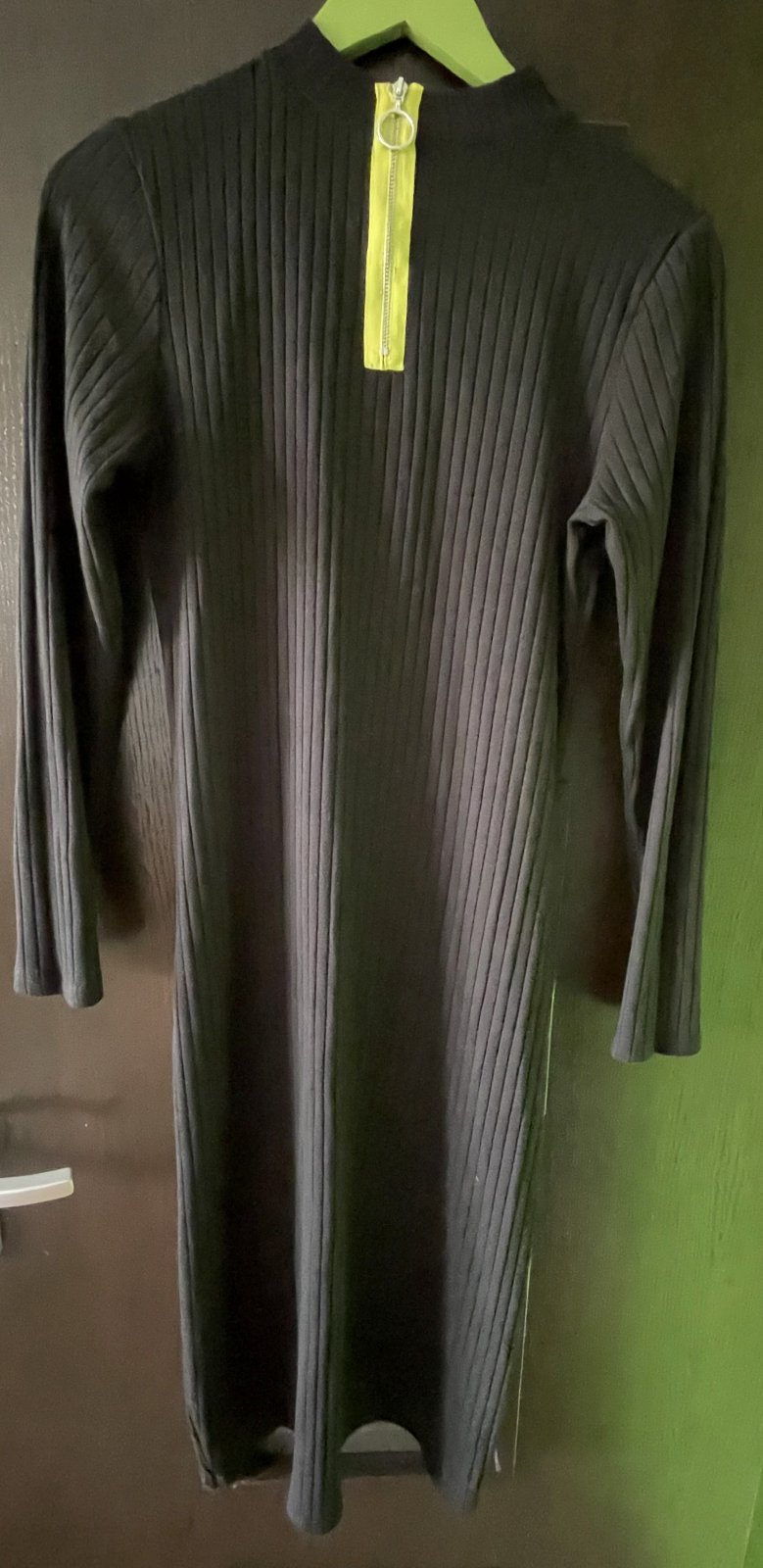 Dlhé priliehavé elastické čierne šaty so zipsom ku krku, so stojačikom. Značka MOHITO. Veľkosť XL. Rozmery: Dĺžka 113 cm, šírka v podpazuší 2x 47 cm v nenatiahnutom stave, dĺžka rukáva od ramena 59 cm, od podpazušia 47 cm.