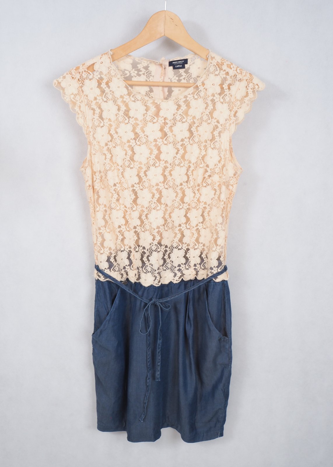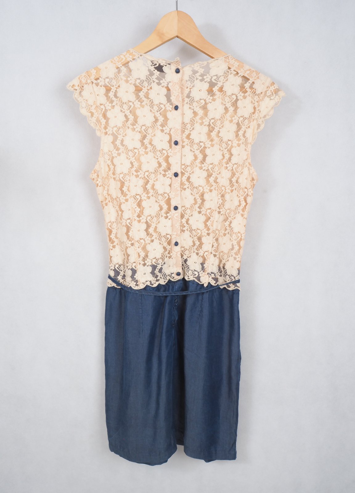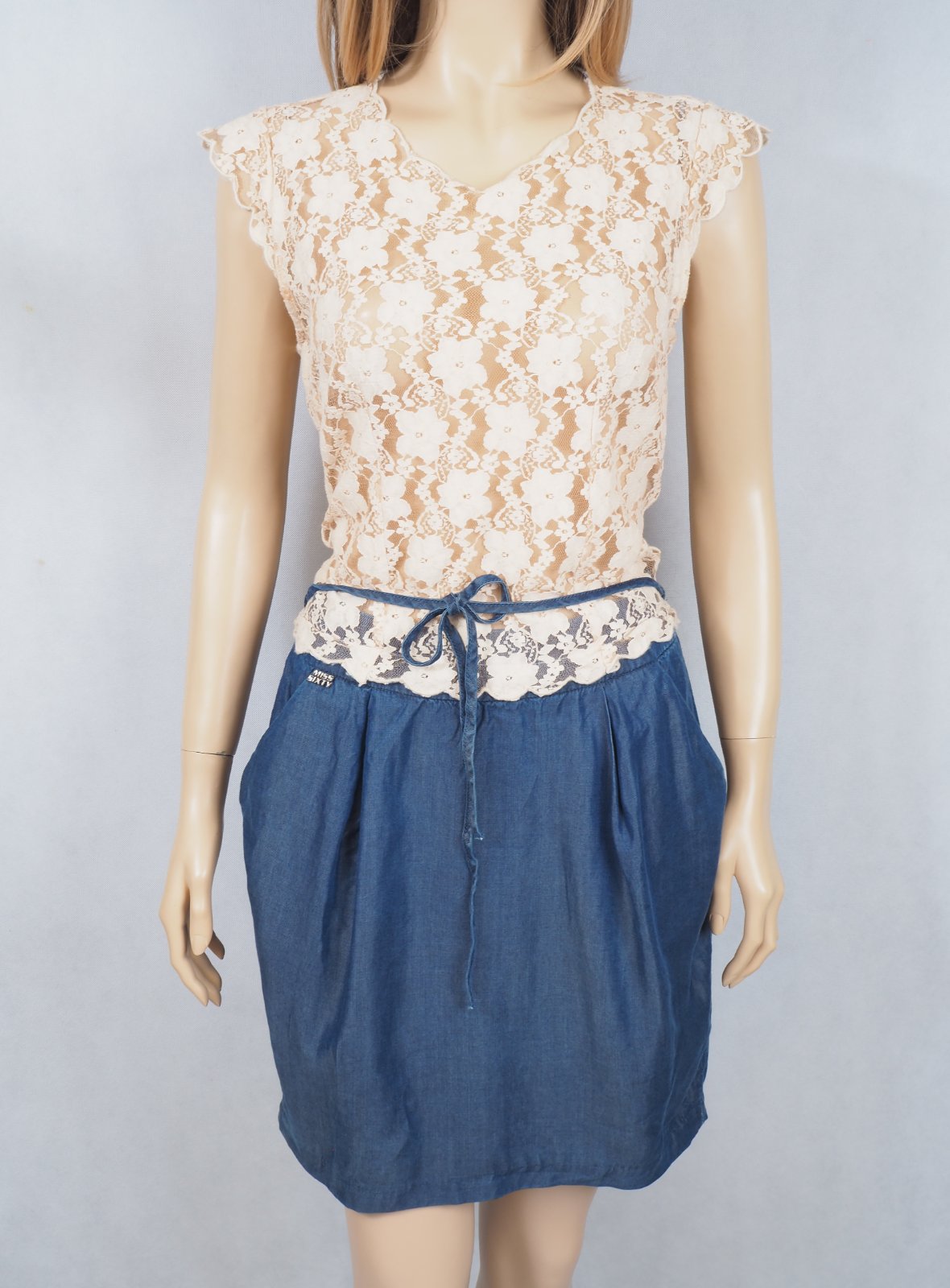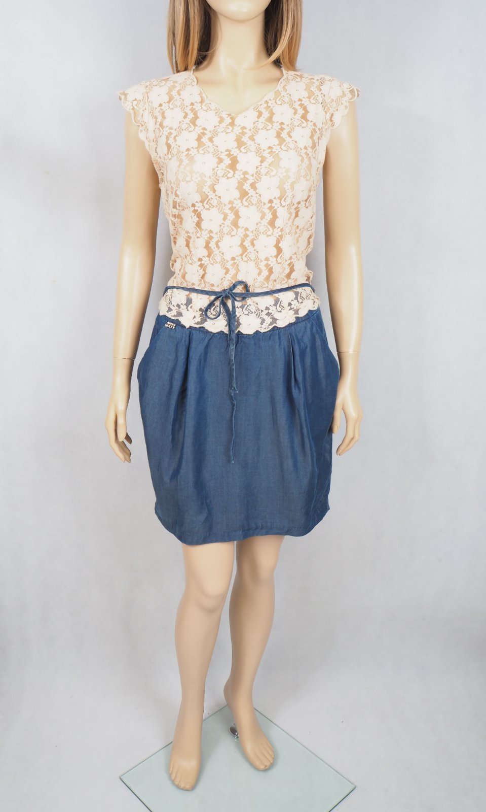 Kvalitné letné šaty, spodok riflového vzhľadu, všité vrecká, zvršok béžový čipkovaný transparentný, zapínanie vzadu na gombíky, materiál zvršok 75% bavlna, 25% nylon, sukňová čať 100% tencel, super stav.