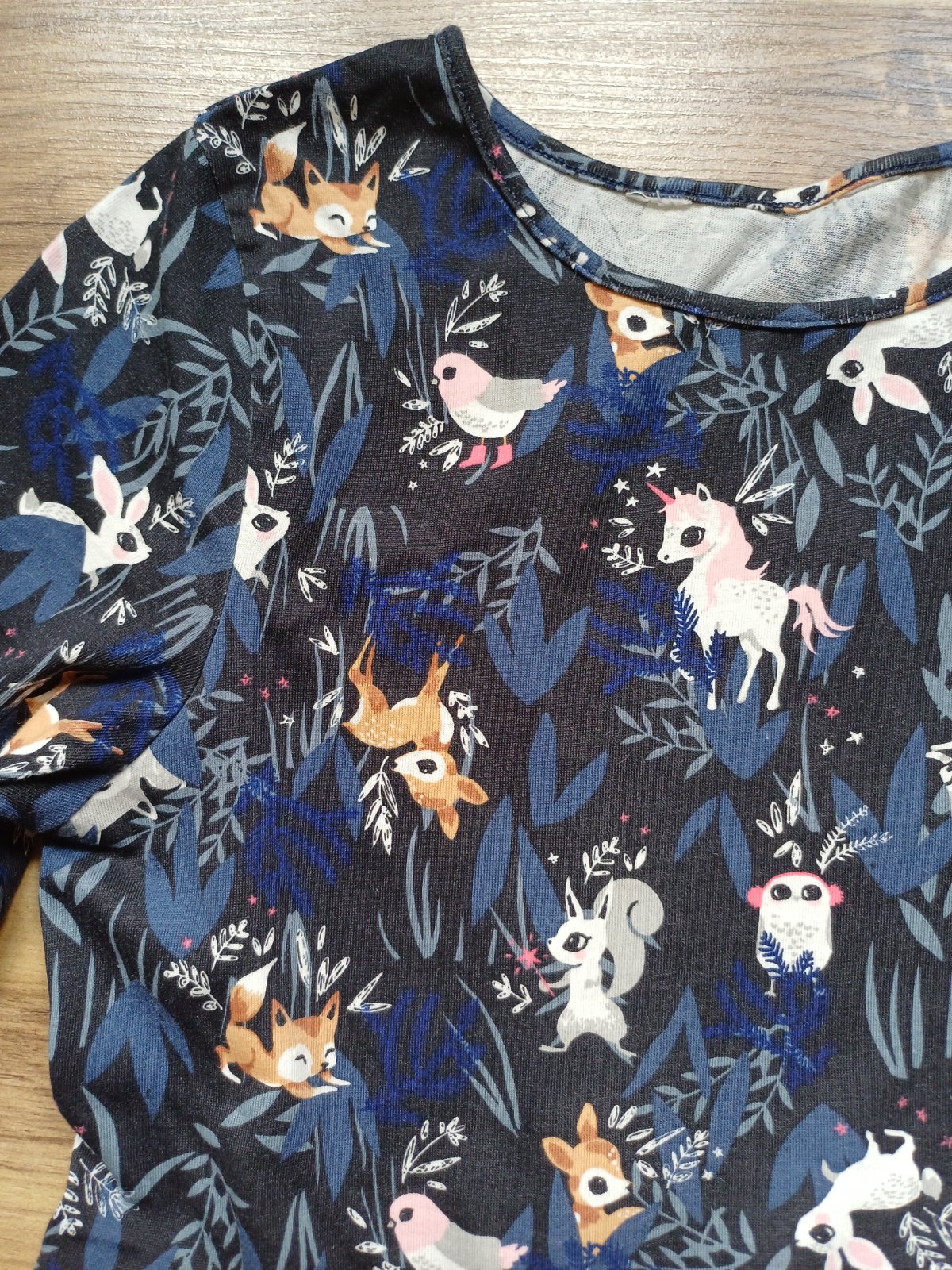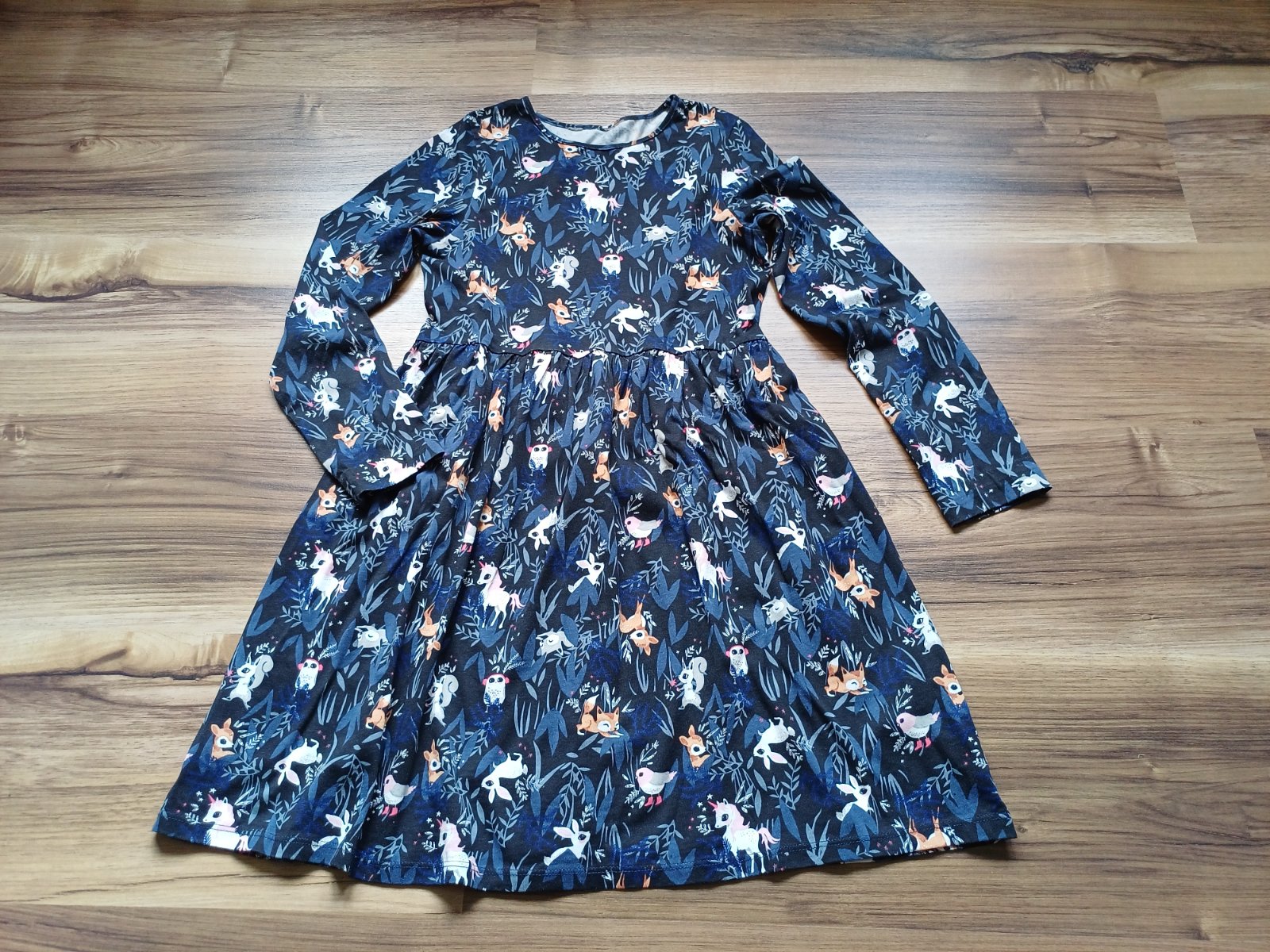 Minimálne nosené, nepoškodené šaty, výborný stav, 100% bavlna, nositeľné do veľkosti 146, celková dĺžka 76 cm, šírka pod pazuchami 2 x 36 cm, rukáv od pleca 51 cm.