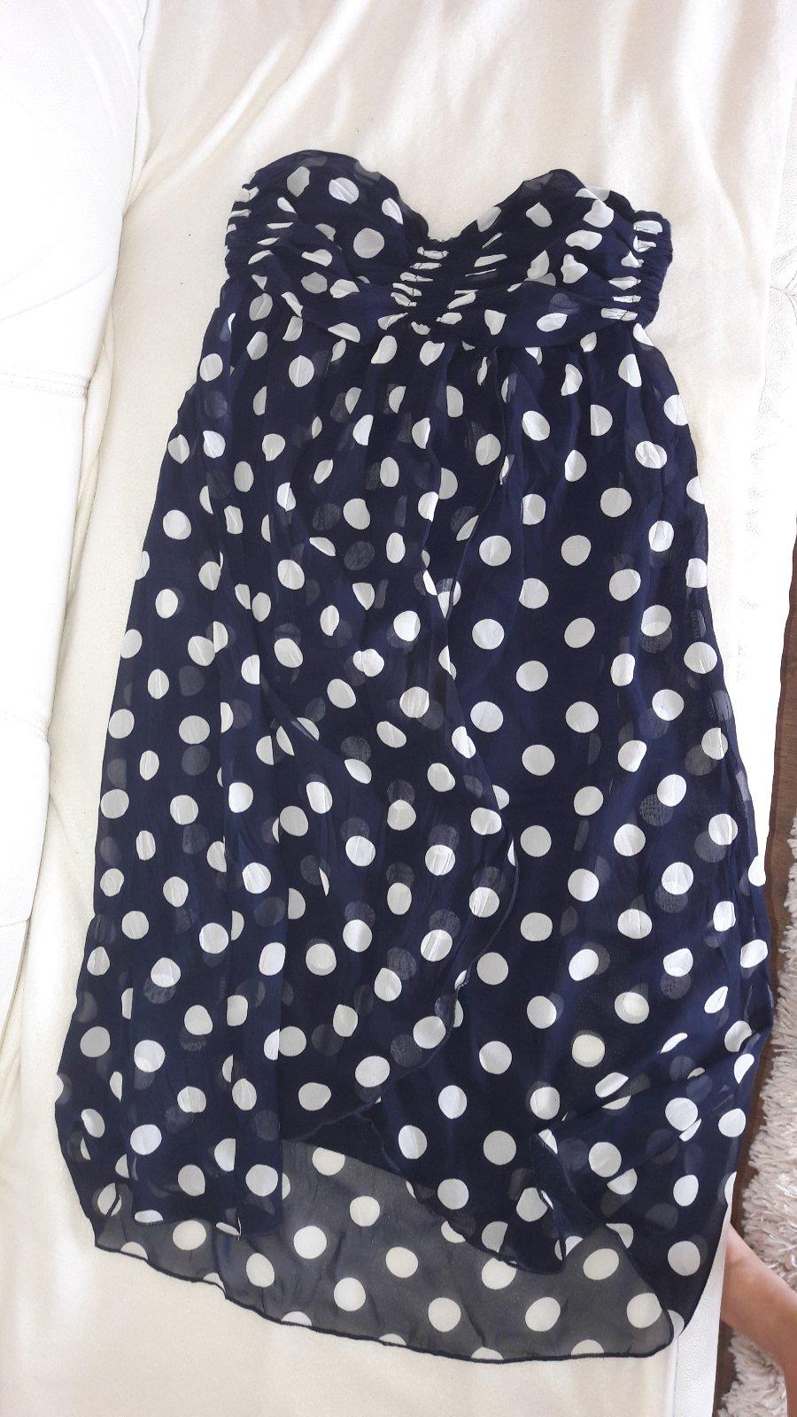 Tmavomodré šaty s bielymi bodkami, krásne ukážu na postave, vhodné aj na bežné nosenie, ale kľudne sa môžu obliecť aj na oslavu. Pohodlné, príjemné, žiaľ, mne už malé. Nosené, moje obľúbené, veľkos...