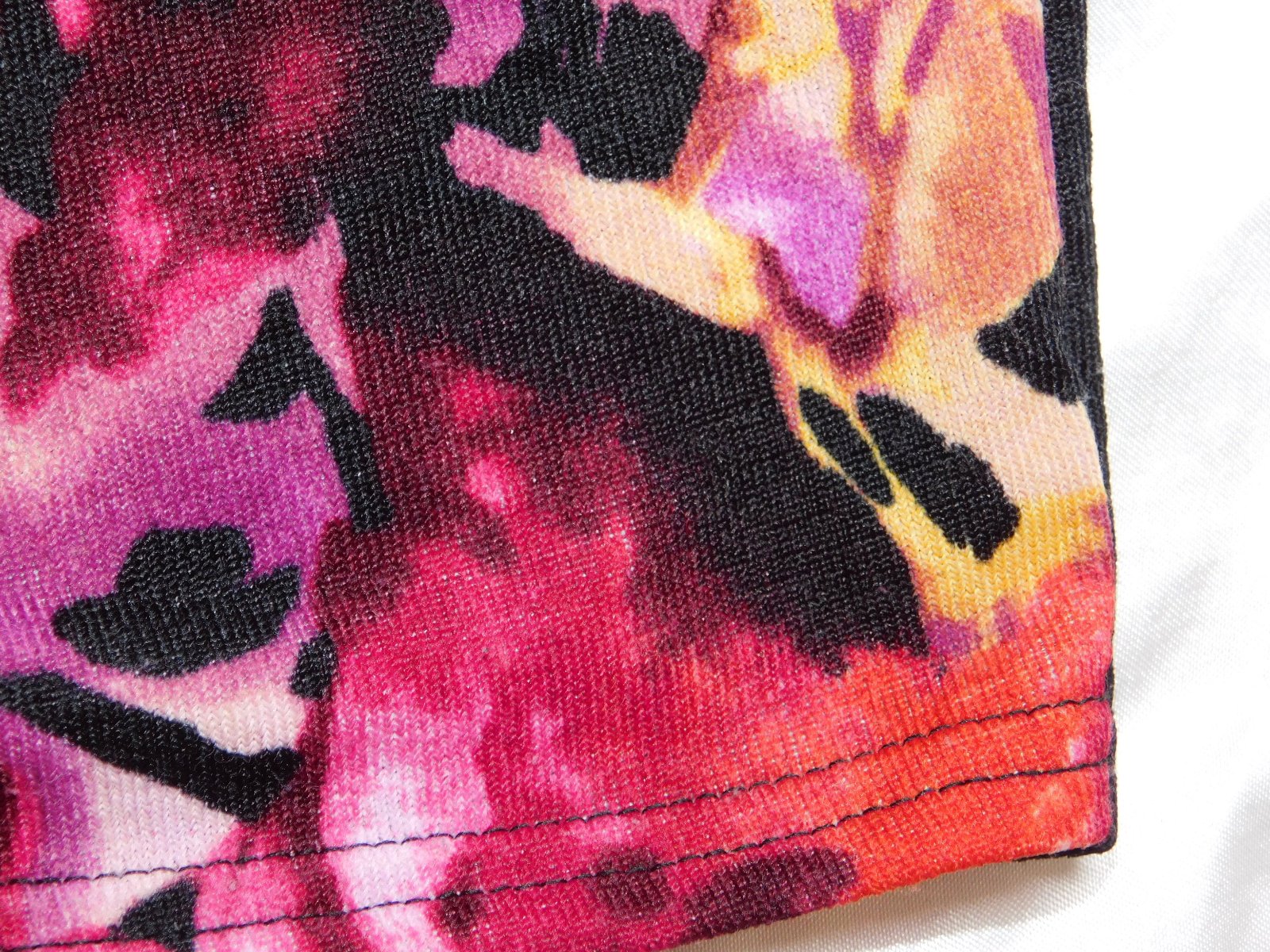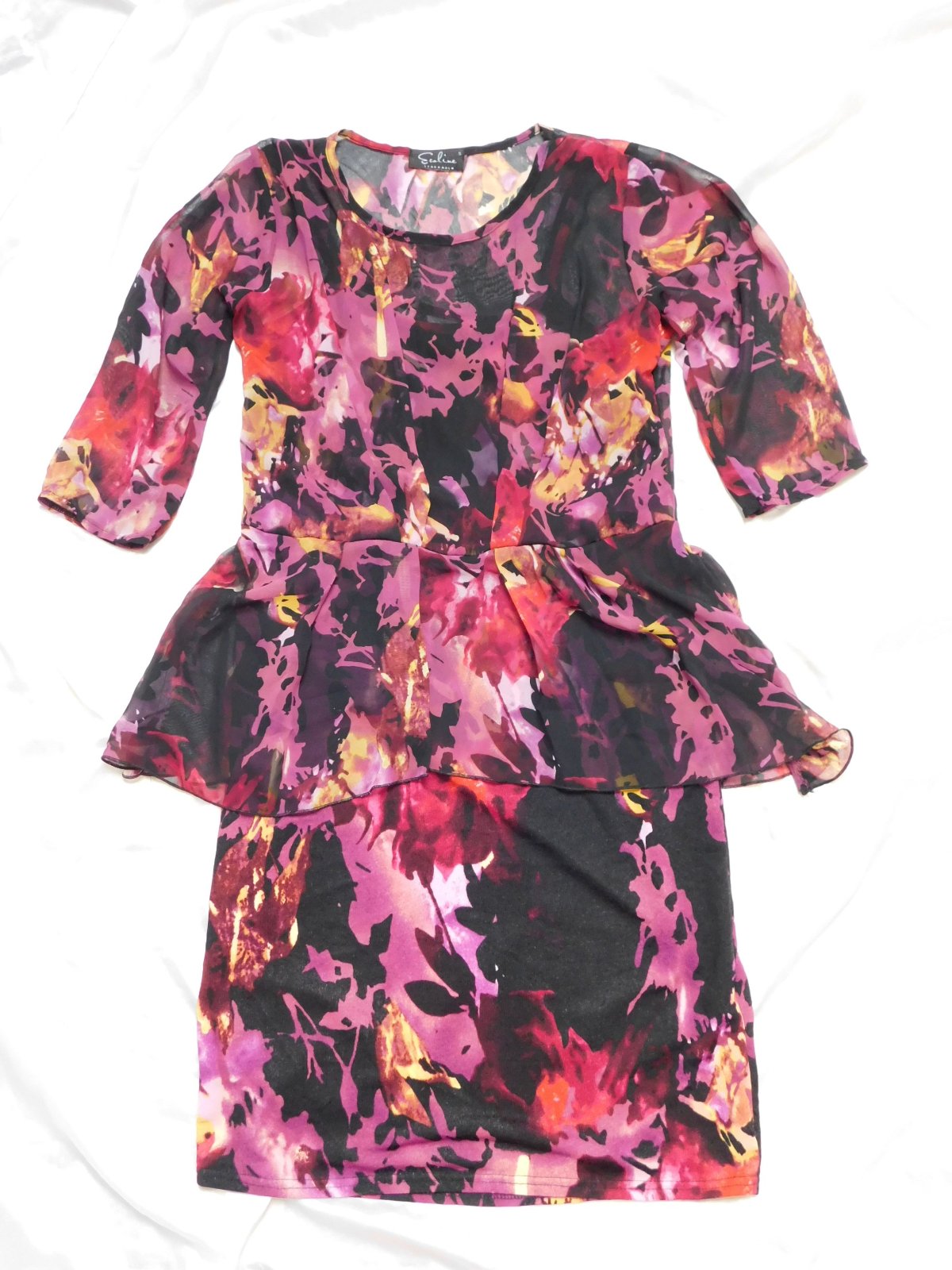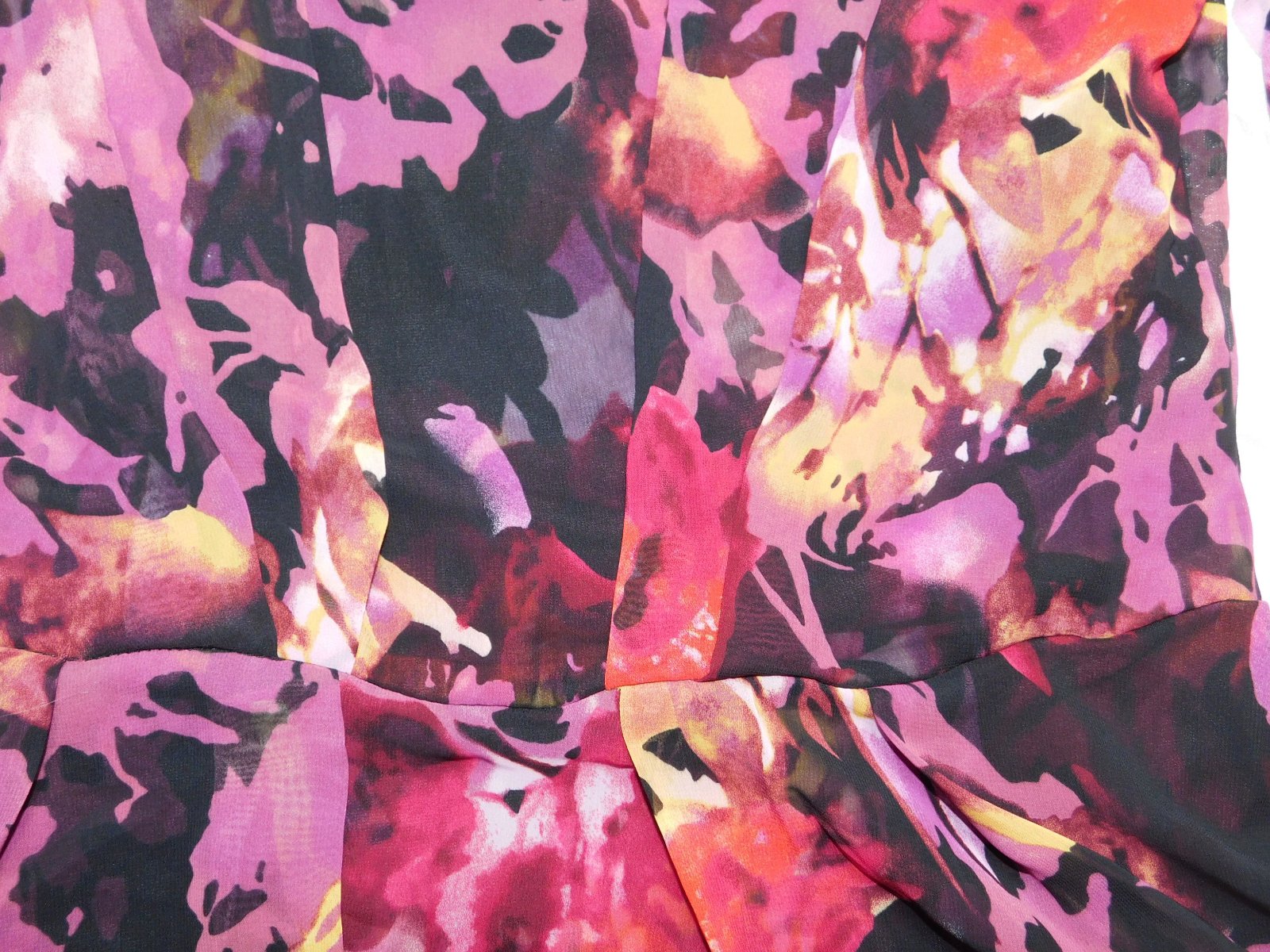 Luxusne velmi pekne saty, so vzorom, dvojity vzhlad, kombinovane z dvoch latok/šifin + uplet/.60%viskoza, 35%polyerster, 5%elastan.sukna po bokoch bola zizena na 2cm, da sa to vratit do povod.stavu, inak nove.se29