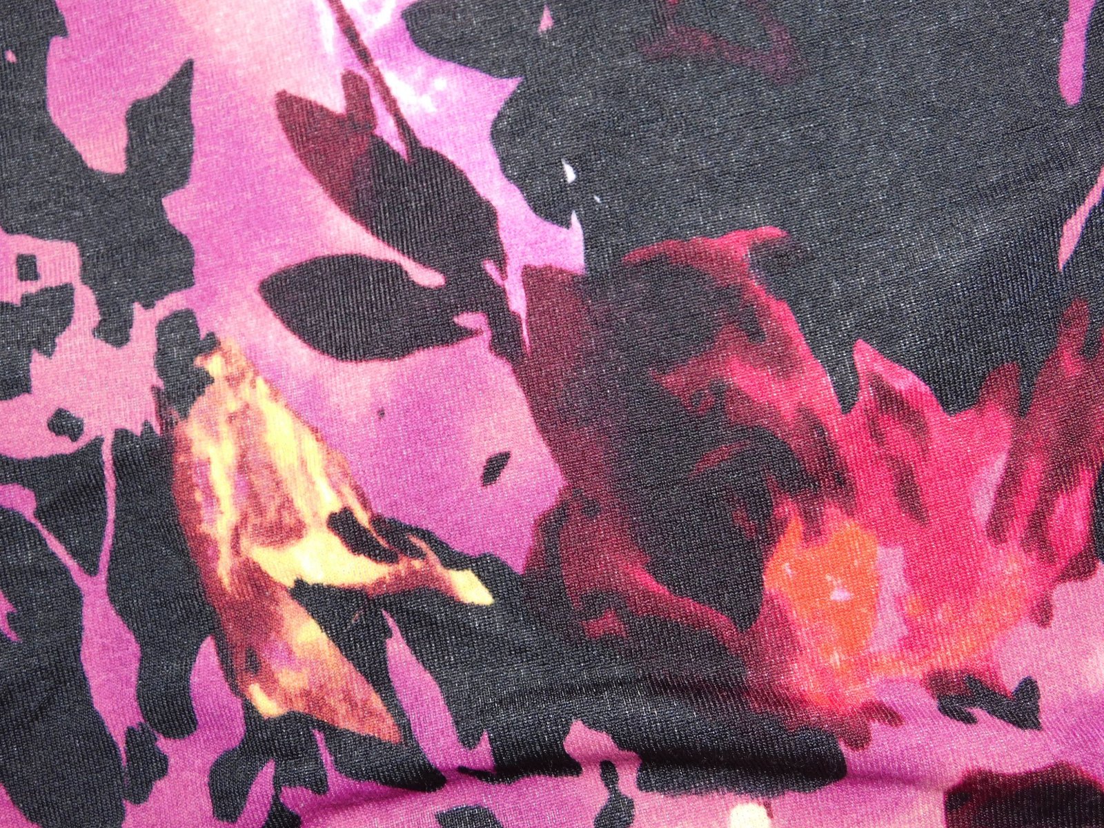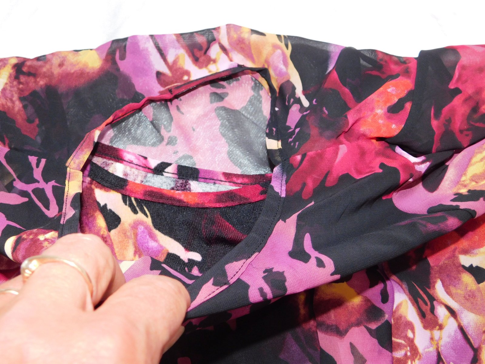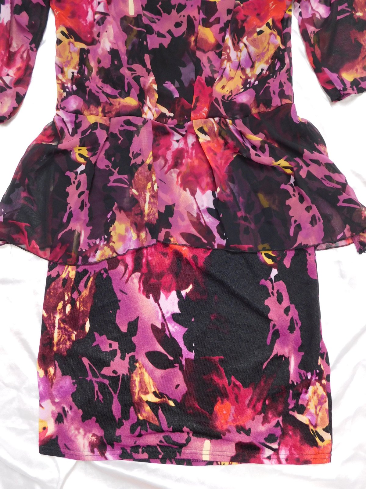 Luxusne velmi pekne saty, so vzorom, dvojity vzhlad, kombinovane z dvoch latok/šifin + uplet/.60%viskoza, 35%polyerster, 5%elastan.sukna po bokoch bola zizena na 2cm, da sa to vratit do povod.stavu, inak nove.se29
