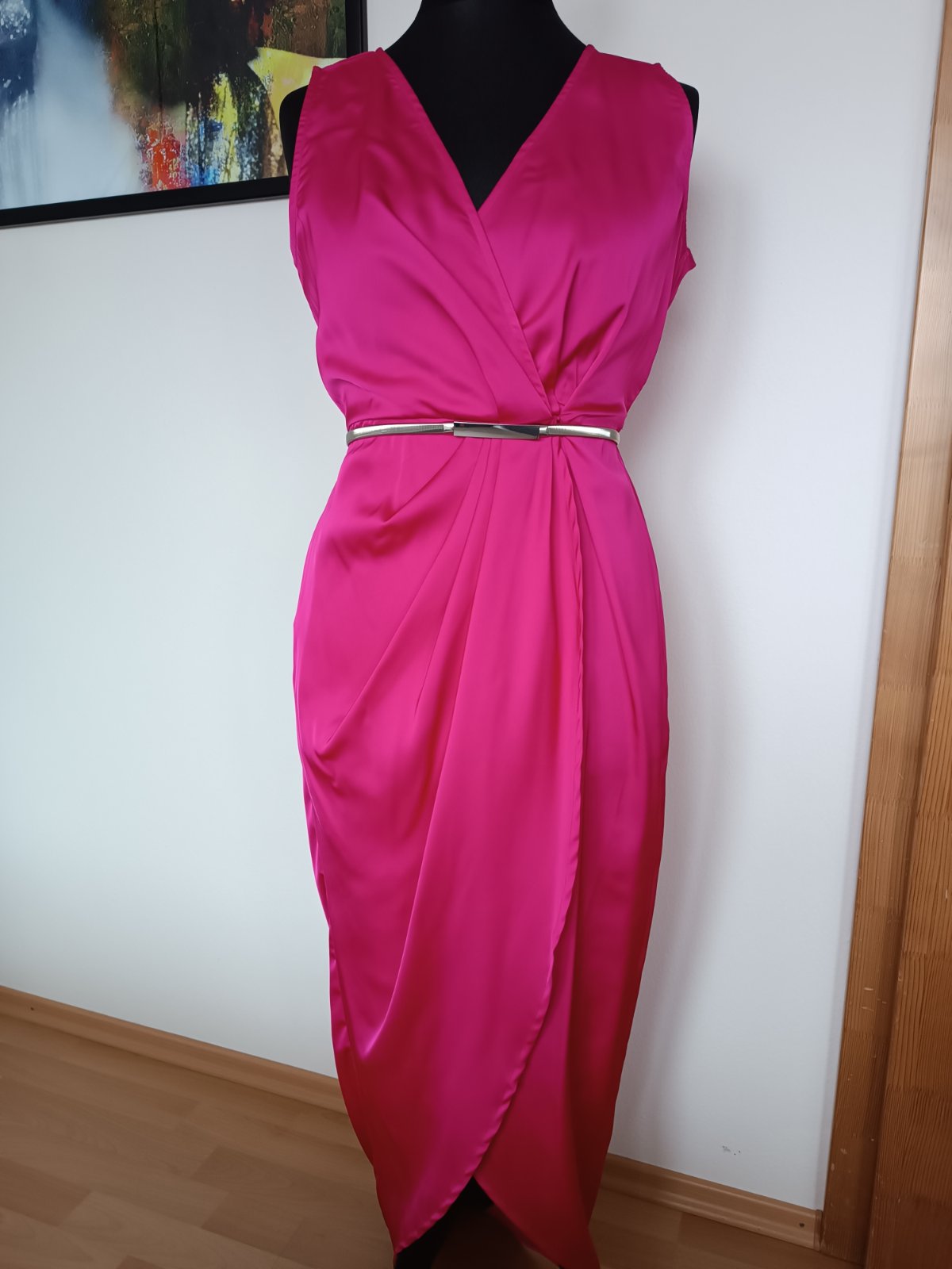Šaty nové nepoužité v páse sú na gumu a bez opasku. Na šatoch píše M ale skôr sú na veľkosť L. Obvod hrude 96cm, obvod pása 74cm(keďže sú na gumu tak aj viac) obvod bokov 100cm a dĺžka šiat 140cm.