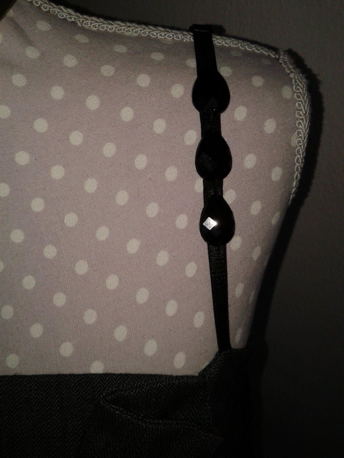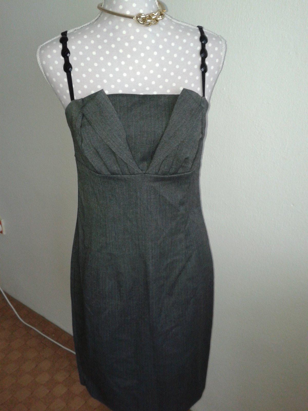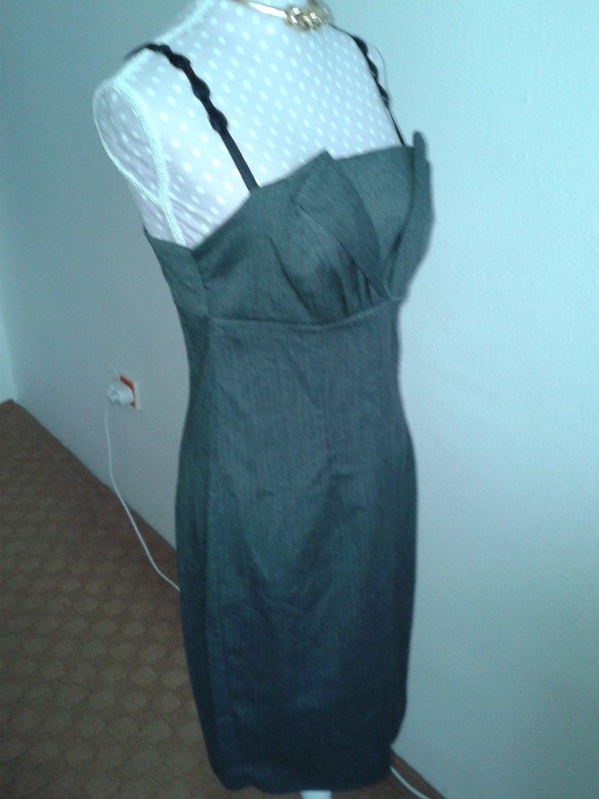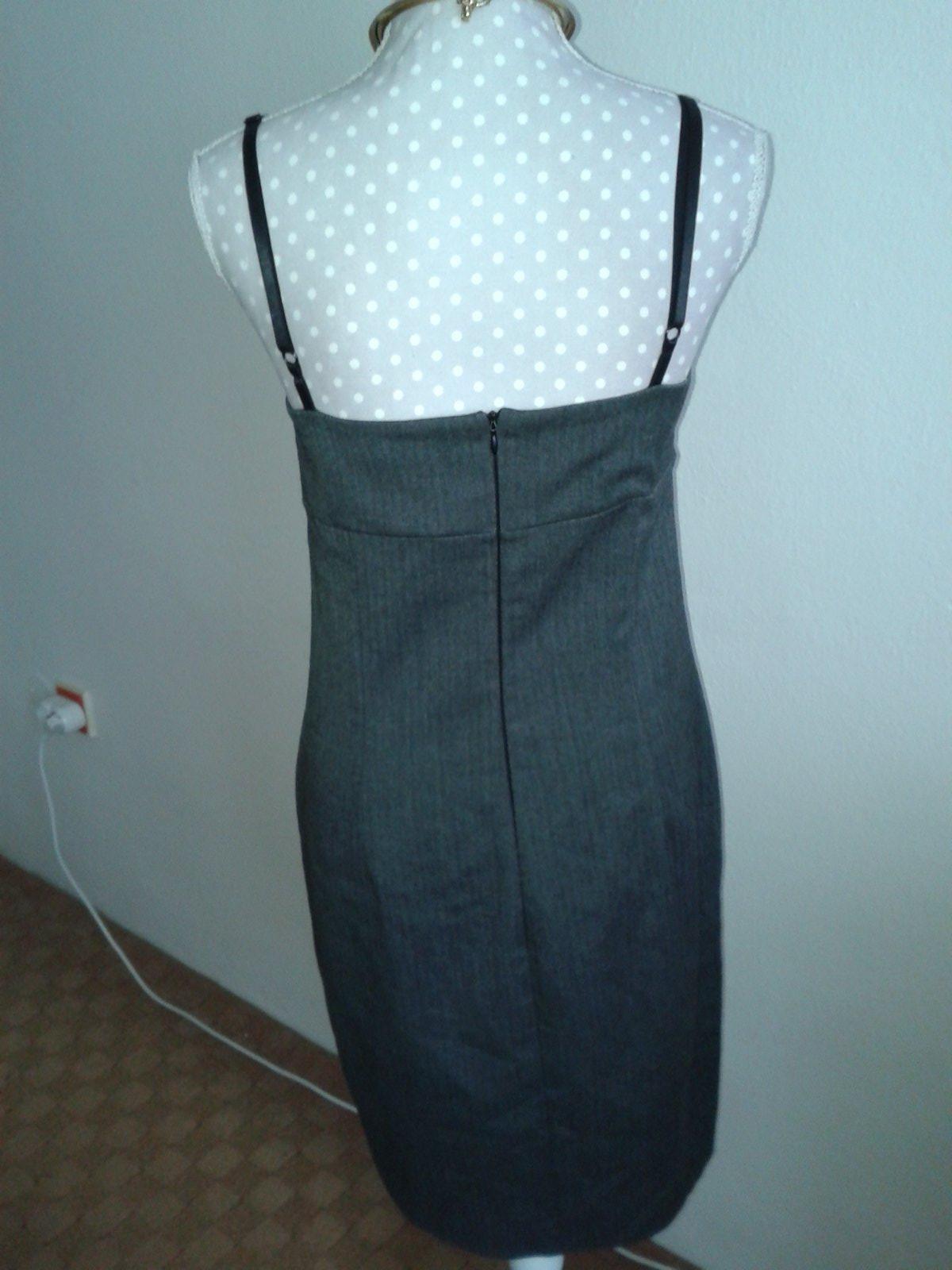 označ. XL, sedia na 38, kvalitná látka sivá s pásikmi, elastické posuvné ramienka s kamienkami, krásne riešená časť cez prsia, krásny ukážu sólo aj na bielu blúzku či roláčik....dlžka bez ramienok vpredu 82, vzadu 72, prsia 45x2, pás 39x2, boky 47x2.. len mierne elastické, nepodšité
