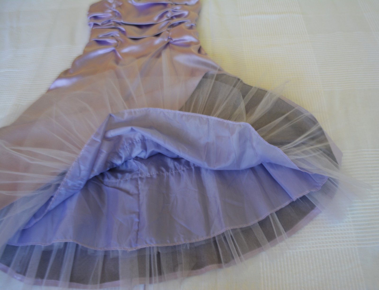 Zapínanie na boku na zips, celé sa prispôsobia šnurovaním na chrbte. Sukňa je široká, dole trojitá - podšitá tylom.