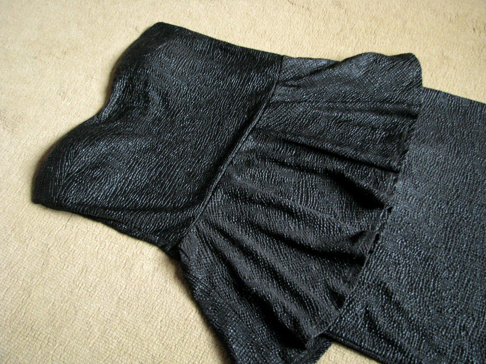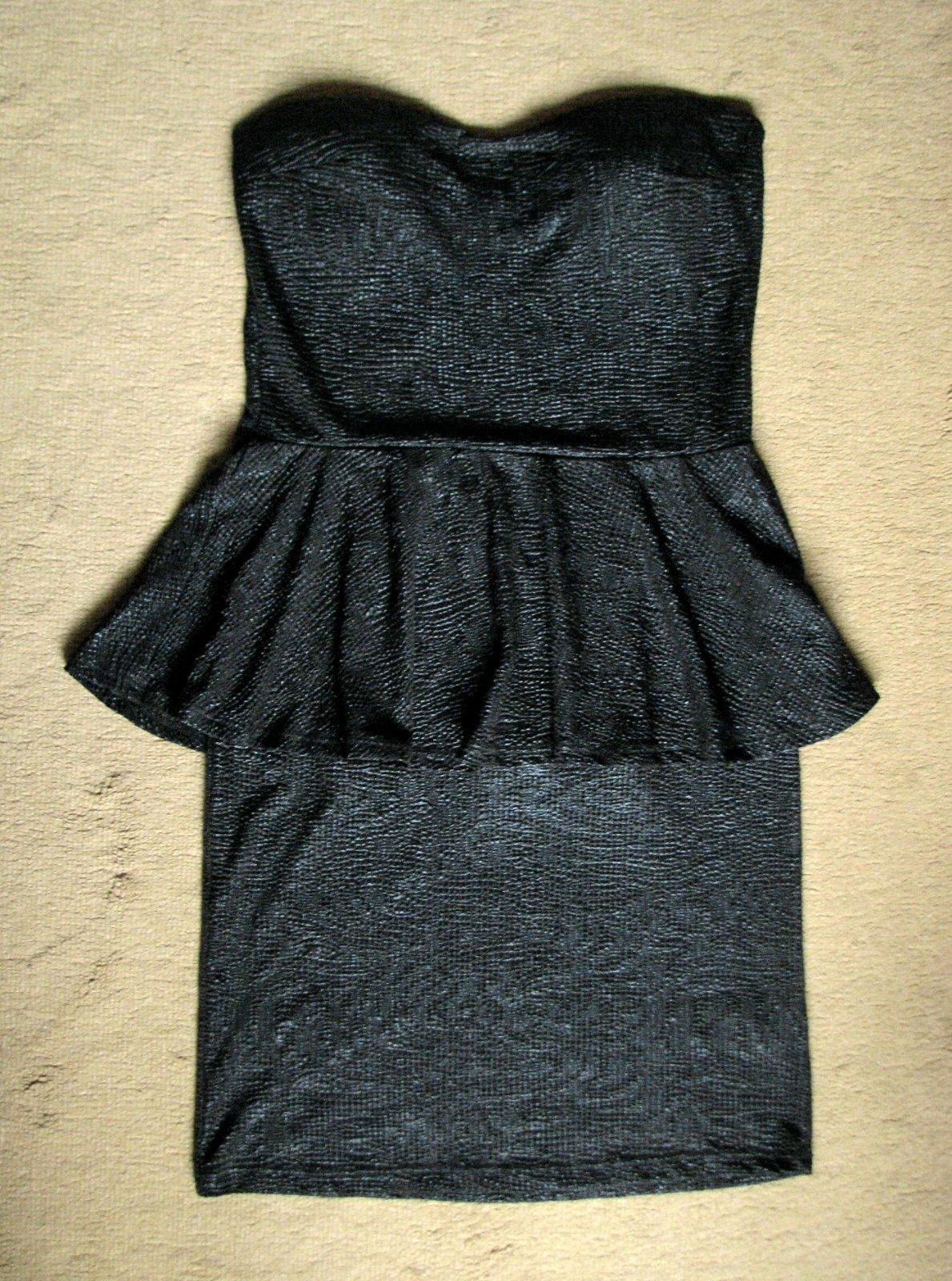 Krásne čierne šaty slušivého peplum strihu, bez ramienok. Materiál je elastický, mierne lesklý, pripomínajúci koženku (ale tenký a priedušný, nespotíte sa; je to látka, nie koženka). Na prsiach vystužené. Veľkosť asi M, v prípade záujmu premeriam. Výborne zachovalé, bez poškodení.